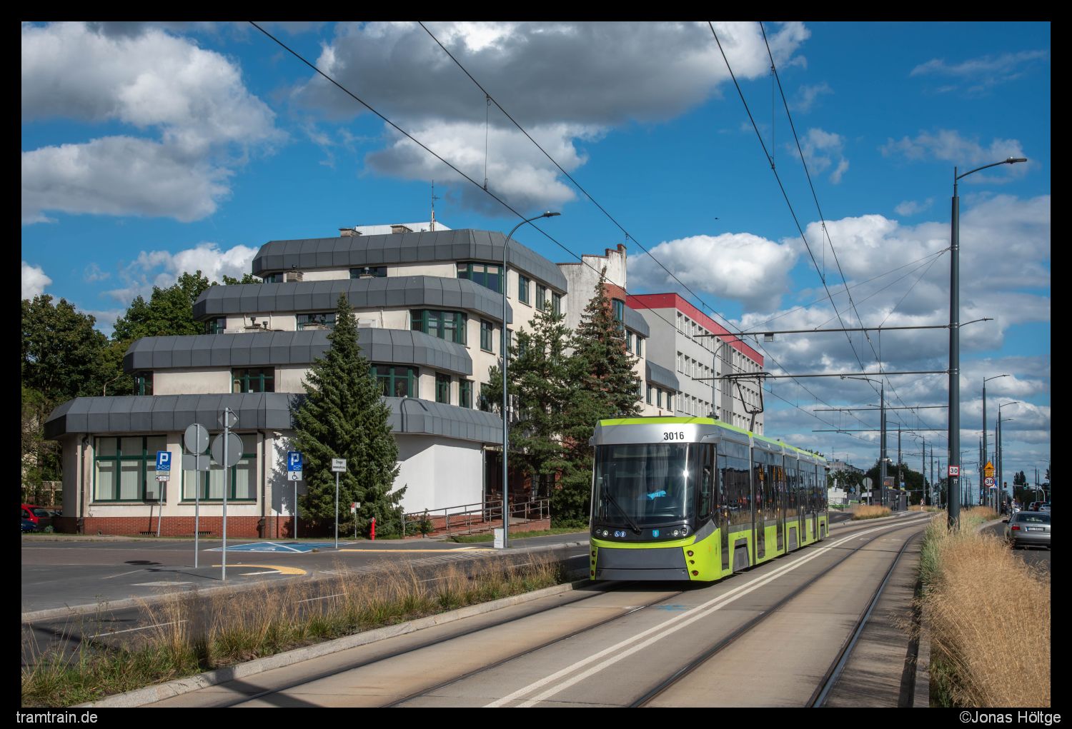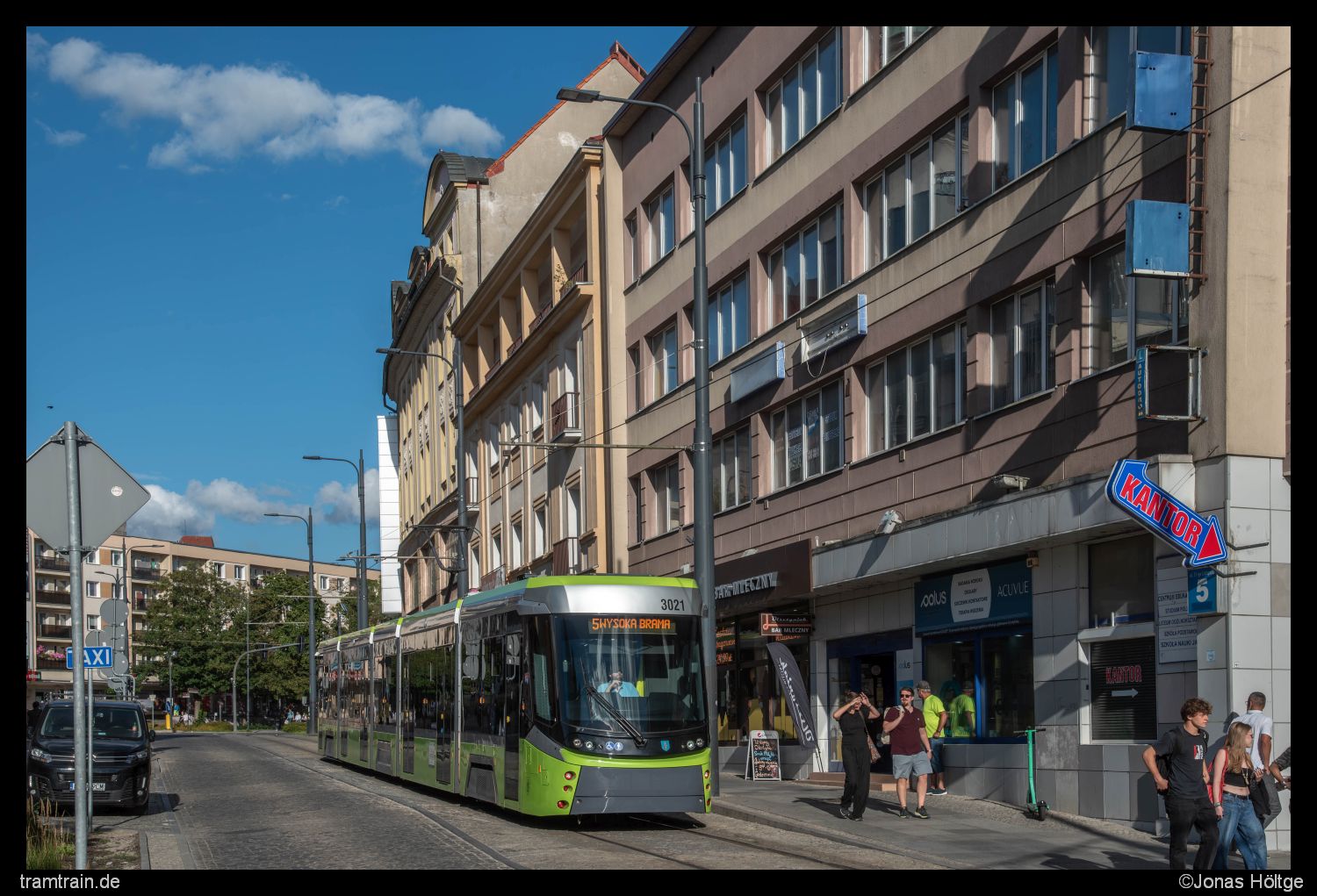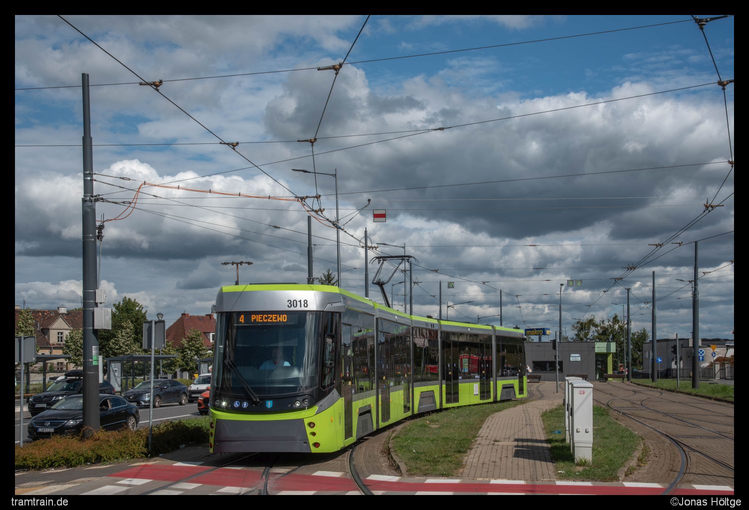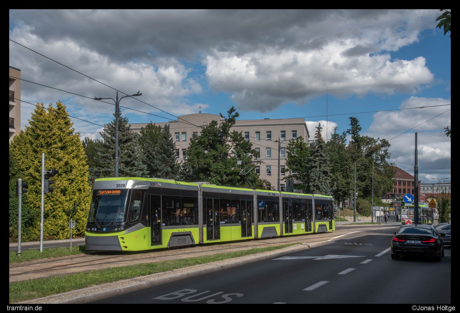 Zwischen der Station Gębika und der Endstation Pieczewo fuhren, noch deutlich häufiger als die beiden Straßenbahnlinien, jede Menge Buslinien parallel zur Straßenbahn. Dementsprechend nahm ich für den Weg zur letzten Station vor der Endstation, der gleichnamigen Station Pieczewo, den Bus. Kurz nachdem ich den Bus verlassen hatte, kam bereits Wagen 3025 von der Endstation zurückgefahren und mir gelang im Haltestellenbereich ein Nachschuss des Wagens.
