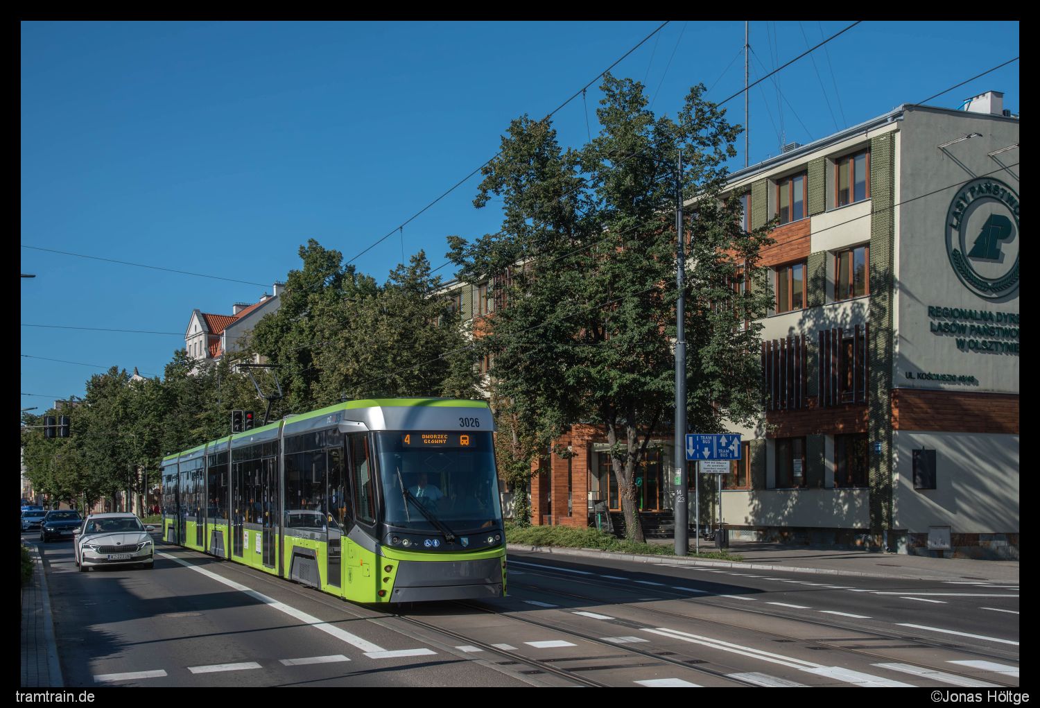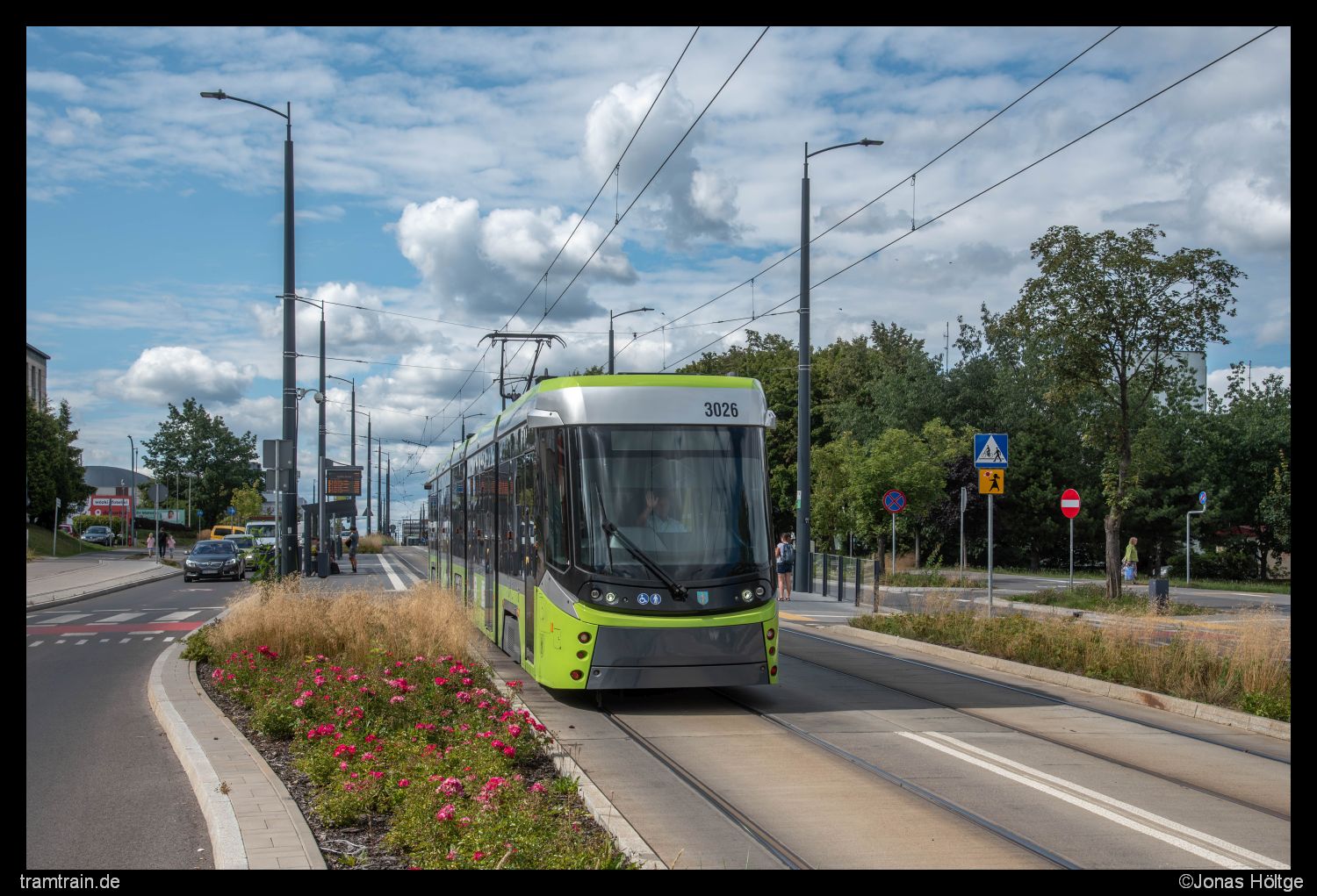 Wie schon im Hintergrund zu sehen ist, spielte bei der ersten Erkundung des Streckenastes bis zur Station Piłsudskiego die Sonne nicht so wirklich mit. Zudem gab die Strecke, abgesehen von einer Stelle, die ich mir für später merkte, auch nicht übermäßig viel her. An der Station Stadion Stomil hatte ich ein kleines Blumenbeet mit Rosen entdeckt, dass ich nun für ein Bild nutzte, um nicht völlig ohne Bild den Ast zu verlassen. Für Wagen 3026 kam sogar die Sonne ein wenig hinter den Wolken hervor.