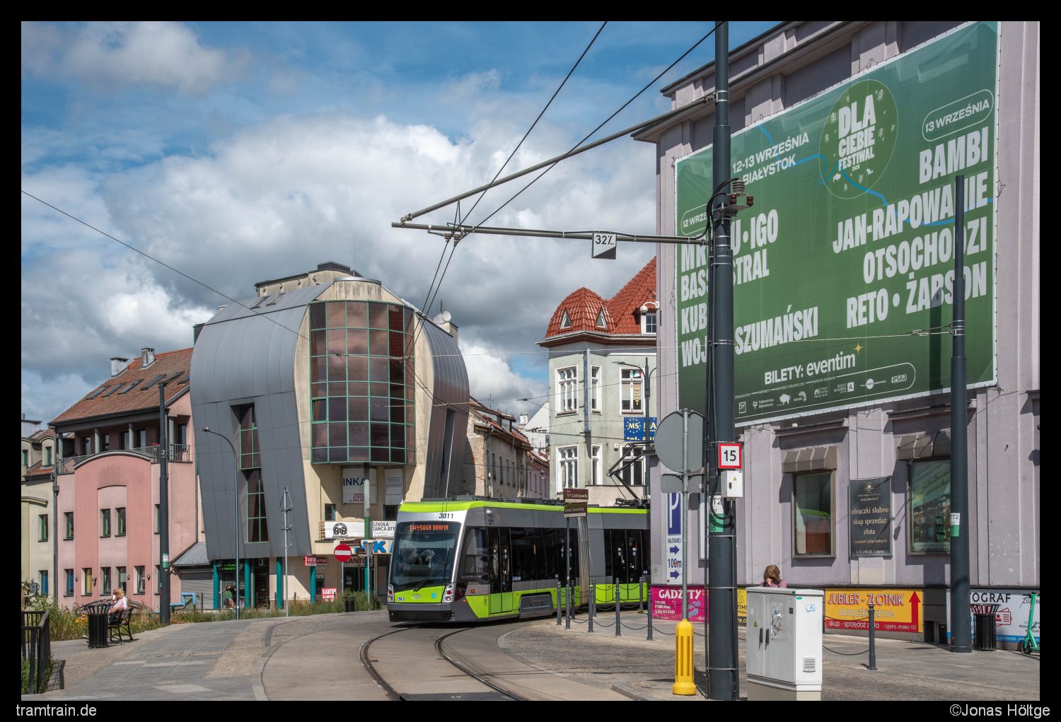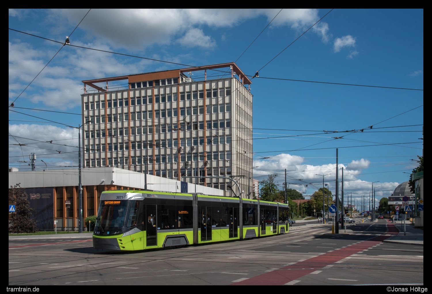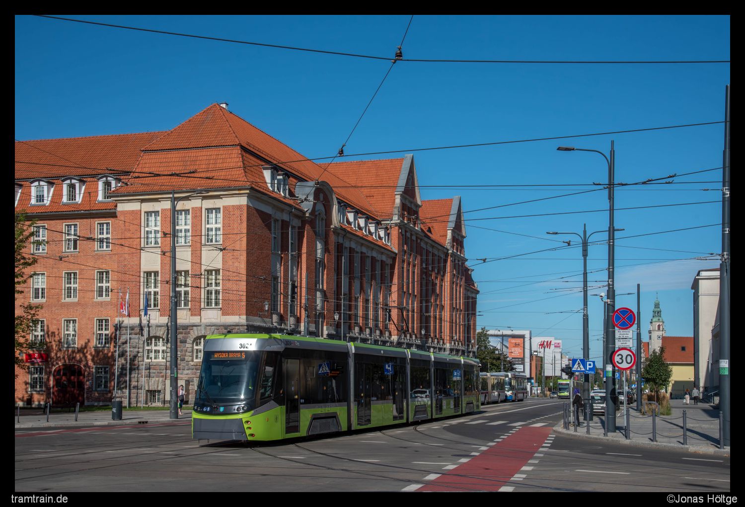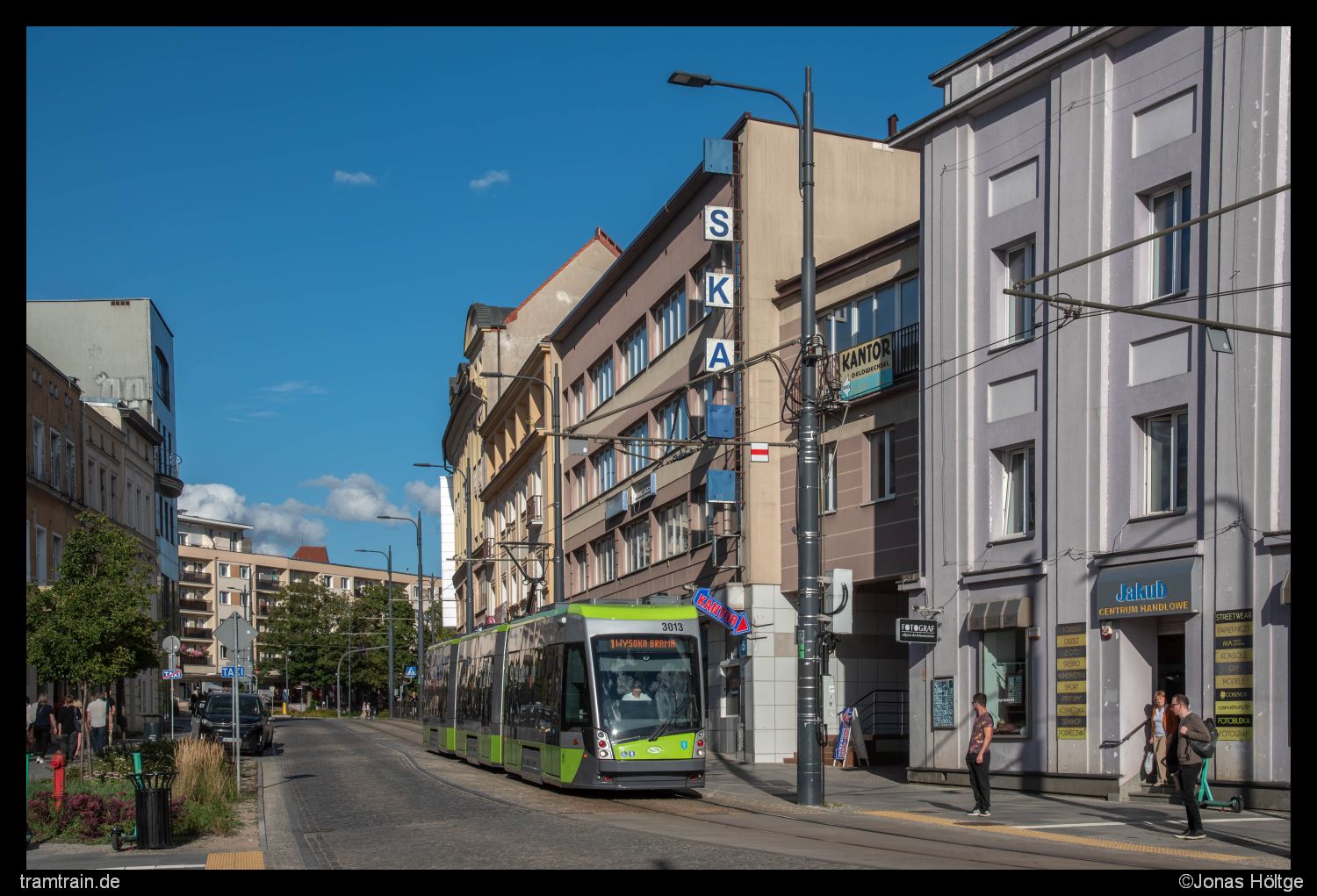 Auch die Direktion Filharmonia – Skwer Wakara wurde in einem Bild festgehalten. Mein Glück war es in diesem Fall, dass die Straßenbahnen bei diesem Weg über die Kreuzung leicht nach vorne versetzt die Phase gegenüber den Autos bekamen, wodurch ein Bild von Wagen 3006 ohne störende Autos möglich war. Inzwischen war der Großteil der Wolkenfront durchgezogen, sodass sich nur noch lockere Wolken am Himmel zeigten, die nun wieder seltener die Sonne störten.