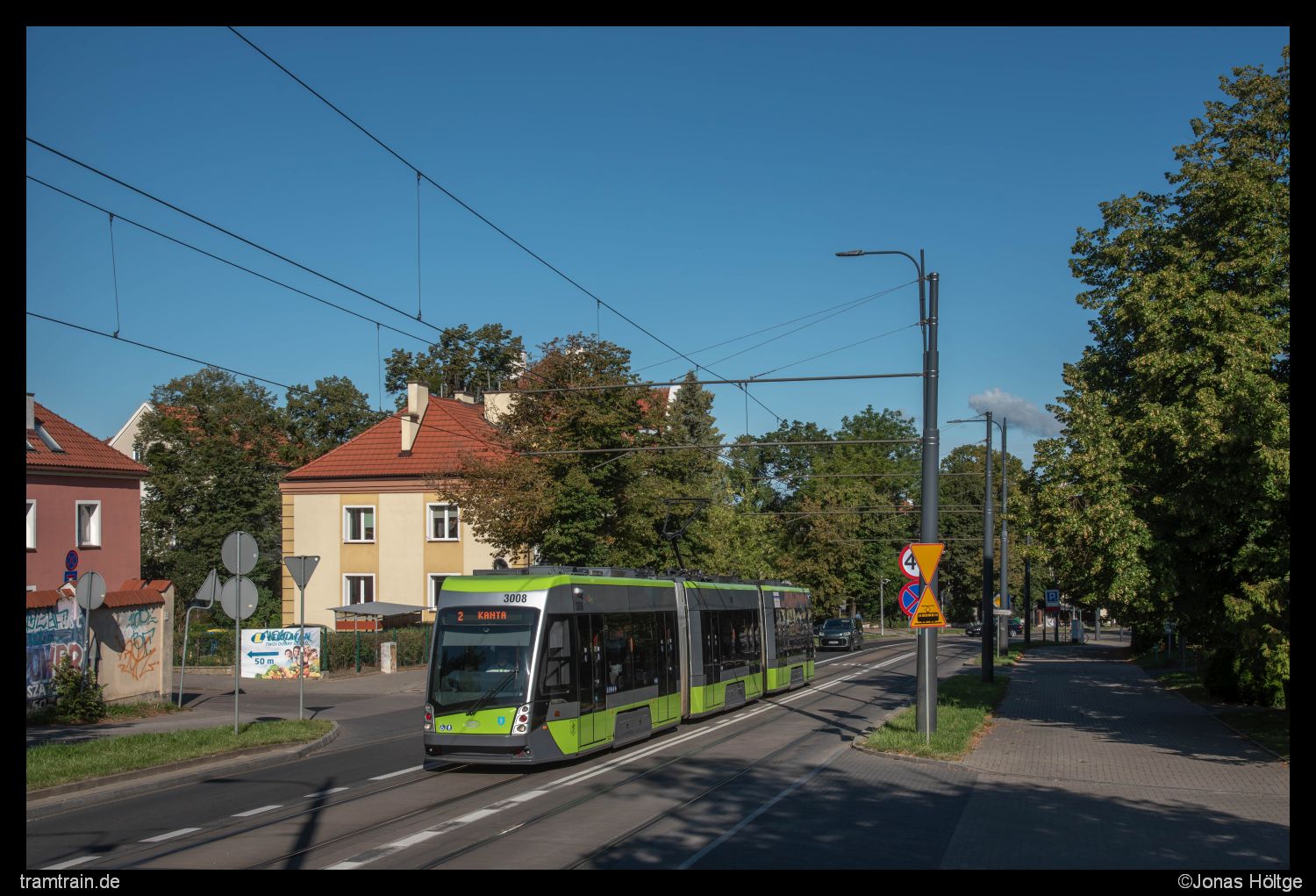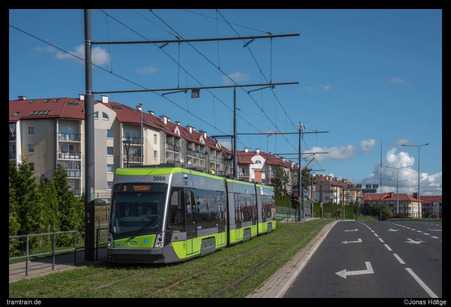 An der Station Płoskiego hatte ich das Stück Strecke entlang der Straße hinter mir gelassen. Hier knickte die Strecke nach links ab, überquerte die Straße und ging in der Folge zunächst bis zur Station Płoskiego auf einem Grünstreifen weiter. Das Bild am Grünstreifen wollte ich mir als willkommene Abwechslung nicht entgehen lassen. Einziges Problem war, dass ich das Bild nicht vom Fußweg aus machen konnte, sondern auf die Straße treten musste. Zum Glück war bei Ankunft des Wagens gerade gar nichts auf der Straße los, sodass ich Wagen 3006 ohne Probleme aufnehmen konnte.