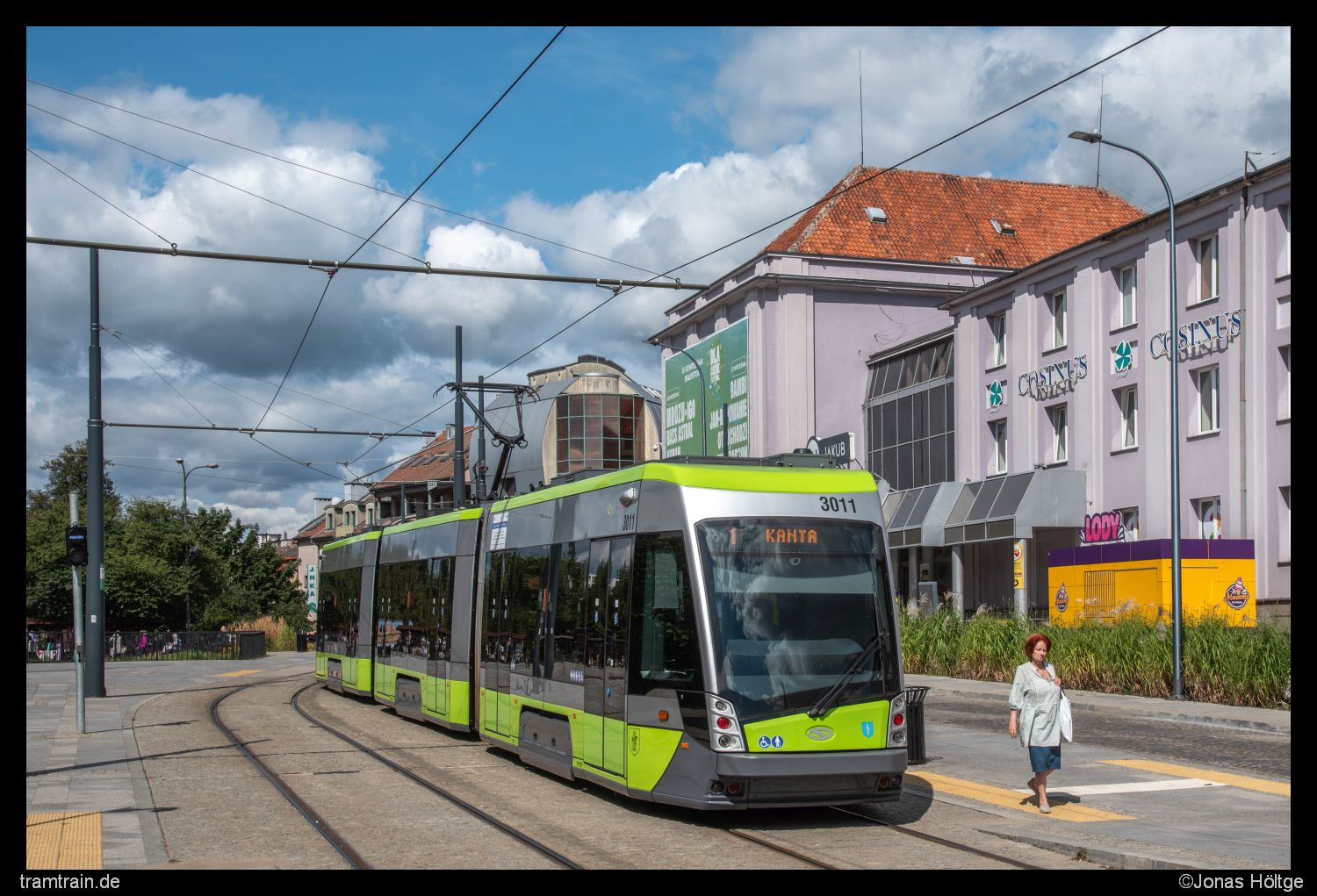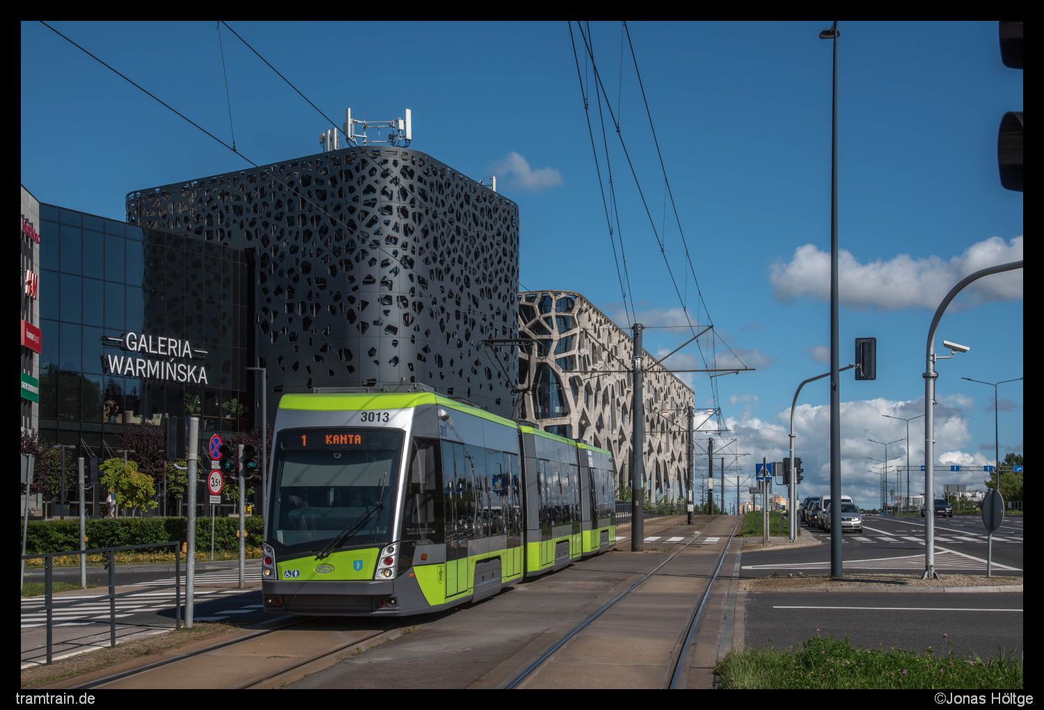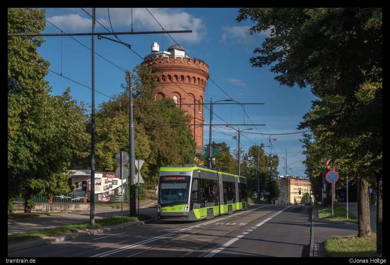 Inzwischen befand ich mich an der großen Kreuzung nahe der Station Skwer Wakara. Von mir aus gesehen nach rechts ging es zum Bahnhof, geradeaus noch zwei Stationen weiter ins Zentrum von Allenstein und nach links und hinten begannen die beiden langen Äste des Netzes, die nach Kanta bzw. Pieczewo führten. Wagen 3024 kehrte gerade von dem Ast nach Pieczewo zurück und bewegte sich auf die am Ende der Straße liegende Station Centrum zu.