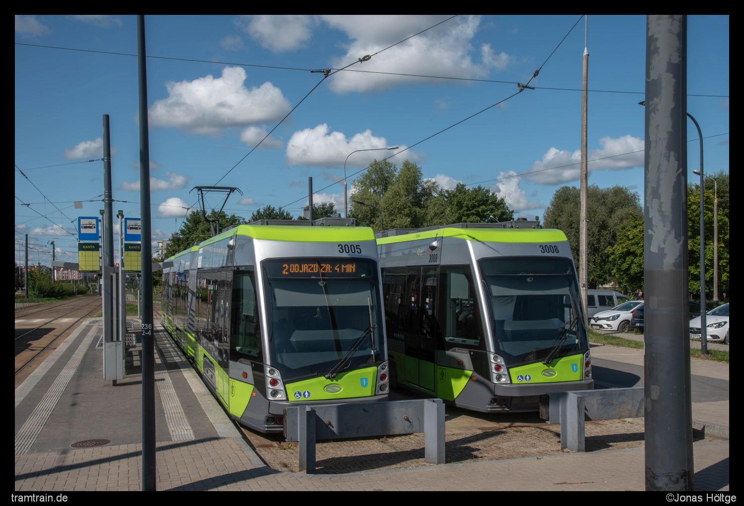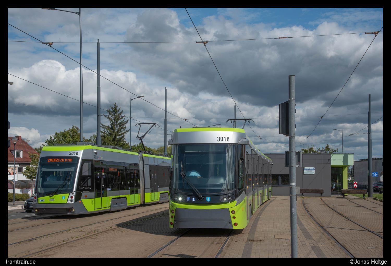 An der Station Dworzec Główny gelang mir endlich ein Bild von beiden Fahrzeugtypen direkt nebeneinander. Hier waren für die Pause der Fahrzeuge und als gleichzeitige Zufahrt zum Depot des Betriebes direkt fünf Gleise hinter der Endstation, auf denen sich die Wagen für die Pause aufstellten. In diesem Fall war es mit Wagen 3010 ein Kurs der Linie 2, während Wagen 3018 die Linie 4 bediente.
