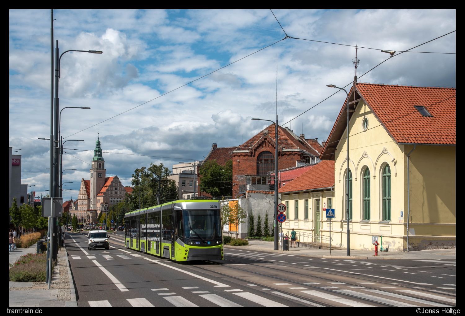 Während meiner längeren Essenspause tat sich die Sonne wieder schwerer, hinter den Wolken hervor zu kommen. Das Bild direkt hinter der Haltestelle Centrum, an der Stelle wo die Straßenbahnen auf die Phase warteten, um die Straßenkreuzung zu überqueren, wollte ich aber unbedingt noch in der Sonne umsetzen. Daher passte ich genau den richtigen Moment ab, an dem das Licht gerade da war und lichtete Wagen 3020 an dieser Stelle ab.