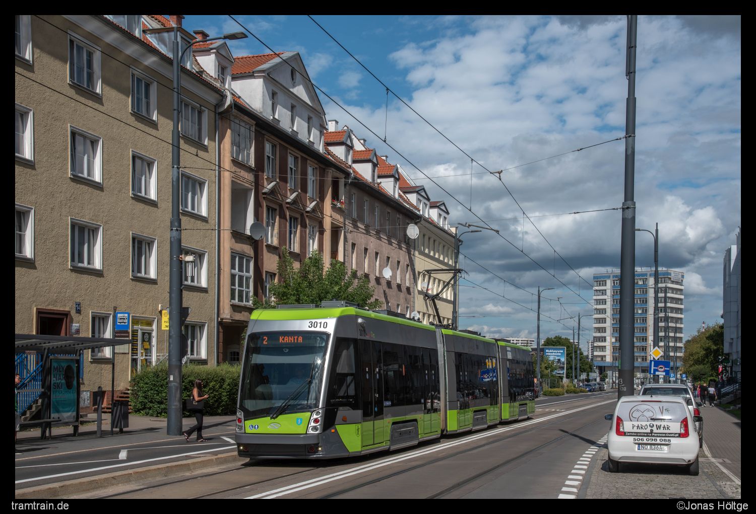 Ich hatte mich in den Wagen 3018 gesetzt, um zurück zur Kreuzung an der Station Planetarium zu fahren. Nur eine Station nach Fahrtbeginn verließ ich die Bahn jedoch wieder, da sich hier ein weiteres Motiv ergeben hatte und das Licht genau richtig stand. An der Station Kętrzyńskiego ergab sich mal so etwas wie Innenstadtkulisse durch die Häuserfassade, was sonst im gesamten Betrieb eher schwierig zu finden war. Nachdem ein Kurs der Linie 3 an der Station nicht funktioniert hatte, klappte es mit dem kurz darauffolgenden Wagen 3010 als Linie 2.