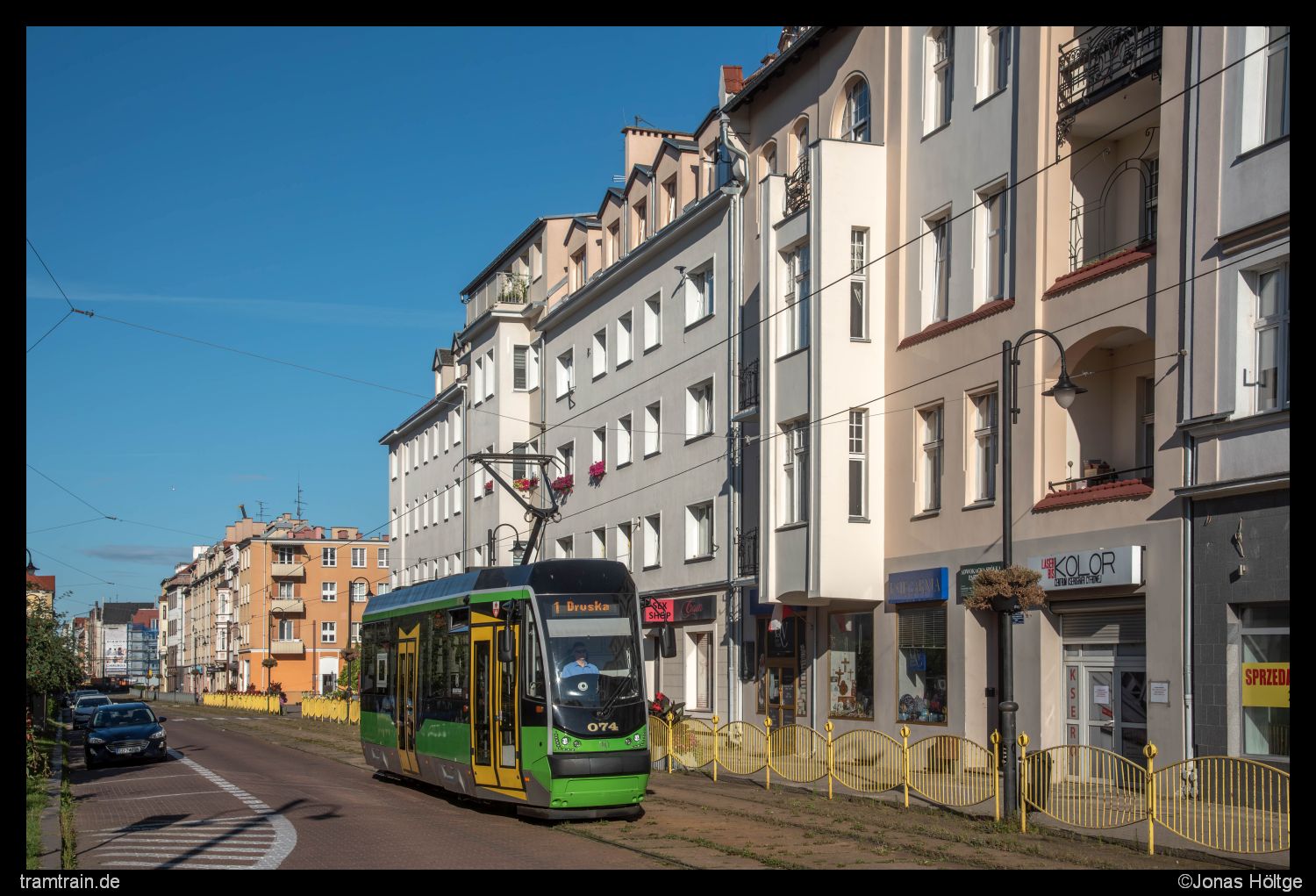 Direkt als erster Wagen kam eines der neu von Modertrans beschafften Fahrzeuge angefahren. Die lange gerade zwischen den Stationen 1-go Maja – Sąd und Plac Słowiański war perfekt im Licht, um direkt die ersten Fahrzeugbilder umzusetzen. Wagen 074 repräsentierte dabei die neueste Fahrzeugserie von Elbing.