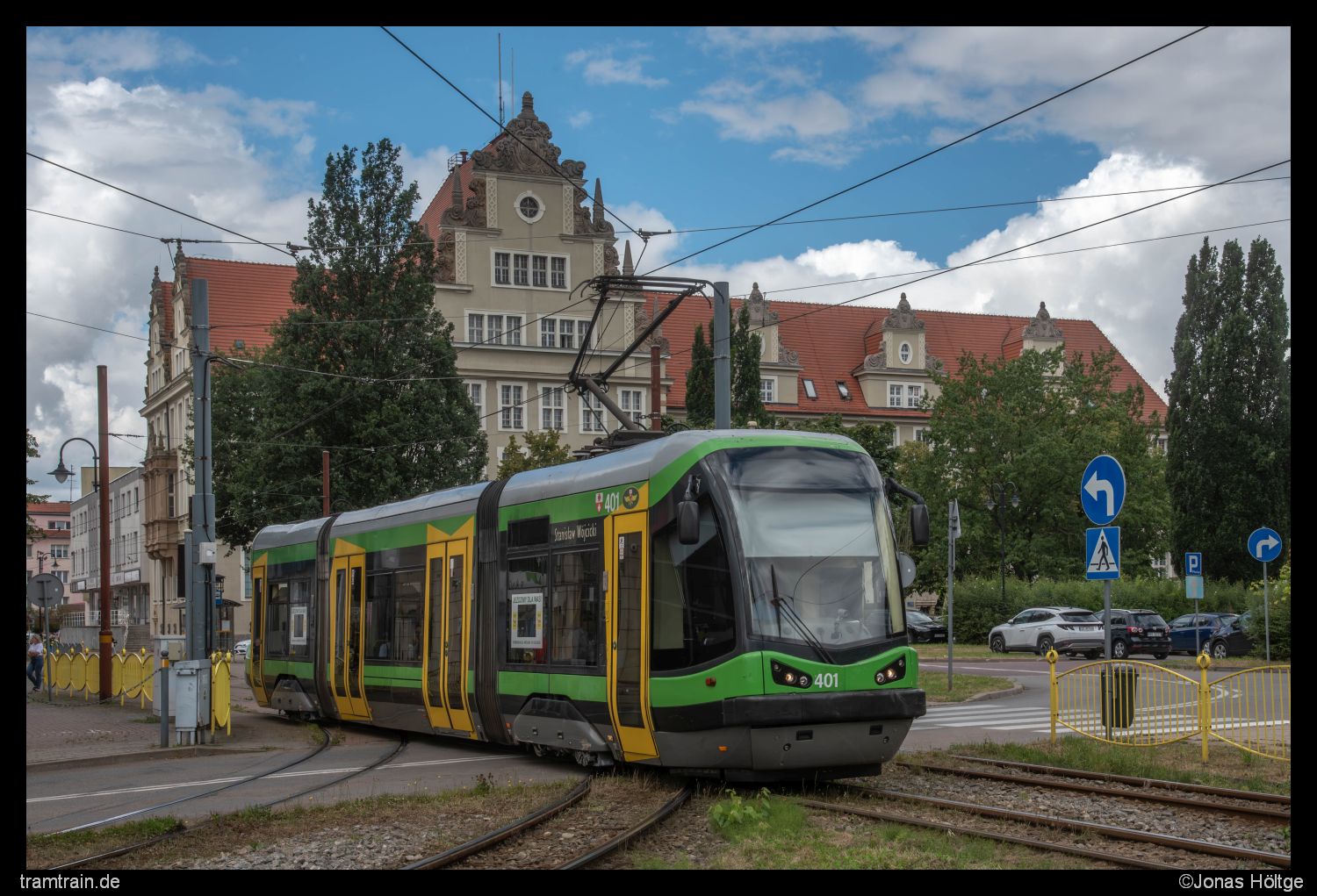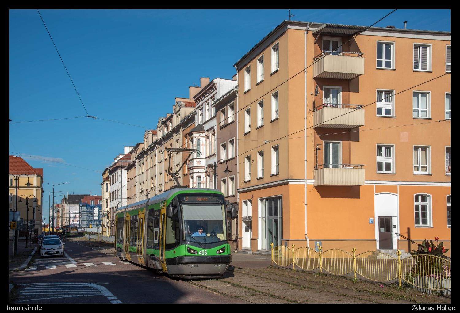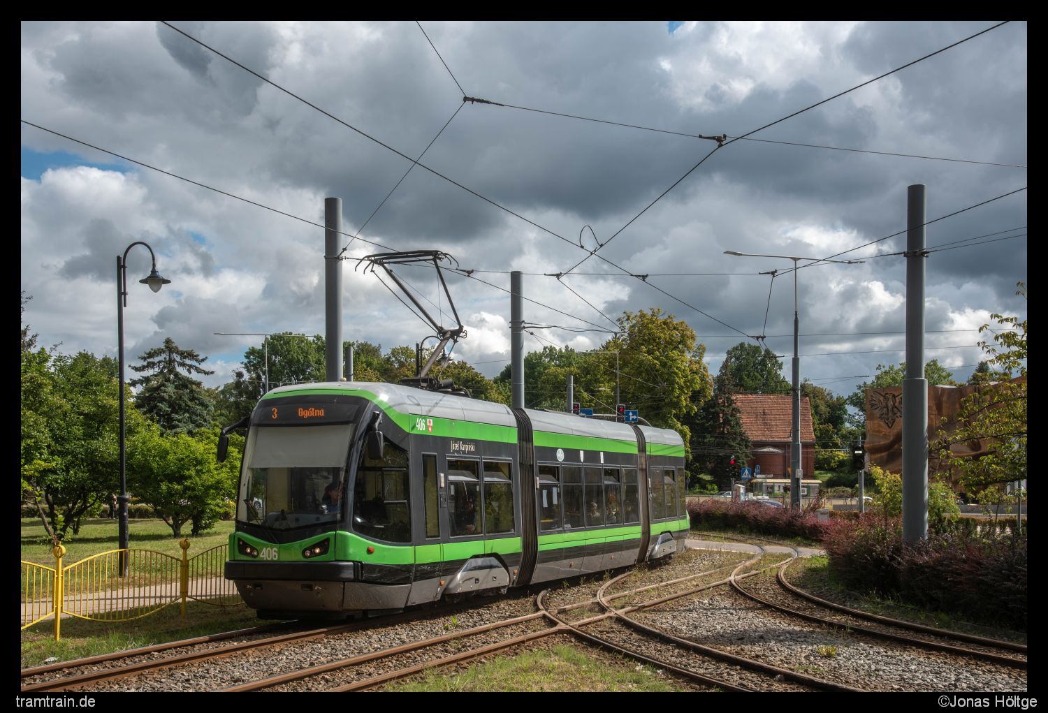 Ich hatte mich ein paar Meter in Richtung der Station Plac Słowiański bewegt. Hier waren die Schatten zwar schon deutlich näher an der Strecke, für ein halbwegs sonniges Bild reichte es trotzdem noch. Auf der Linie 3 folgte direkt die zweite und damit auch schon letzte wirkliche Niederflurgeneration. Bei Pesa 406 handelte es sich um die einzige Fahrzeugserie mit 100%-Niederflureinstieg, da selbst die Fahrzeuge von Modertrans nicht 100% Niederflur zu bieten hatten.