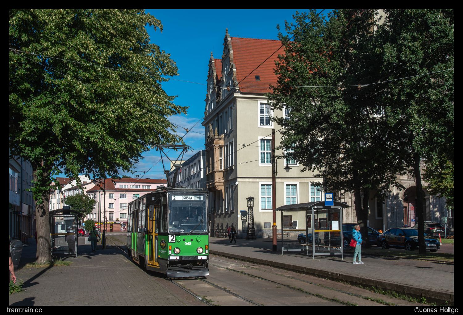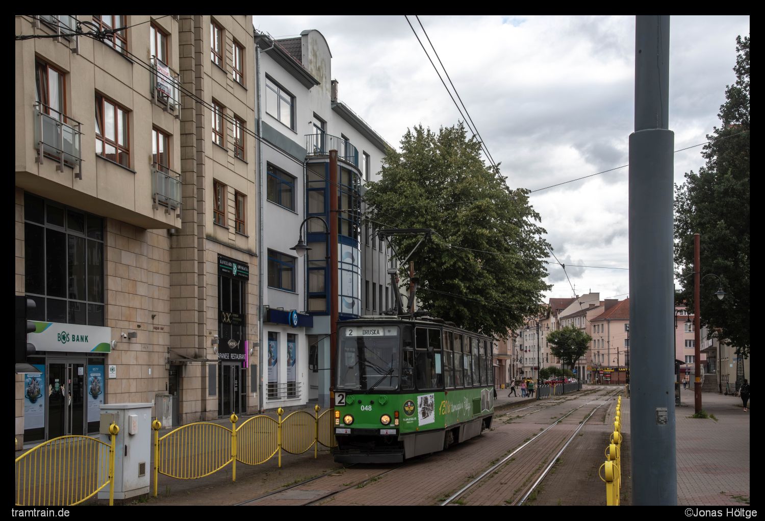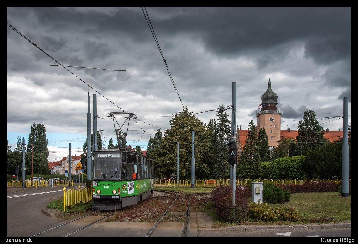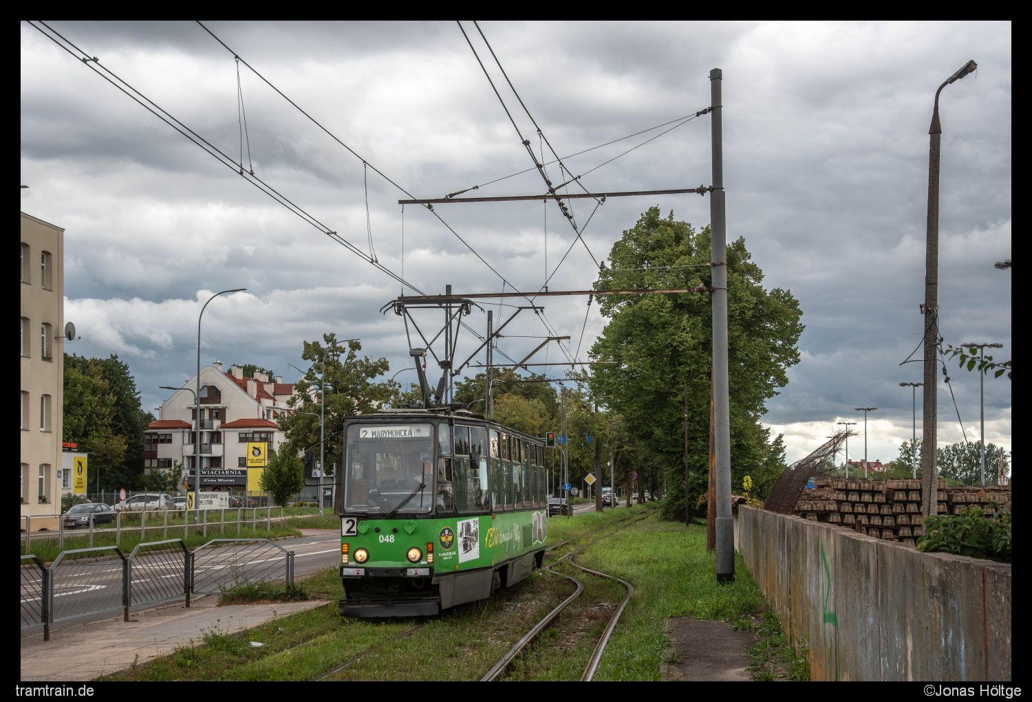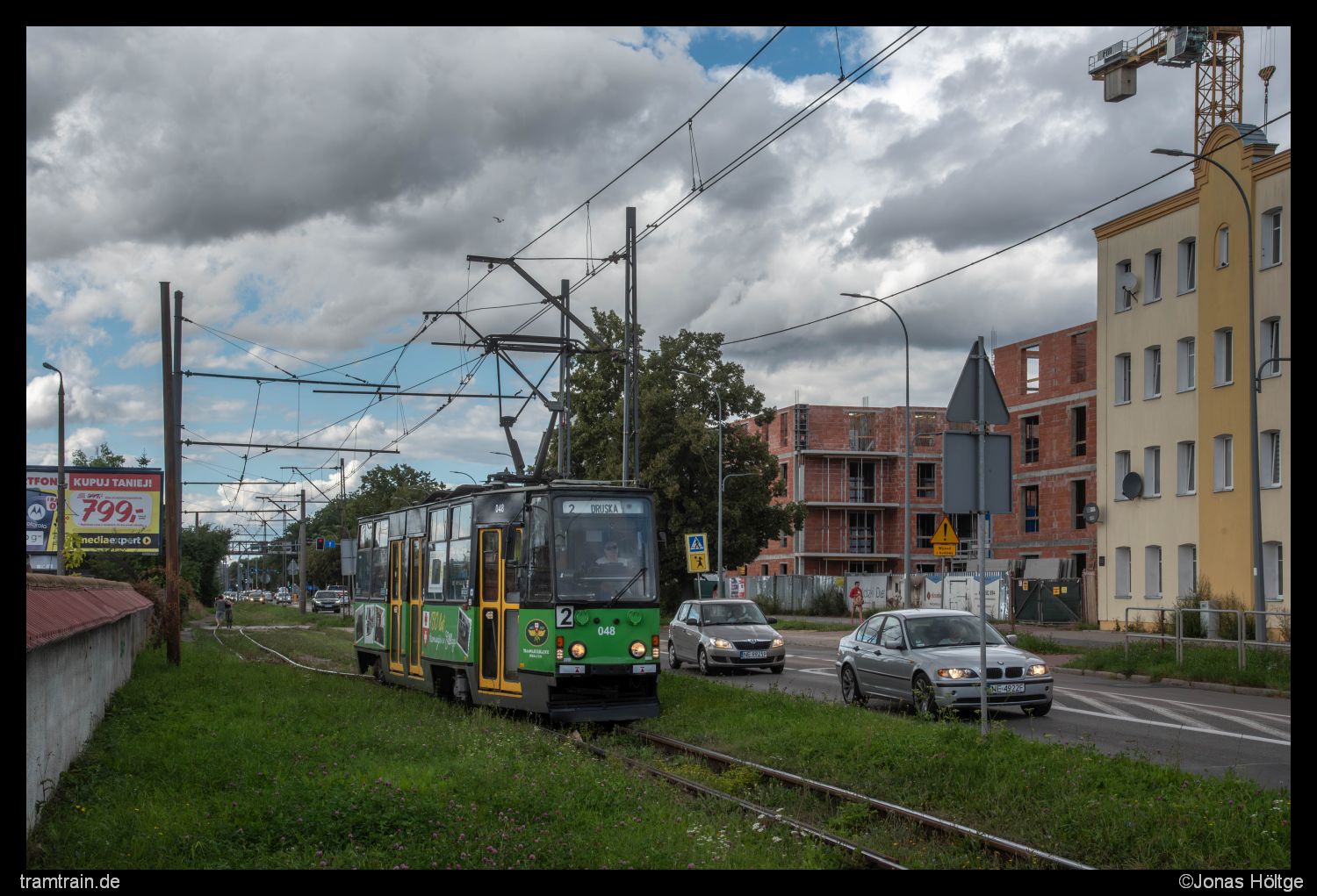 Nach dem doch eher enttäuschenden Ast der Linie 3 war ich schnell wieder am Ast nach Druska angekommen. Hier waren mit den Linie 1 und 2 zumindest zwei Linien unterwegs und die Linie 1 verkehrte zudem im dichteren Takt. Ich hatte mich mit der Bahn direkt eine Station weiter den Ast heraus bewegt, als ich es zuvor zu Fuß geschafft hatte und war an der Station Grunwaldzka (Sadowa) angekommen. Ab hier verlief die Strecke teilweise bis zur Endstation nur eingleisig und die zweigleisig ausgebauten Stationen wurden als Kreuzungsmöglichkeit genutzt. Wieder einmal war es Konstal 048, der mir vor die Kamera fuhr.