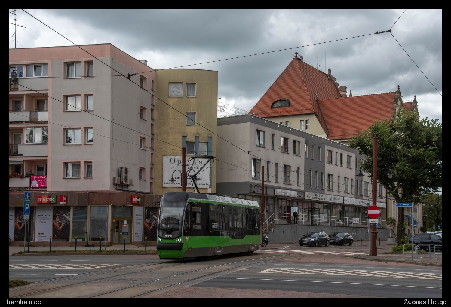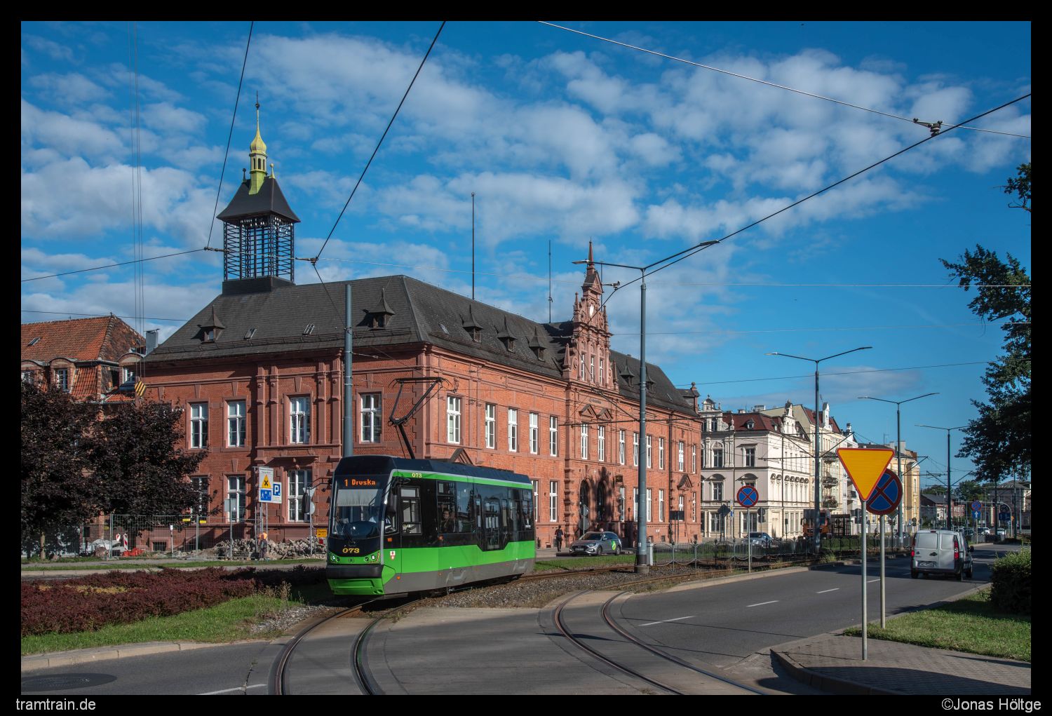 Weiterhin auf der Suche nach einem Ticketautomaten war ich inzwischen zurück an der Station Plac Słowiański angekommen. Bevor ich mich mit dem gefundenen Ticketautomaten beschäftigen wollte, gelang mir zunächst ein Bild von Wagen 073, kurz bevor dieser die Straße kreuzte und aus dem Licht gefahren wäre. Bei dem repräsentativen Gebäude im Hintergrund handelt es sich um das Postamt von Elbing.