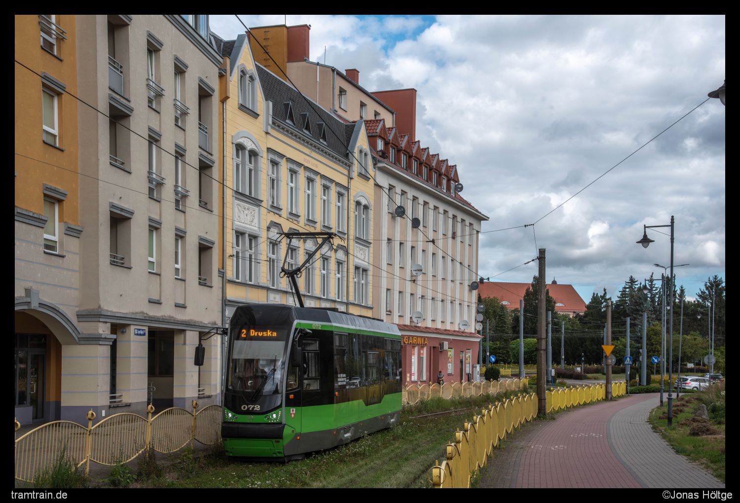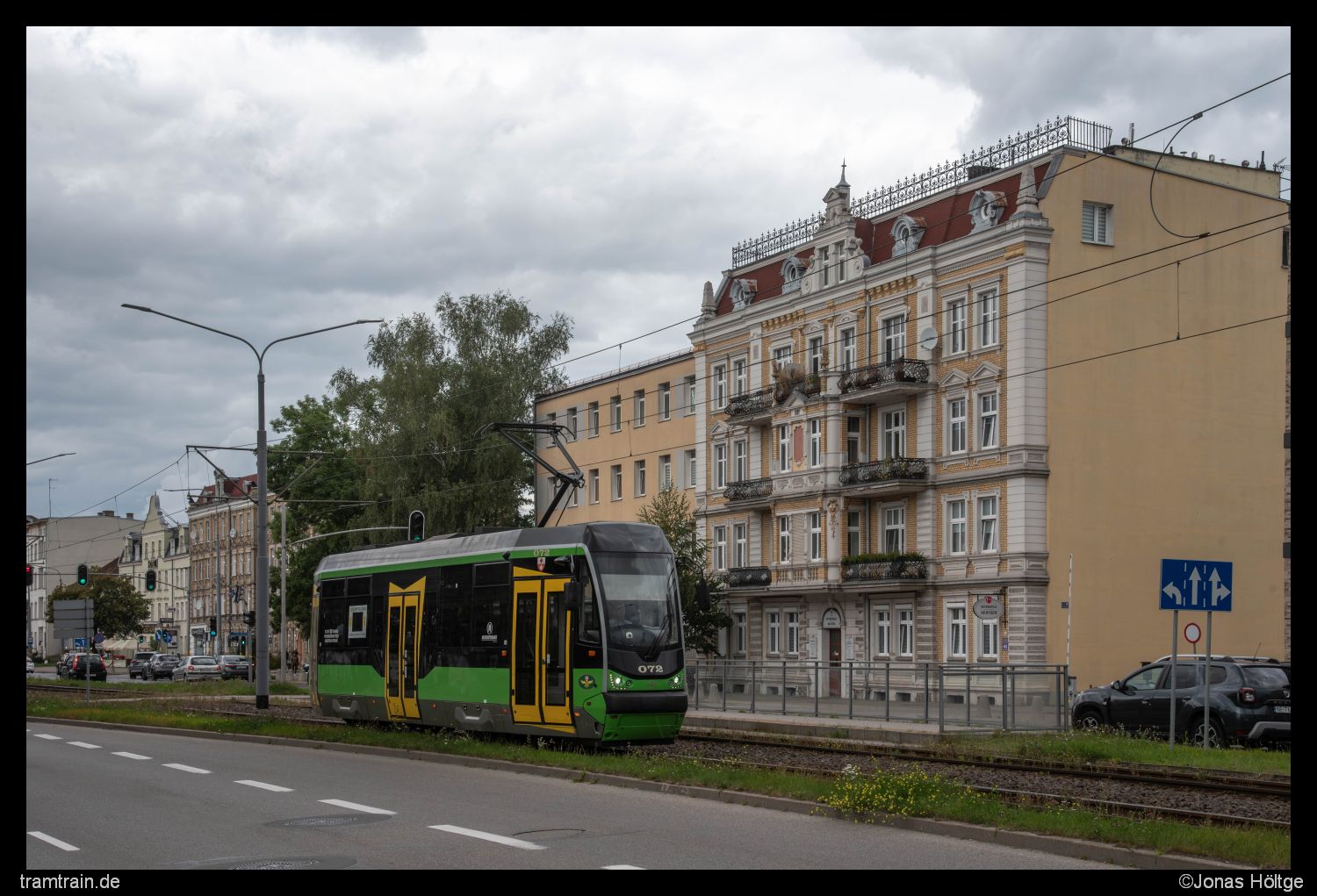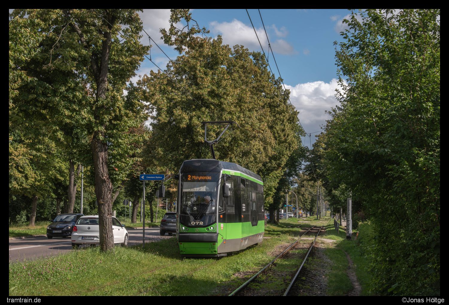 Irgendwie hatte ich gerade genau die Phase erwischt, in der die beiden nicht von Modertrans-Fahrzeugen bedienten Kurse auf den Linien 1 und 2 weg waren. Daher war es mit Wagen 072 nahe der Haltestelle Grunwaldzka (PWSZ) wieder eines der Fahrzeuge von Modertrans, welches sich in der kleinen Sonnenlücke zwischen den Baumschatten präsentierte. Zumindest schien immer noch die Sonne und die Strecke war hier auch relativ hübsch.