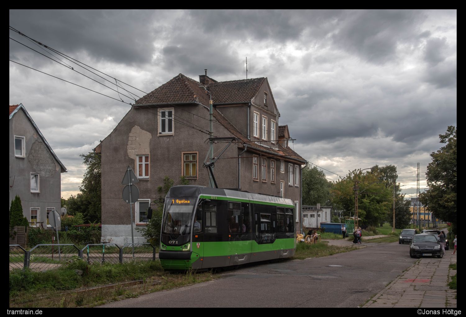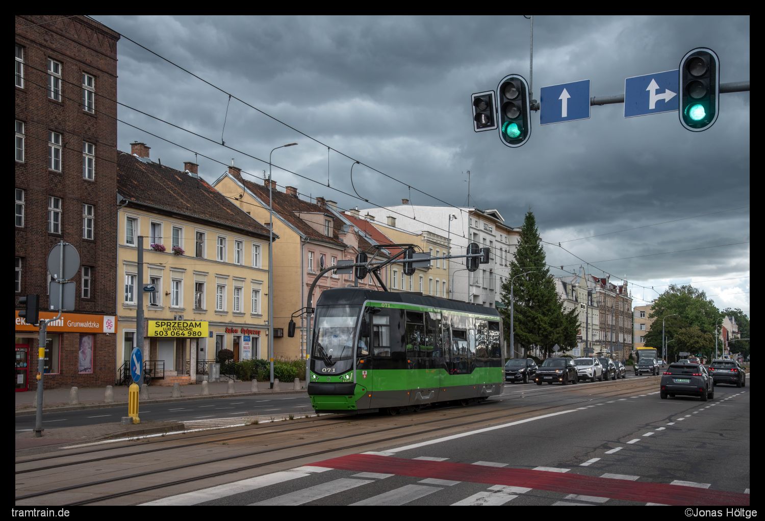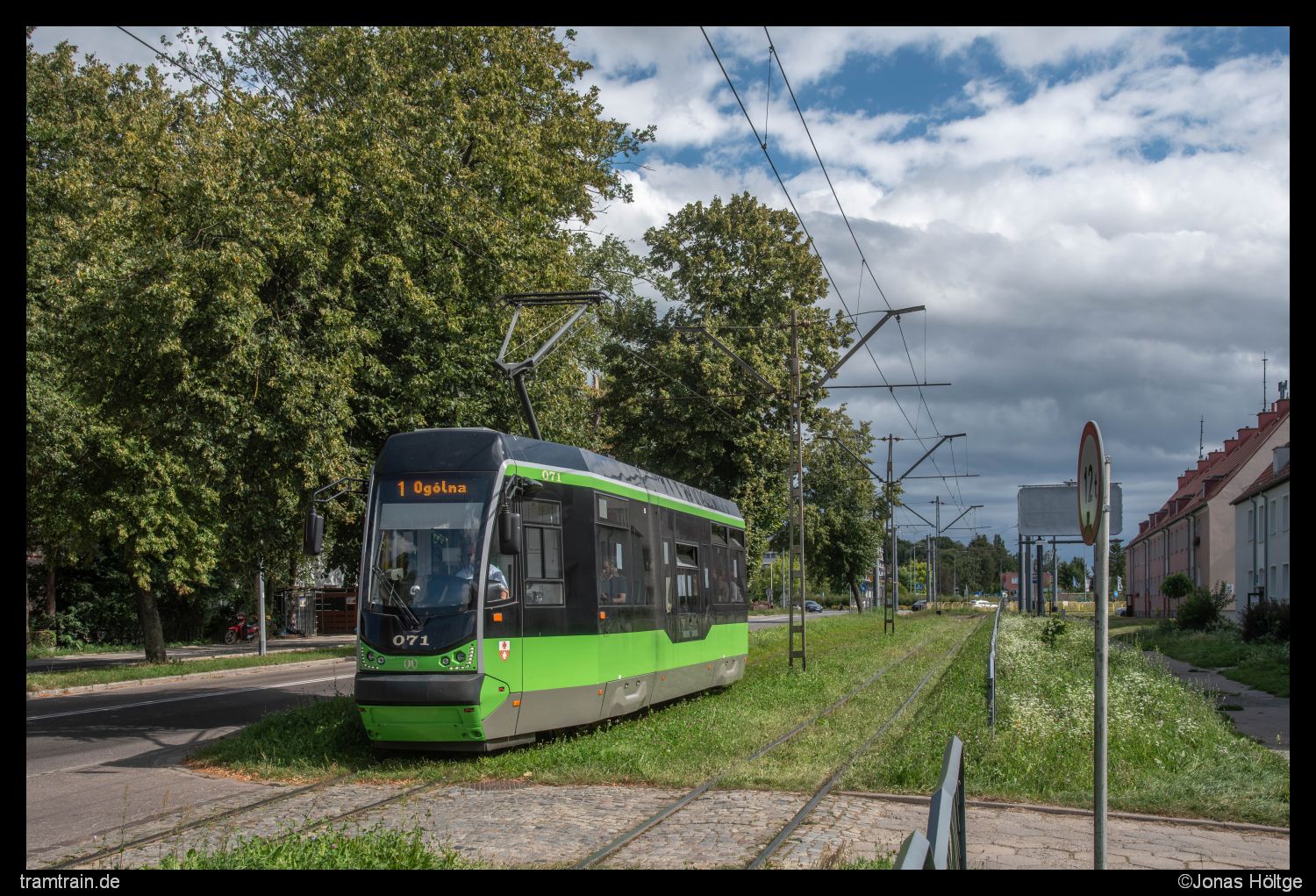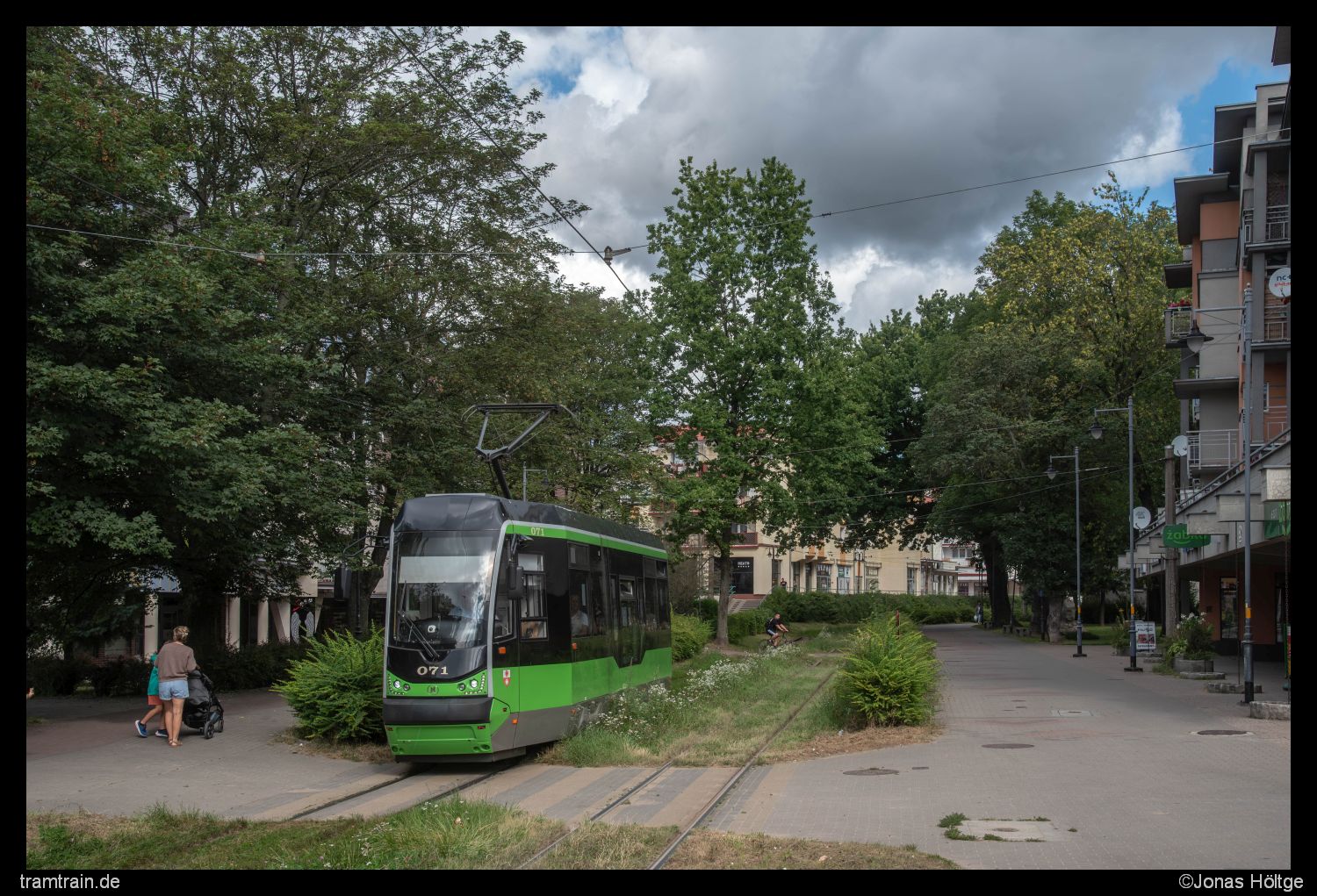 Wagen 071 hatte es nach über 40 Minuten von der Endstation zurückgeschafft. Bei der kurzen Strecke bis Endstation war das schon eine erstaunlich lange Zeit und ließ darauf schließen, dass an der Endstation etwas länger Pause gemacht wurde. Hier befand sich der Wagen auf einem kurzen Streckenabschnitt nahe der Station Dworzec, auf dem die Straßenbahn in der Mitte einer viel befahrenen Straße verkehrte, die zumindest etwas an Stadtkulisse durch die am Rand stehende Häuserfassade zu bieten hatte. Abgesehen davon war dieser Teil der Strecke nicht wirklich fotogen.