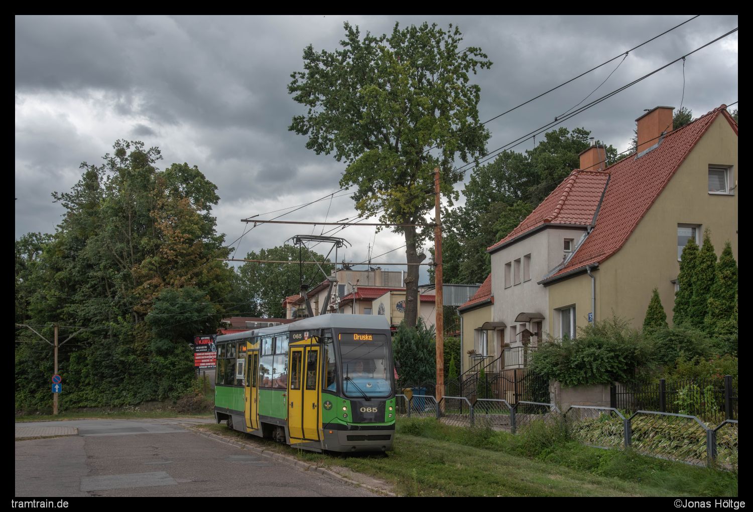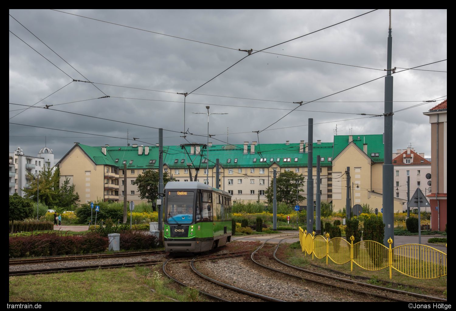 Aus der anderen Richtung folgte direkt im Gegenzug der letzte zuvor noch nicht im Bild untergebrachte Wagentyp, der heute unterwegs war. In den Jahren 2016 und 2019 wurden jeweils zwei umgebaute Konstal 805Na, nun als Konstal 805N-EN, aus Lodz für den kleinen Betrieb von Elbing beschafft. Während die ersten beiden Fahrzeuge von 2016 abgesehen von einer neuen Front noch relativ original waren, wurden die Fahrzeuge von 2019 einmal kernsaniert und neben einer neuen Front auch mit neuen Türen und Fenstern ausgestattet. Bei Wagen 065 handelte es sich um eines der beiden Fahrzeuge von 2019, das heute auf der Linie 1 unterwegs war.