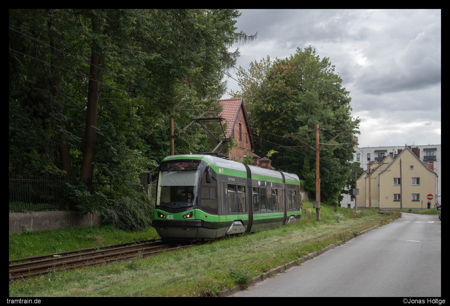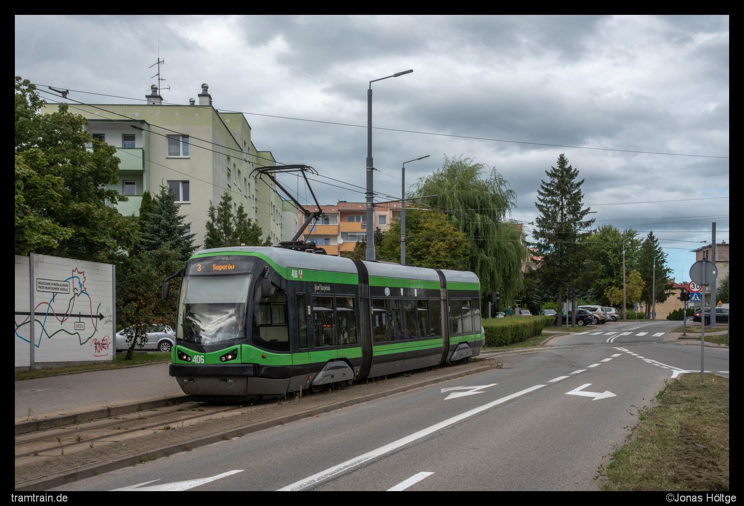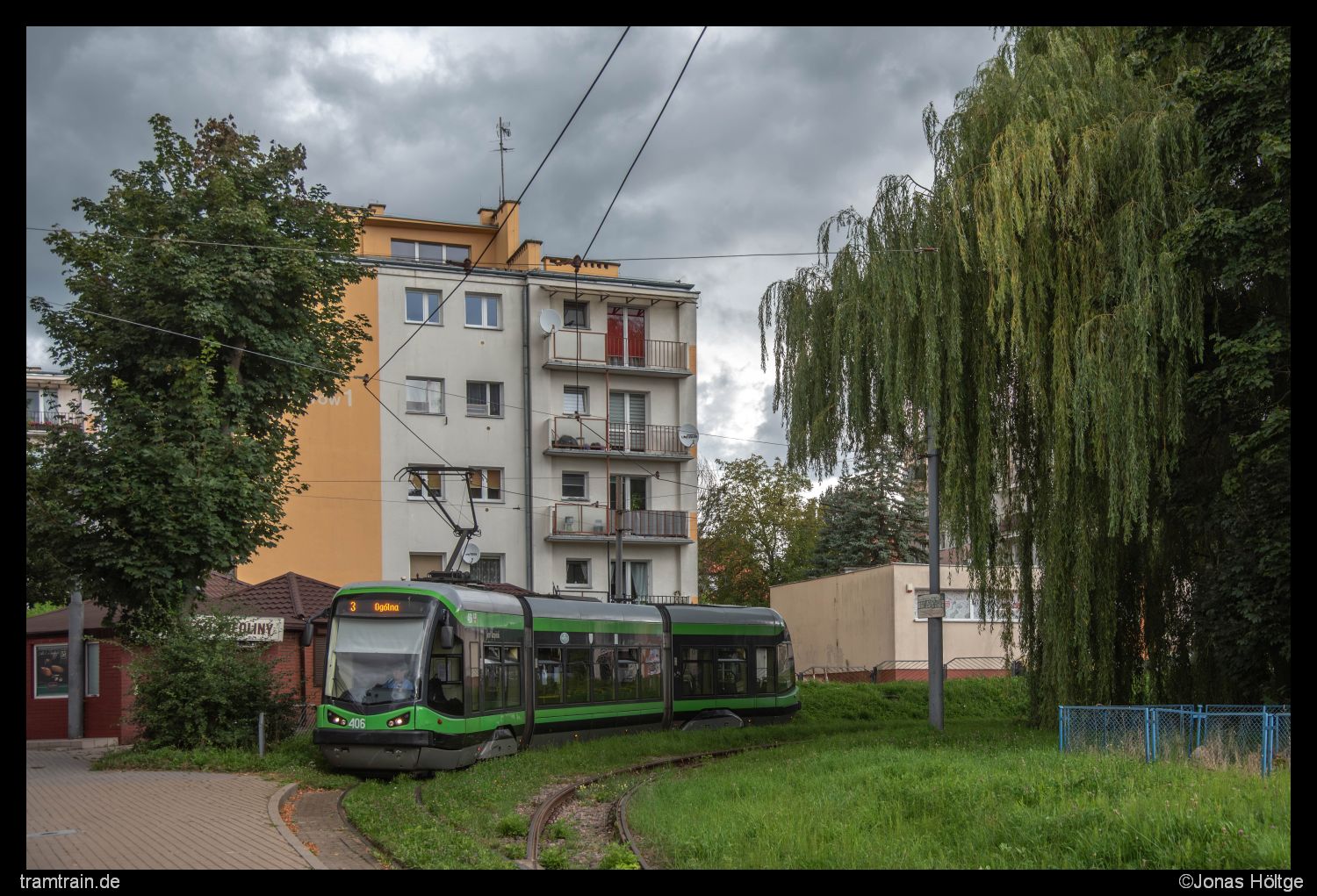 Der kurze Ast der Linie 3 von der Station 1-go Maja – Sąd bis zur Endstation Saperów verläuft größtenteils eingleisig entlang einer Straße und hatte nicht sonderlich viele Motive zu bieten. Daher entschied ich mich dazu, an der Strecke kein Bild zu machen und es bei einem Bild an der Endstation zu belassen. Dadurch musste ich mich auch nicht mit dem 30-Minuten-Takt herumschlagen und konnte direkt zurück zu dichter befahrenen Strecken des Netzes fahren. So entstand lediglich das Bild von Wagen 406 in der Schleife der Endstation Saperów.
