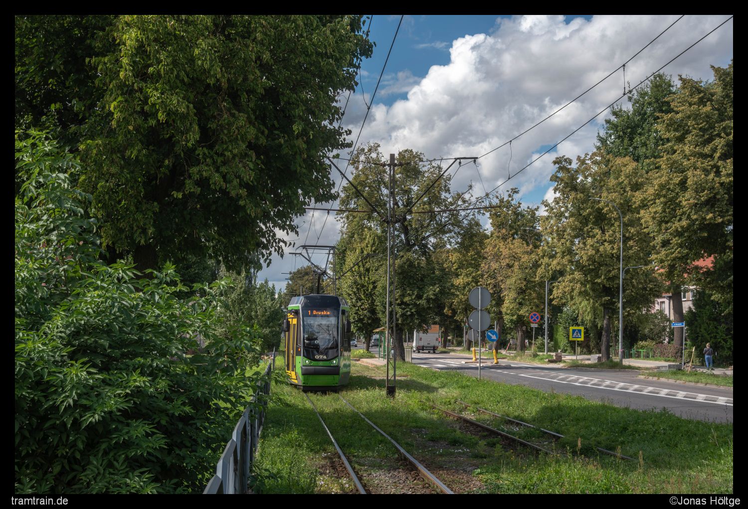 Nach diesen ersten Bildern wollte ich mich ein wenig von diesem Streckenabschnitt entfernen und das Netz genauer erkunden. Dafür benötigte ich zunächst eine Tageskarte. An der Station 1-go Maja – Sąd, an der ich einen Ticketautomaten vermutet hatte, wurde ich nicht fündig, daher ging es eine Station weiter zur Station Plac Słowiański, an der ich einen Ticketautomaten erblickte. Bevor ich mich mit diesem und dem Erwerb einer Tageskarte beschäftigen wollte, lichtete ich zunächst einen weiteren Wagen an der Station ab.