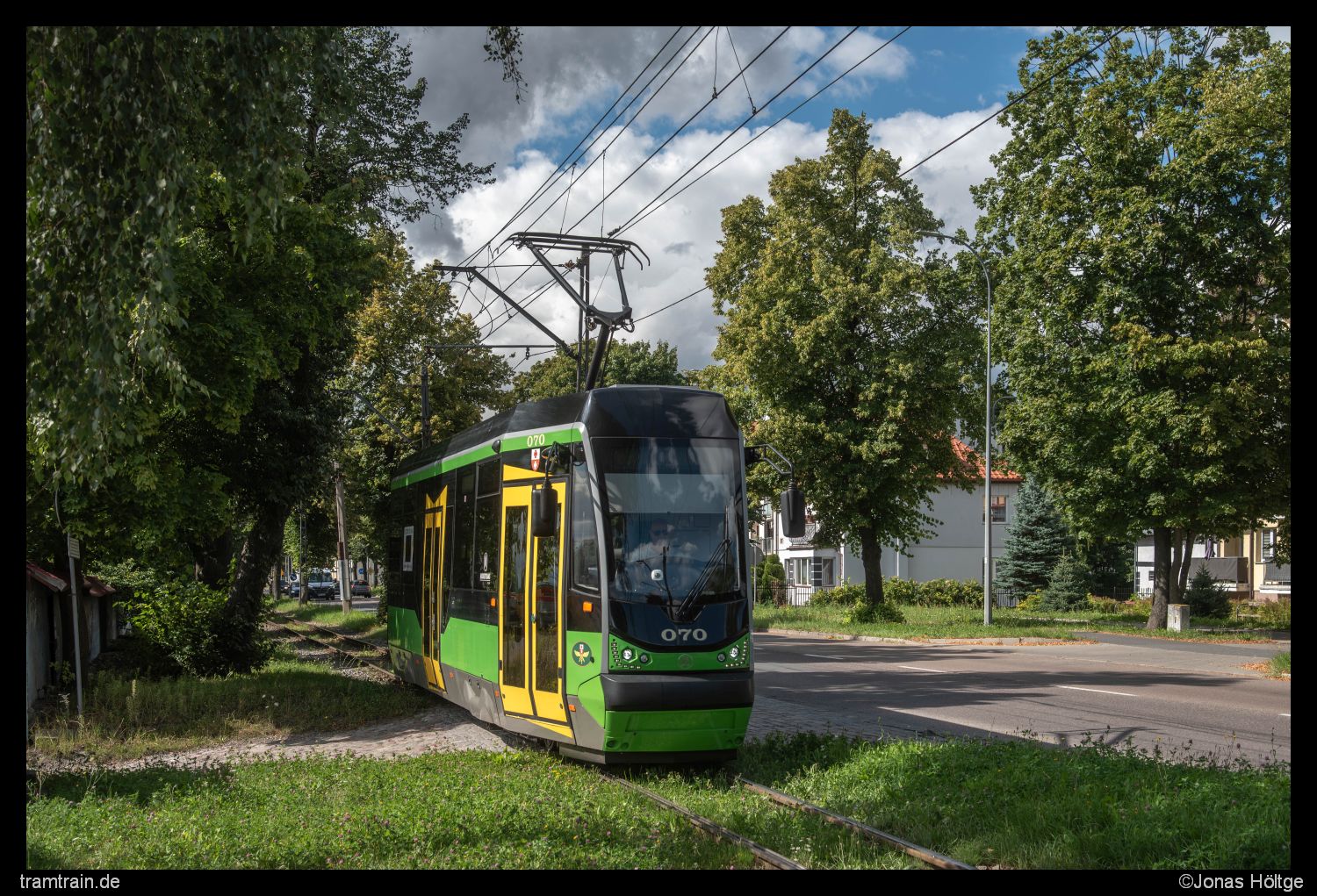 Inzwischen war ich am eingleisigen Stück der Strecke angekommen. Für den Wagen in Richtung der Endstation Druska hatte ich nicht wirklich ein sonniges Stück gefunden, an dem ich den Wagen gut hätte ablichten können. Zumindest teilweise war Wagen 070 jedoch in der Sonne, als ich ihn nahe der Station Grunwaldzka (Sadowa) aufnahm.
