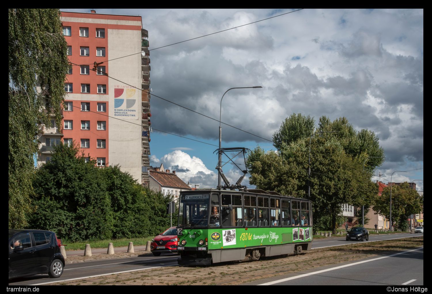 Ich hatte mich bis zur Station 1-go Maja – Sąd zurückbewegt, da ich hier einen Ticketautomaten vermutet hatte. Bei dieser Annahme wurde ich zwar enttäuscht, dafür stellte ich mit großer Freude fest, dass mindestens einer der originalen Konstal 805Na in Form von Wagen 048 unterwegs war. Der Wagen machte Werbung für 130 Jahre Straßenbahn in Elbing. Dieses Jubiläum schien wohl in diesem Jahr zu sein, worauf der Wagen hinwies. Ich schoss etwas notdürftig ein Bild an der Station, um zumindest ein erstes Sonnenbild des Wagens geschossen zu haben.