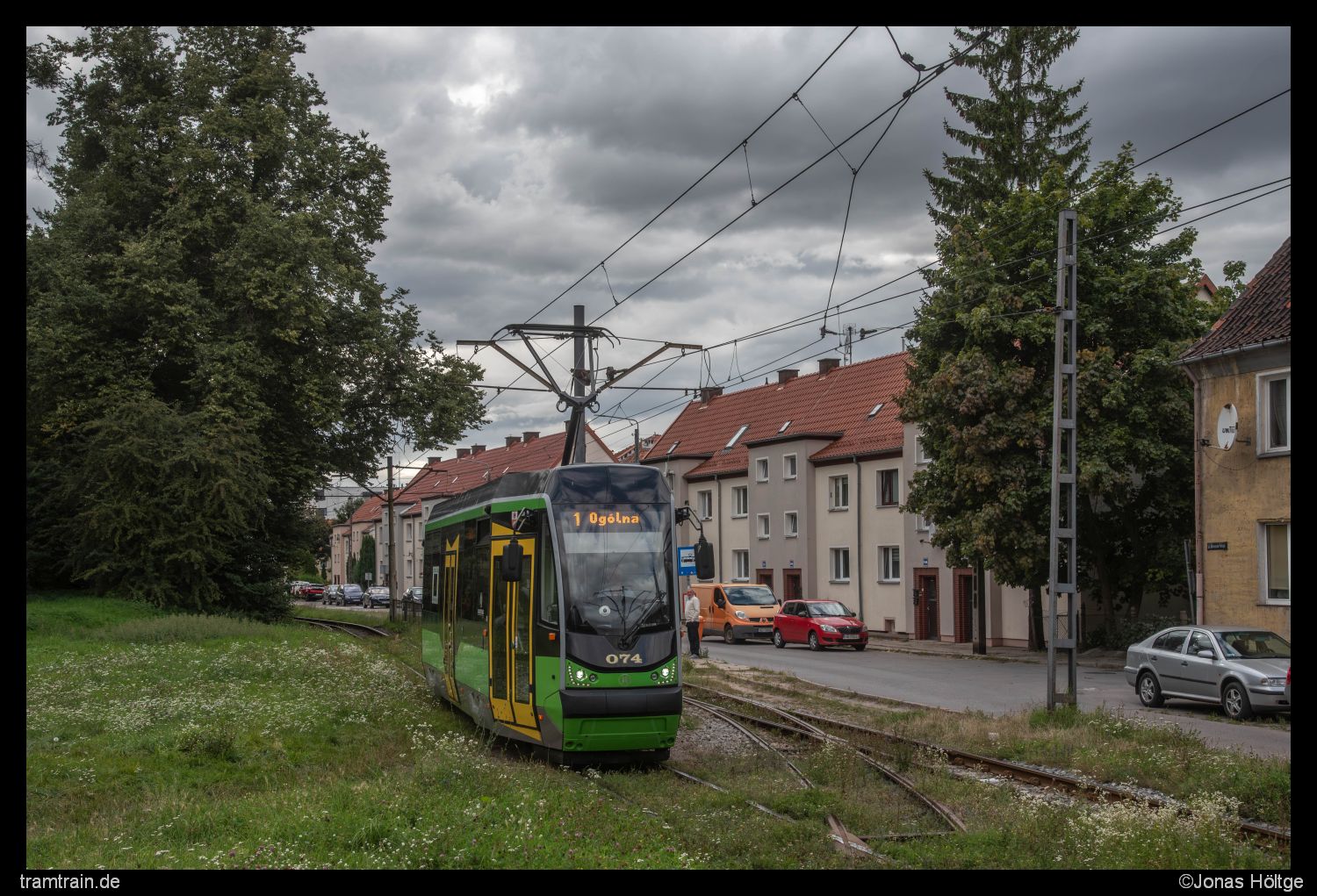 Wagen 074 konnte ich schon fast seit Beginn der Fahrt von der Endstation beobachten. Langsam aber sicher rückte der Wagen aber immer näher und ich hatte noch keinen sonnigen Spot gefunden. Daher musste ich kurzfristig zu einem kleinen Sprint ansetzen, um auch von dem eingleisigen Stück noch ein halbwegs ordentliches Bild mit Wagen 074 schießen zu können. Jetzt hatte ich die Station Grunwaldzka (Sadowa) fast wieder erreicht.
