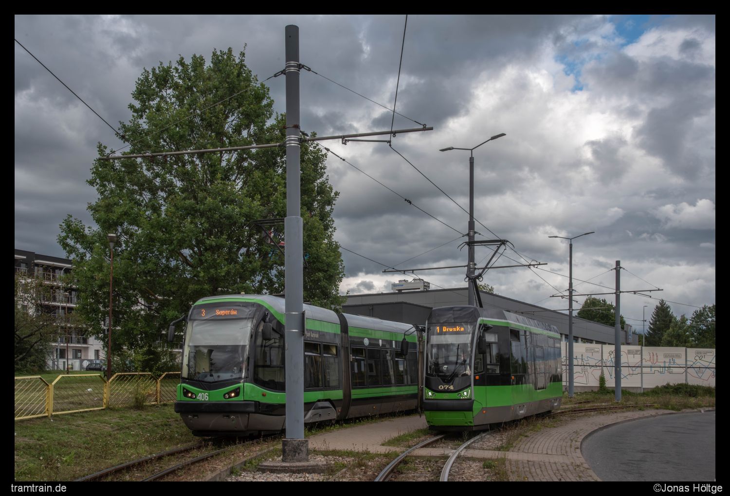 Diesen kurzen Streckenabschnitt hatte ich nun in voller Gänze dargestellt. Jetzt wollte ich mir auch noch den restlichen Abschnitt des Astes angucken in der Hoffnung, dass auch dieser noch ein paar Motive zu bieten hatte. Von der Station Obrońców Pokoju (Batorego) ging es zunächst eine Station bis zur Station Obrońców Pokoju (Płk. Dąbka) weiter. Dort knickte die Strecke wieder in die Mitte einer großen Straße ab und wurde dadurch direkt unfotogener. Zudem traf hier der nicht betriebene Linienast wieder auf die Strecke der Linien 1 und 3. Zum Glück folgte die Strecke der Straße nur eine Station, bevor es nach rechts abging. Aber auch dort ging es in der Mitte einer großen Straße bis zur Endstation Ogólna weiter. Hier ergaben sich auf jeden Fall keine Motive und ich sah bei diesem trüben Wetter erst recht keinen Grund die Bahn zu verlassen. Daher ging es letztendlich erst an der Endstation aus der Bahn, an der auch wieder Bilder ohne die große Straße möglich waren. Da der Wagen 074 als Linie 1 dem Wagen 406 auf der Linie 3 nur wenige Minuten später gefolgt war, stand auch dieser noch in der Endstation und es war ein Bild von beiden Fahrzeugtypen nebeneinander möglich.