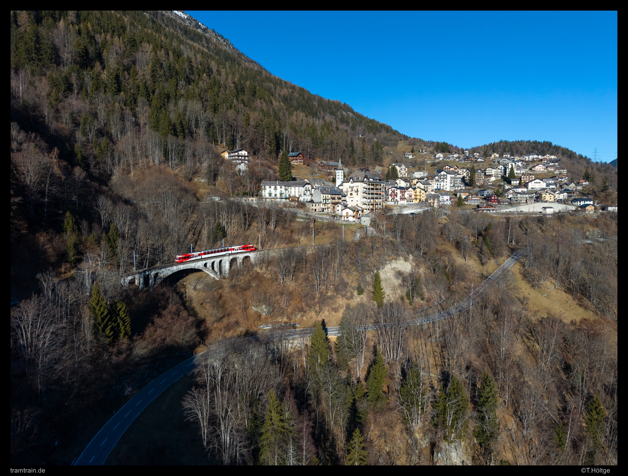 Ebenfalls nur per Drohne sind Aufnahmen vom Gegenhang bei Langwies mit dem berühmten Langwieser Viadukt. Zwischen den beiden Lokzügen bildet im Sommer ein Allegra den dritten Umlauf auf der Arosabahn, heute eingeteilt der ABe 8/12 3504. Bei der ominpräsenten Capricorn-Schwemme im RhB-Netz, freut man sich heute auch schon über die klassischen Schlepptriebwagen-Kompositionen mit den Allegras.