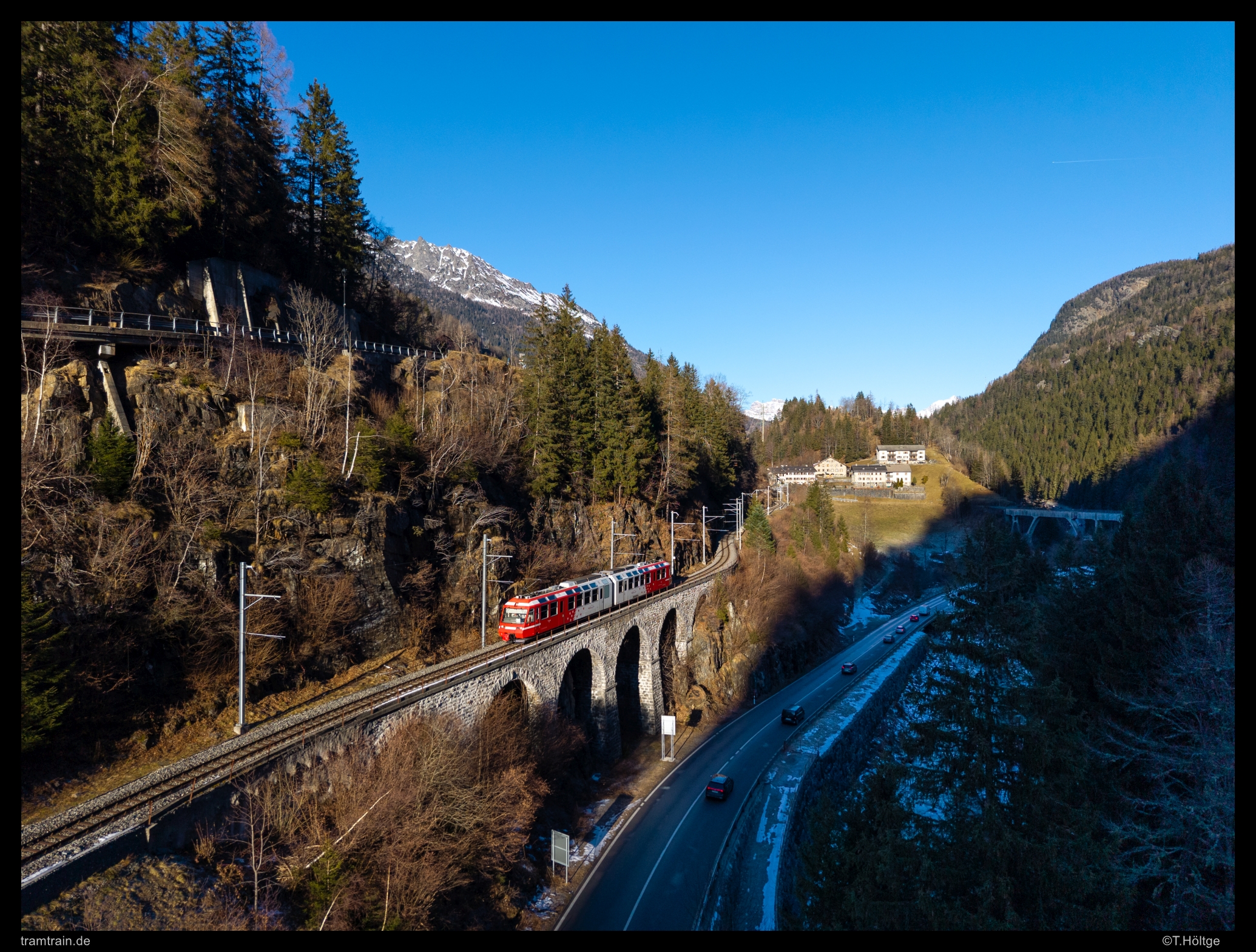 In der engen Klamm zwischen Le Châtelard und Le Châtelard Frontière erreicht die Sonne im Dezember nur für etwa eine Stunde ein kleines, per Fluggerät umsetzbares Viadukt. Wie schon vorgestern notiert, kam auf diesem Umlauf auch wieder ein alter BDeh 4/8.