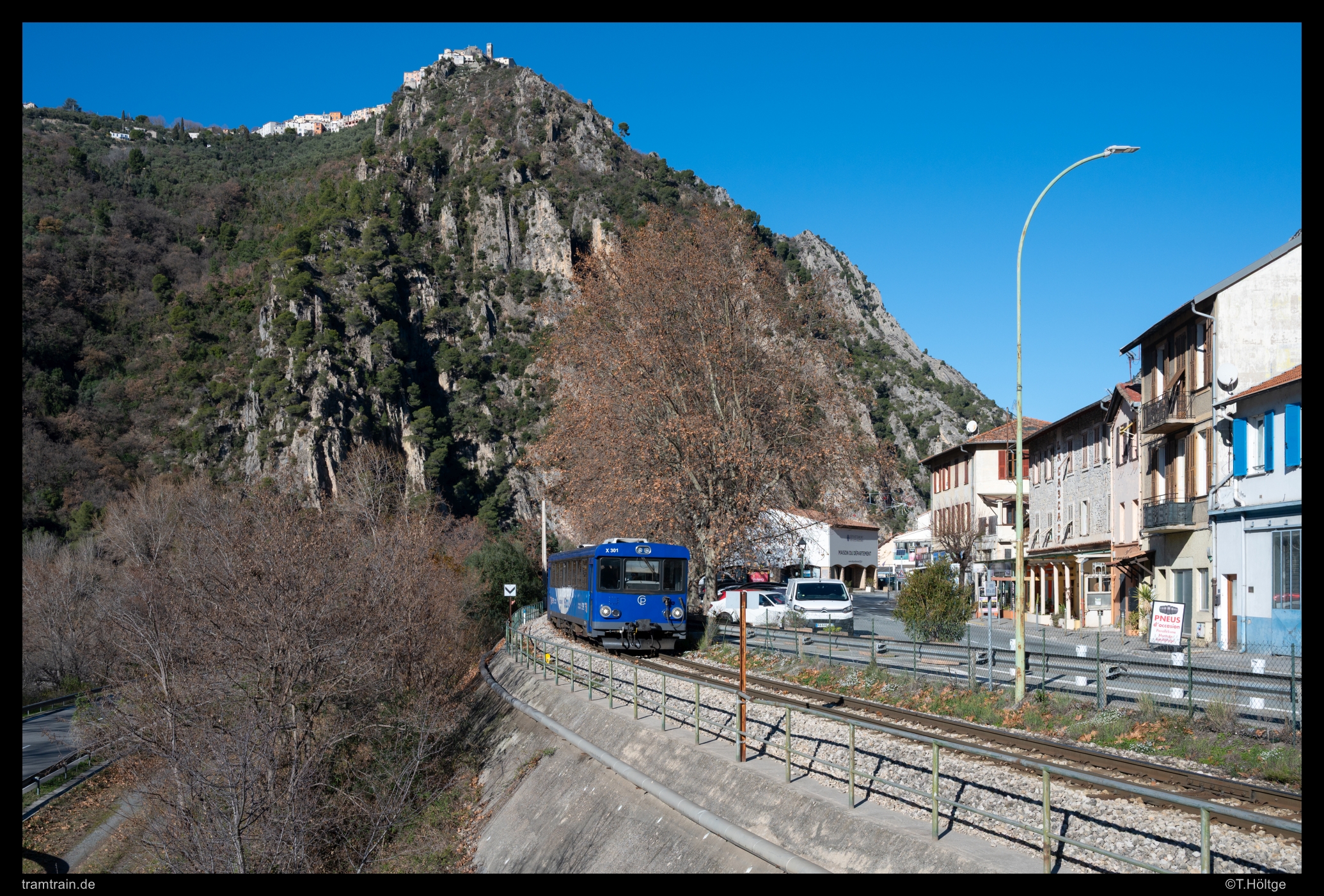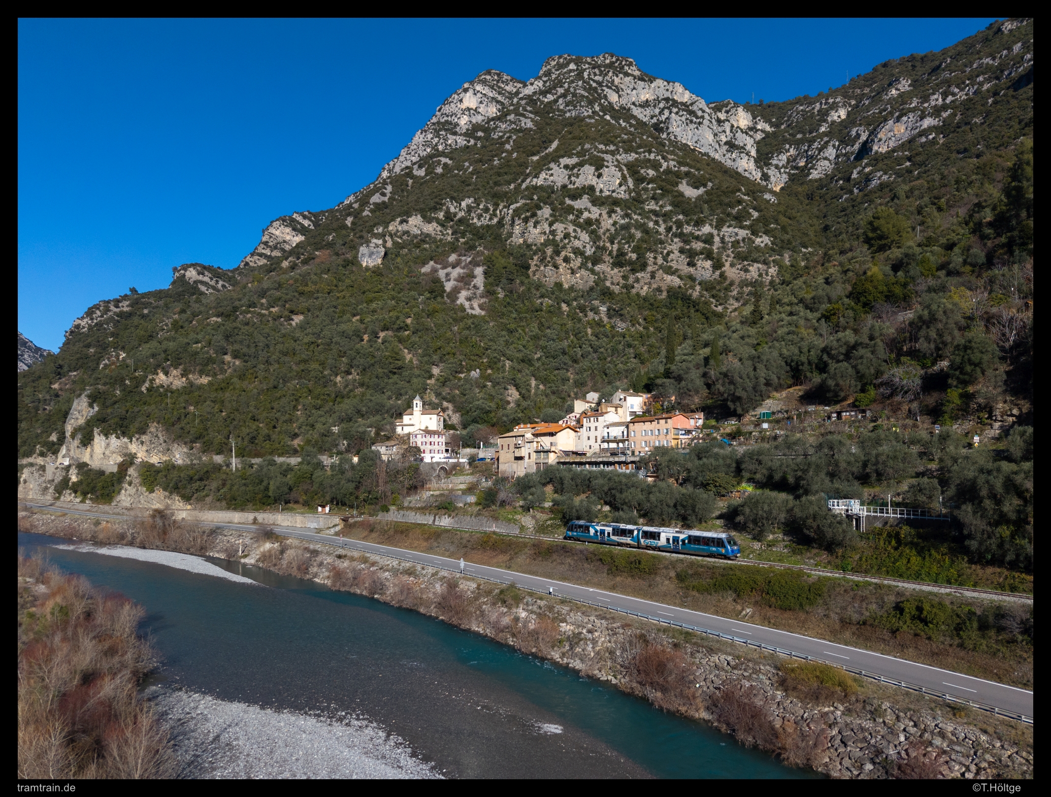 An diesem Tag begleitete ich den einzigen im Dezember bei Tageslicht in Nizza startenden Langläufer das Tal hinauf. Bei der Fahrt am frühen Nachmittag gab es wiederum deutlich mehr Motive, als bei der Begleitfahrt des rasanten AMP 807+808 realisierbar waren. Ein Highlight war auf jeden Fall die Dorfkulisse von Le Chaudan kurz hinter dem Beginn der engen Schlucht, die sich über viele Kilometer die Strecke hinaufzieht. Die Vorfreude auf eine vorgesehene Reise hierher im Frühling 2026 haben die noch zahlreichen offenen Motive jedenfalls nur erhöht.