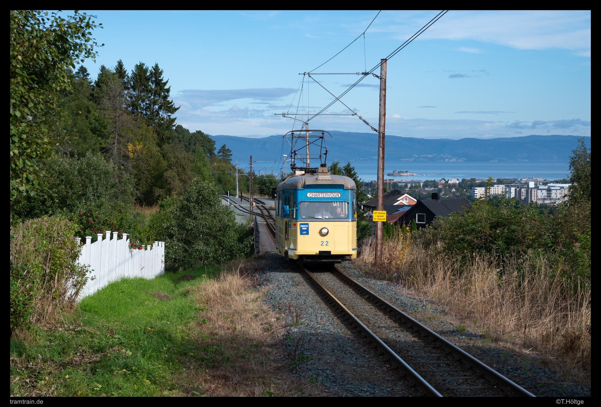Seit 1988 die letzten Linien der Straßenbahn von Trondheim eingestellt wurden, ist die 1990 wiedereröffnete Überlandlinie nach Lian die letzte verbliebene Straßenbahnline von Trondheim und der Betrieb damit weiterhin der nördlichste Straßenbahnbetrieb der Welt. Zu verdanken hat die Linie ihr Überleben im Wesentlichen den elf bei der Stilllegung 1988 noch fast fabrikneuen LHB-Triebwagen vom Typ “Braunschweig”. Mit der “Überbreite” von 2,6m auf Meterspur waren die Fahrzeuge quasi unverkäuflich und der Versuch des “heimlichen” Verkaufs an einen Schrotthändler flog auf und führte zu einem öffentlichen Skandal. Durch ihre weitgehende besondere Trassierung konnte die rund 8 km lange und aus der ursprünglich eigenständigen Gråkallbanen hervorgegangene Überlandlinie im Jahr 1990 wiedereröffnet werden, ohne den MIV zu stark zu “stören” und wird seither mit den elf GT6 “Typ Braunschweig” bedient, von denen aktuell sechs einsatzbereit sind. Nachdem die Einstellung mit dem alternden Wagenpark und den ausgefahrenen Gleisen immer wieder im Raum stand, stehen die Zeichen nun seit einigen Jahren klar pro Straßenbahn, die Sanierung der Strecke ist in vollem Gang und die Beschaffung neuer Fahrzeuge wurde eingeleitet. Bauarbeiten bis 2027 am Innenstadtabschnitt im Straßenplenum von Skansen bis zur Blockumfahrung St. Olavsgate sind auch der Grund, warum die Linie 9 stadtseitig aktuell nur bis zum Gleisdreieck Ila verkehrt. Dennoch werden im Viertelstundentakt die üblichen vier Fahrzeuge benötigt, von denen GT6 99 hier eines der Highlights der Strecke passiert, die Stahlgitterbrücke Hoemsbrua zwischen den Haltestellen Nordre Hoem und Søndre Hoem.