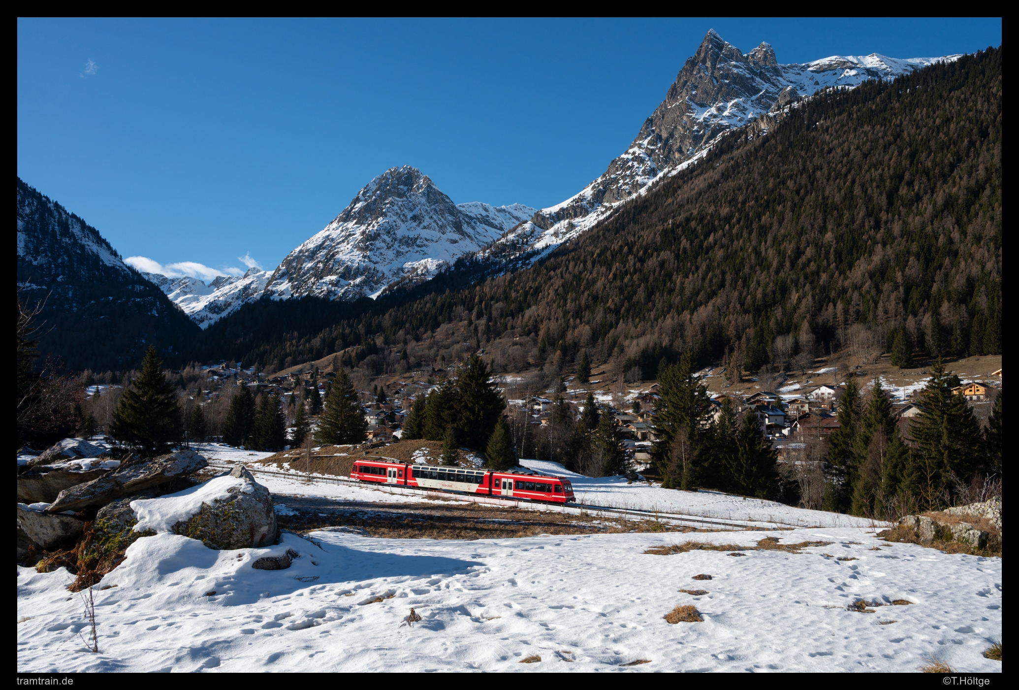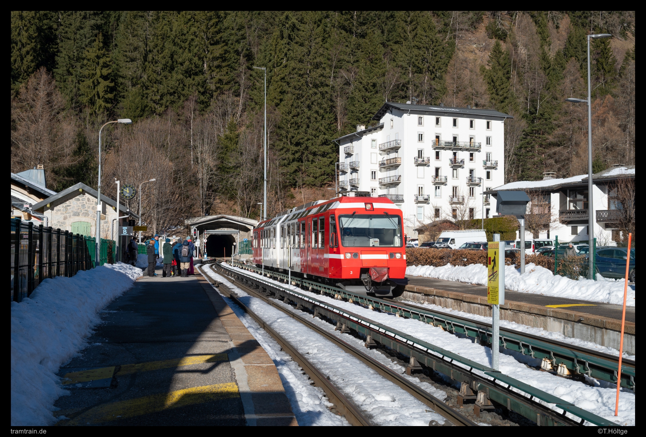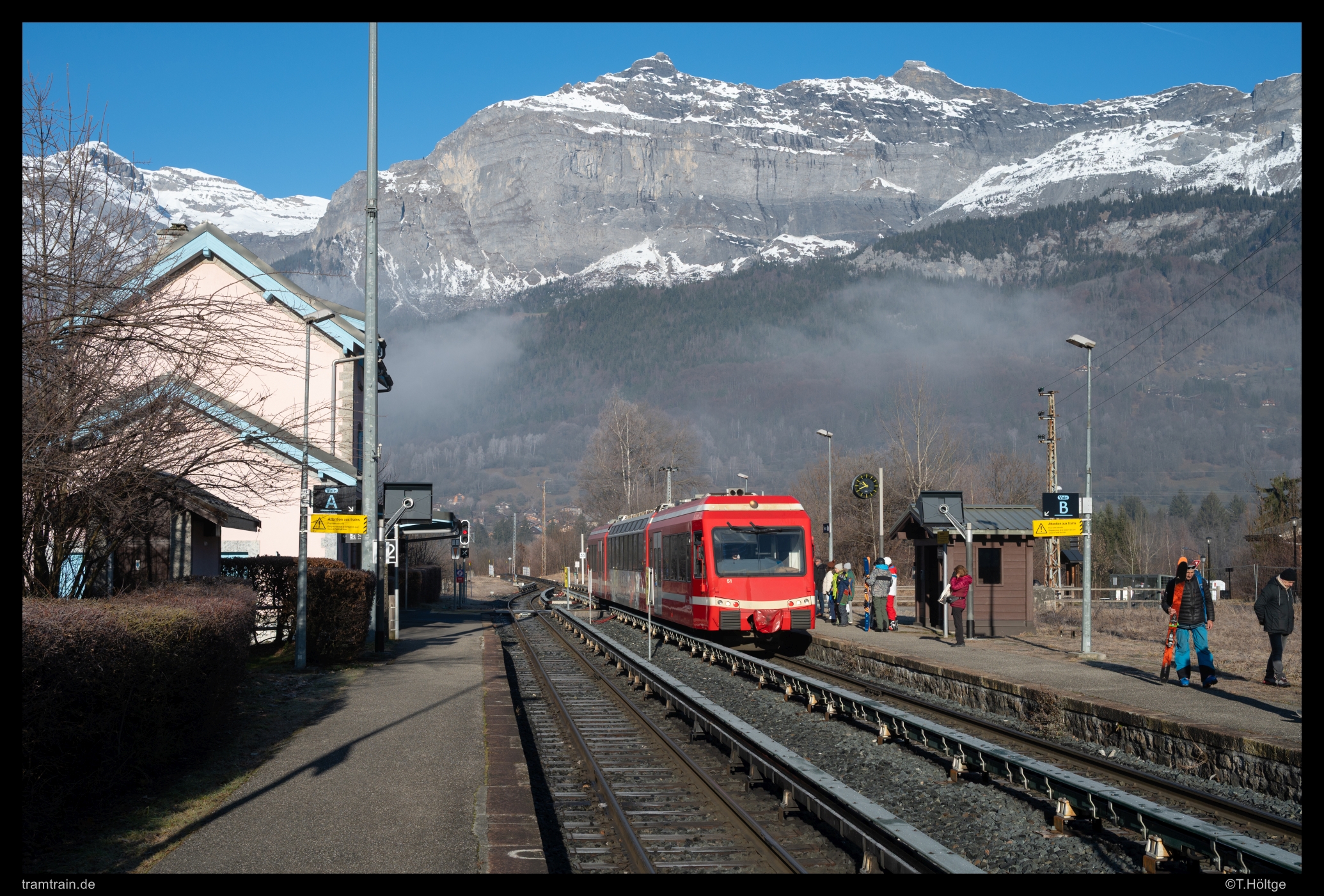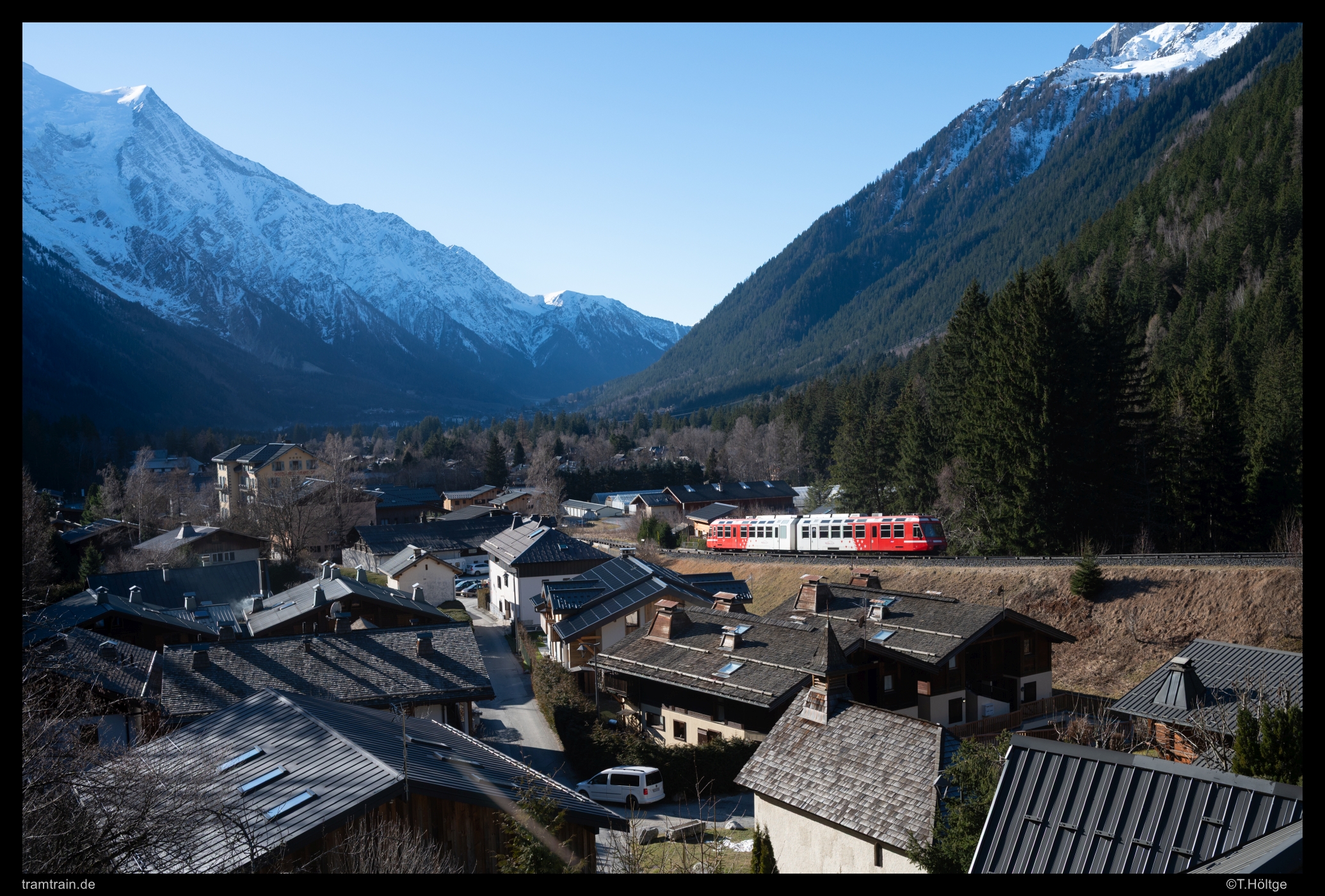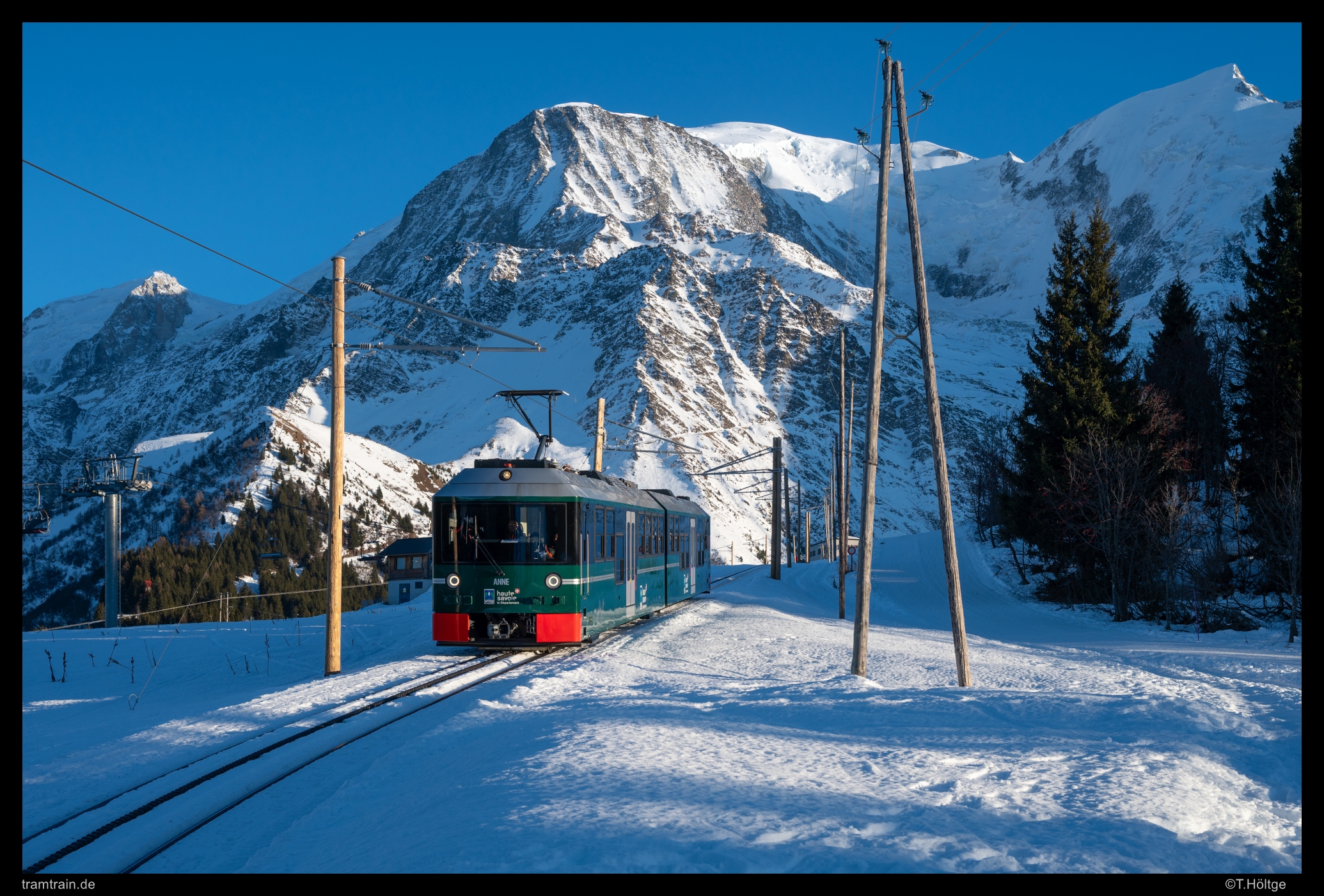 Wie schon im vergangenen Jahr, brach ich auch dieses Jahr Ende Dezember zu einer Tour an den kürzesten Tagen des Jahres auf. Nach dem üblichen, aber schönen Heiligabend in überschaubarer Familienrunde, brach ich noch in der Nacht auf in Richtung Westalpen. Die Wetterkarten kannten dort übereinstimmend bis zum realistischen Prognoseende nur große Sonnen. Ziel war zunächst die Region am Mont-Blanc. Die Tramway du Mont Blanc stand schon seit Jahren auf meiner erweiterten Wunschliste, kannte ich doch die neuen Fahrzeuge dort noch nicht. Am Mont-Blanc-Express, also der Meterspurstrecke auf französischer Seite von St-Gervais-les-Bains (dem Startpunkt der Tramway du Mont Blanc) über Chamonix nach Vallorcine und von dort mit den Schweizern weiter über Le Châtelard nach Martingy, durften es durchaus noch ein paar Aufnahme der bei beiden Gesellschaften zur Ablösung anstehenden BDeh 4/8 / Z800 aus den 90er-Jahren sein. Der weitere Reiseverlauf war offen. Im Hinterkopf hatte ich aber, einen großen Bogen über Provence und Pyrenäen zu schlagen, aber Wetter und Spontanität würden entscheiden.