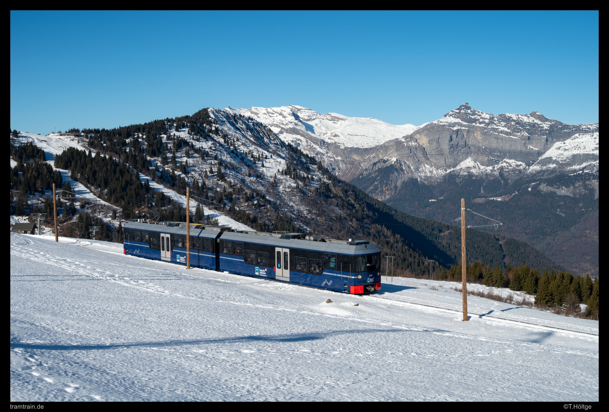 Am 2. Weihnachtstag ging es mit dem ersten Zug um 9 Uhr mit der Tramway du Mont Blanc hinauf zum Col de Voza. Im Winter wird die Strecke nur bis zu diesem kleinen Skigebiet zwischen Col de Voza und Bellevue befahren. Im winterlichen Hauptsaisonfahrplan bei gutem Wetter Mitte Dezember bis Anfang Januar und an Wochenenden aber in einem durchgehenden, etwas krummen Stundentakt zwischen 9 und 16 Uhr mit der letzten Talfahrt um 16.45 Uhr. Damit ließ sich sehr gut arbeiten. Praktisch ab dem zweiten Zug hatte es immer irgendwo auf diesem kurzen Streckenabschnitt passend Sonnenschein, sodass ich den gesamten Tag den guten Kilometer zwischen Col de Voza und Bellevue auf und ab lief. Auf über 1600m Höhe hatte es hier schon gut Schnee und die Schneeschuhe waren an der ein oder anderen Stelle angebracht. Am frühen Nachmittag ist hier die neue Stadler-Garnitur “Marie”, eigentlich ja “Marie die II.” kurz vor Bellevue unterwegs auf Bergfahrt.