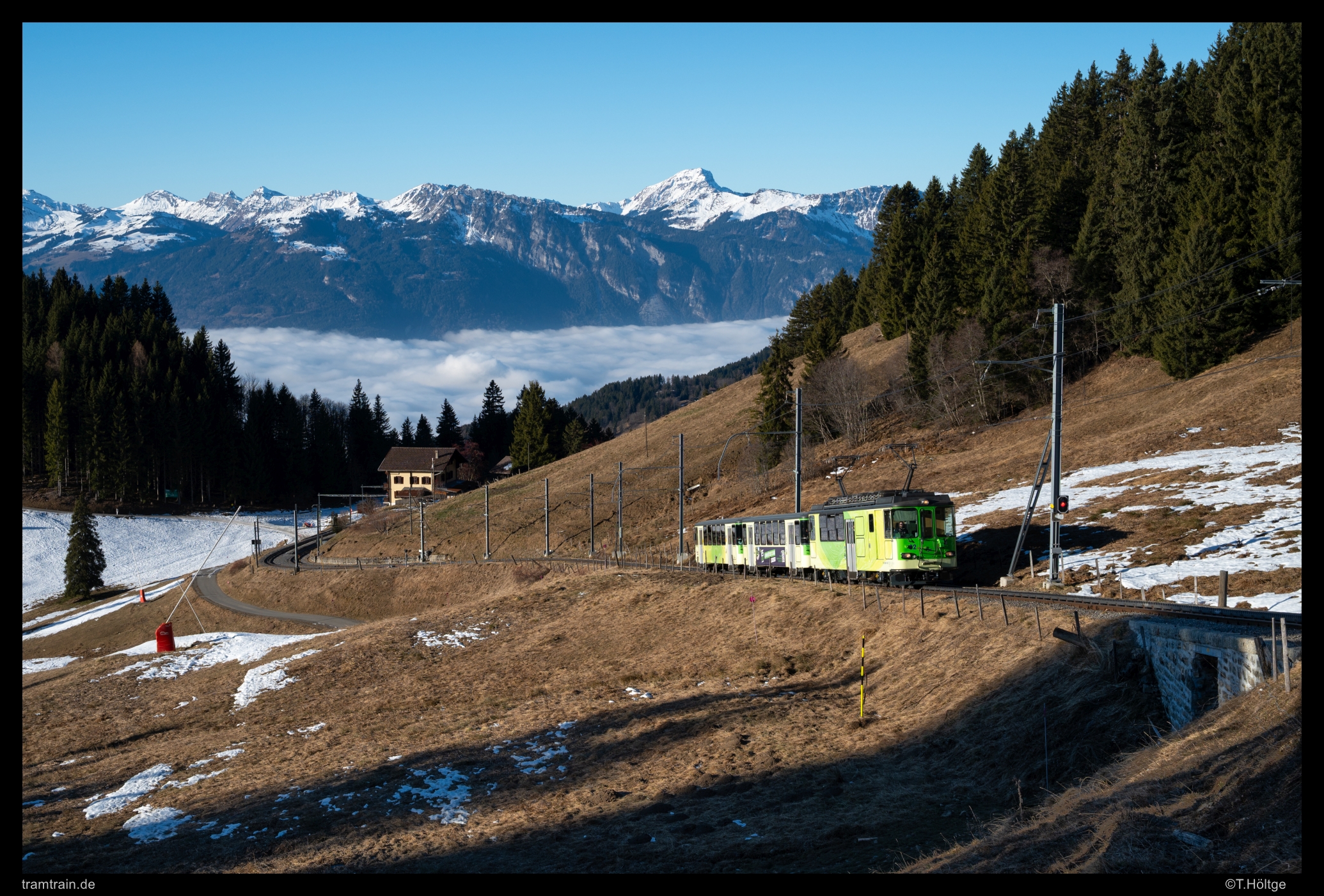 Nach dem vielen Gekurve mit dem Auto am 27. Dezember, hatte ich wenig Lust, noch am Abend die lange Fahrt in die Provence anzutreten. Stattdessen kam mir die BVB in den Sinn, die auf dem obersten Abschnitt zwischen Villar und Col de Bretaye im Winter einen dichten Ski-Pendelverkehr im 15-Minuten-Takt fährt. Das wollte ich mir schon lang anschauen, insbesondere wegen des in der Regel nur in diesem Fahrplan eingesetzten Lokzuges. So ergriff ich die Chance und wanderte am 28. Dezember von Villar hinauf zum Col de Bretaye und zurück. Zum Einsatz kommen im Viertelstundentakt auf dem Abschnitt Villar – Col de Bretaye vier Pendelzüge. An diesem Tag die zwei Triebwagen BDeh 4/4 81 und 82 aus dem Jahr 1976, der modernere BDeh 4/4 83 von 1987 und ein Lokzug mit der HGe 4/4 32 aus dem Jahr 1964, von der ebenfalls noch die erste Maschine 31 von 1953 bereitstünde. Als Besonderheit stehen die Wagen auf dieser Strecke talseitig. Über dem Nebelmeer des Rhonetals hat soeben BDeh 4/4 82 sein Schwesterfahrzeug im Bahnhof Col de Sud gekreuzt und fährt weiter Richtung Col de Bretaye.