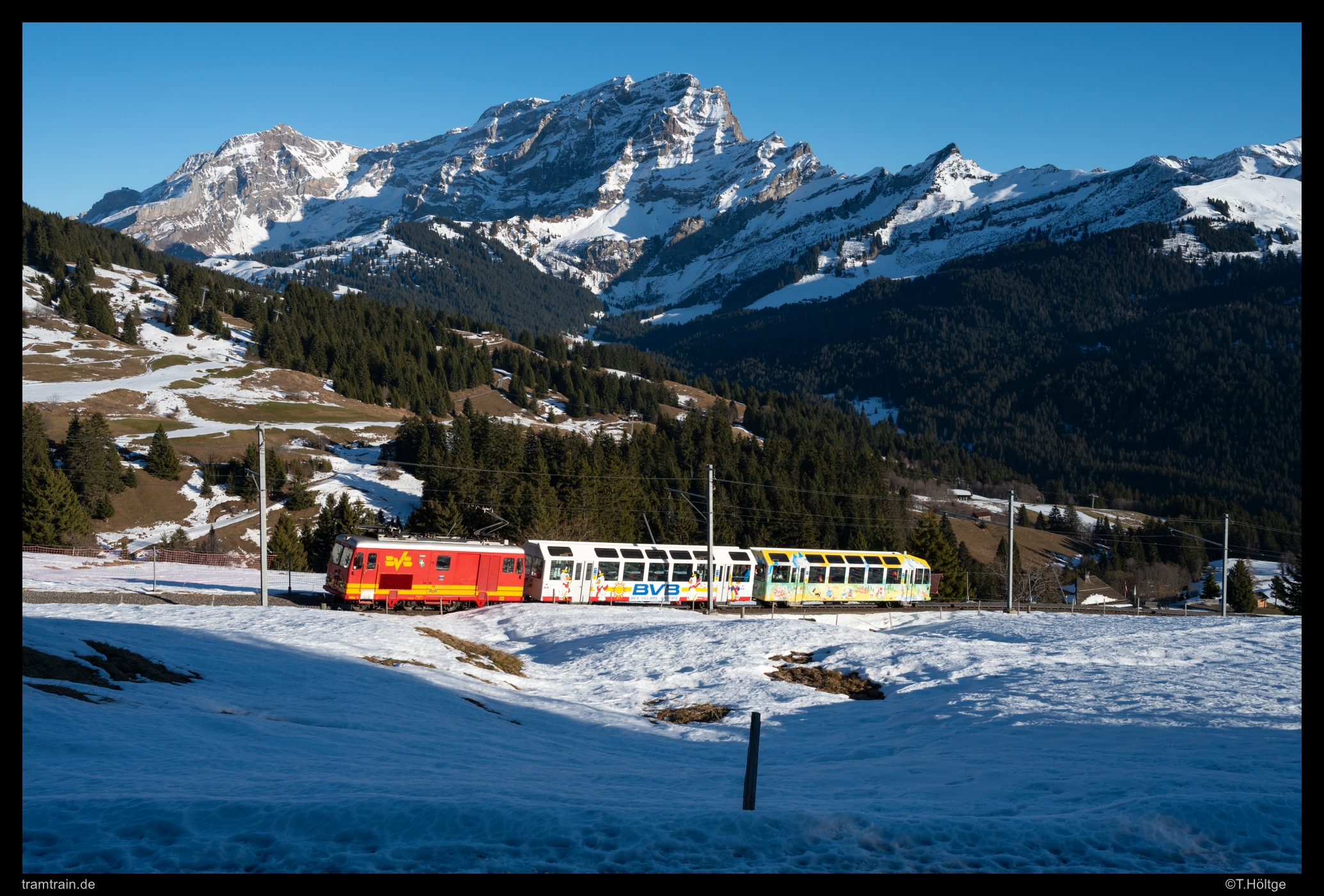 In der Regel nur zu solchen Großkampfzeiten werden noch die beiden HGe 4/4 31 und 32 im Personenverkehr eingesetzt. Das restliche Jahr verdingen sich die Fahrzeuge im Bahndienst, oder stehen sich im Depot in Bex die Räder eckig. Am 28. Dezember kam die jüngere HGe 4/4 32 mit den 1998 als Panoramawagen neu aufgebauten Bs 52 und Bst 53 zum Einsatz. Hier ist der Zug kurz unterhalb der Kreuzungsstation Bouquetins auf Bergfahrt, nachdem nach zweistündiger Pause der Viertelstundentakt am späteren Nachmittag wieder eingesetzt hat.