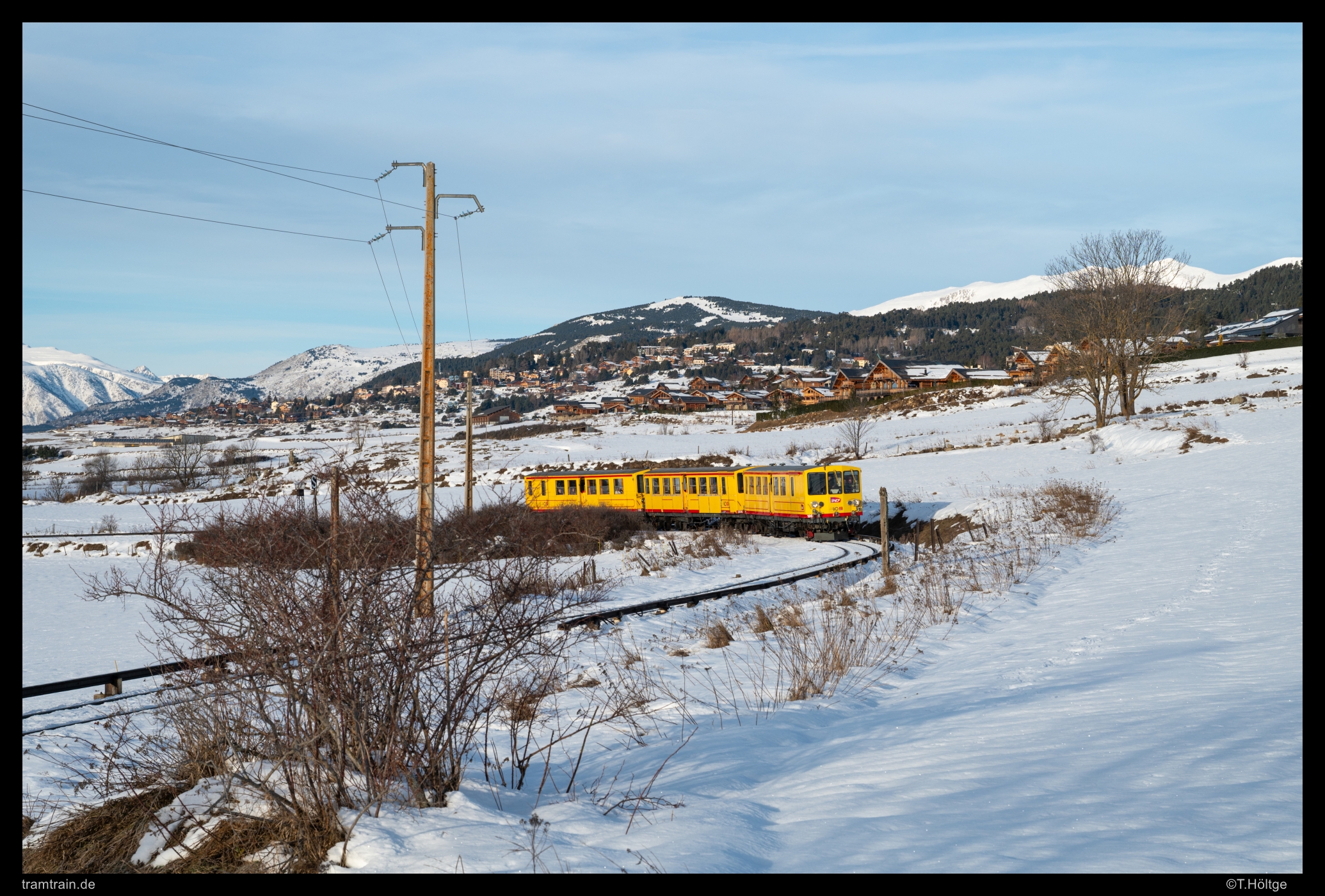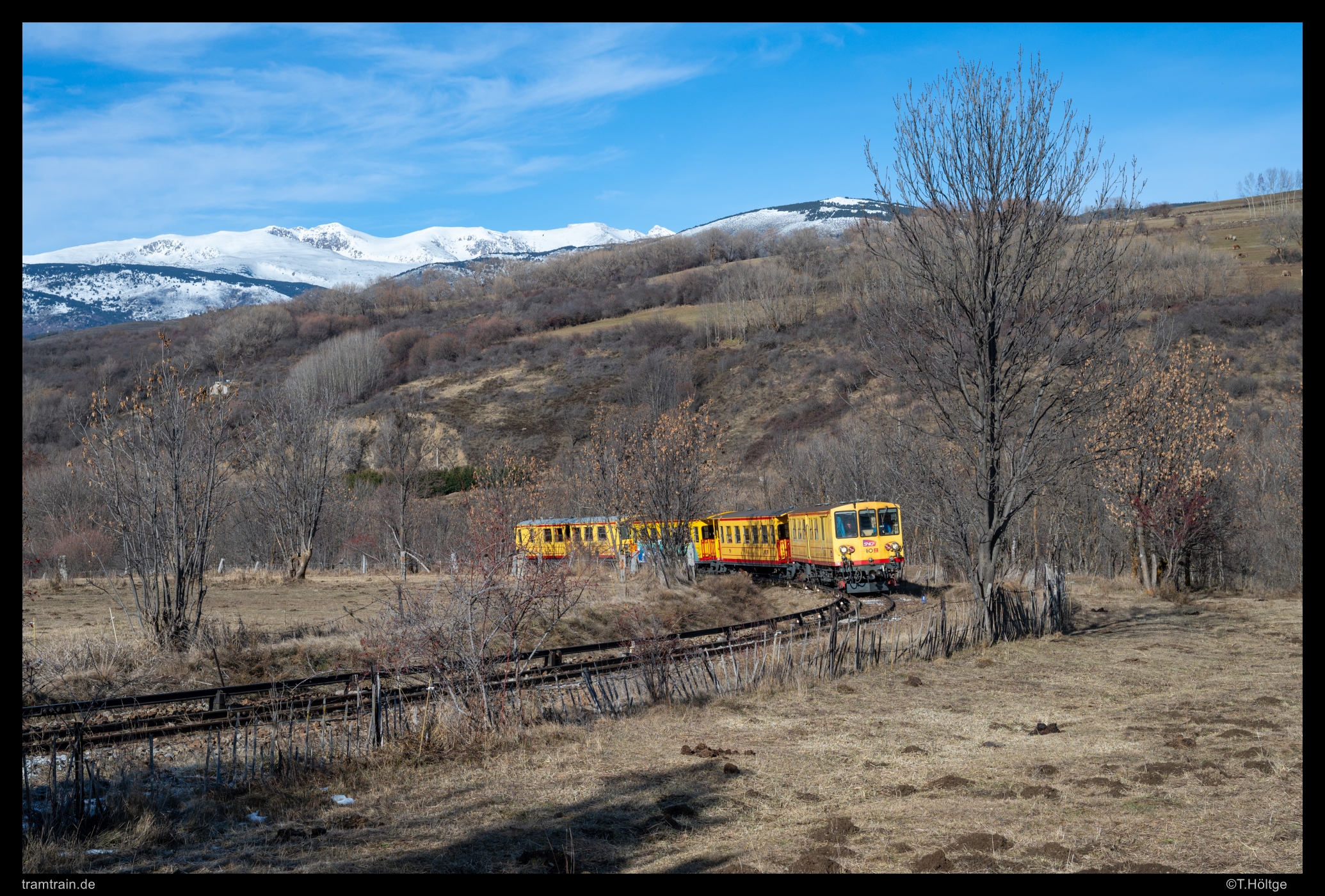 Auf der Hinfahrt nach Latour gelangen dafür ab Font Romeu zahlreiche Aufnahmen des Langläufers, dieser Abschnitt ist einfach sehr geeignet für Begleitfahrten. Ich greife hier mal eine Stelle kurz vor Saillagouse heraus, an der sich die Bemalung ganz gut kaschieren ließ. Spätestens die Rückfahrt versank dann verstärkt im Siff und ab dem nächsten Tag war Bewölkung angesagt. Den ursprünglichen Plan, noch zu Cremallera de Núria hinüber zu fahren, verwarf ich daher. Bei Nicht-Licht kannte ich die Bahn, wie die Pyrenäenmetro, schon aus 2016. So brach ich gegen 16 Uhr die Zelte in den Pyrenäen ab, fuhr durch Abend und Nacht heimwärts und erreichte schließlich pünktlich zum Frühstück um 9 Uhr den heimischen Bäcker. Man soll aufhören, wenn es am Schönsten ist und wie hätte es nach acht Tagen ungetrübter Dezembersonne noch schöner werden sollen?