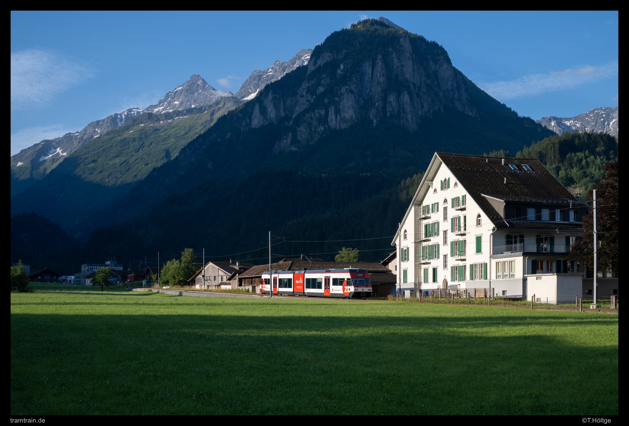 Das Tal von Chamonix liegt bis weit in den Nachmittag in den langen Schatten der 4000er des links zu sehenden Mont-Blanc-Massivs. Erst wenn die Sonne in die Talachse gedreht hat, erreicht sie den weltbekannten Wintersportort am Talgrund doch noch für ein bis zwei Stunden, solang sich der Nebel nicht bis hierher hinaufgeschoben hat. Die ersten Sonnenspots hat es weiter oben im Tal schon gegen Mittag, wie hier bei Les Tines mit einem Z800 Richtung St-Gervais-les-Bains.