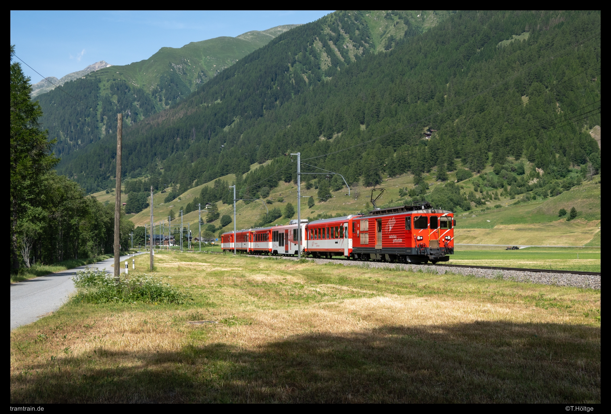 Im Wallis stand nun noch einmal eine Zweitagestour aus dem Goms ins Mattertal und retour auf dem Plan. Am 25. Juni standen hier die bislang immer etwas vernachlässigten Deh 4/4 II 91 bis 96 im Fokus, die wohl auch nicht mehr ewig laufen werden. Besser früh darum kümmern, als später den letzten Leitungen hinterher zu eilen… Netterweise sind die Triebwagen aktuell nur selten von Wagen “umgeben”, stattdessen werden die dispositiven Wagen mit einem zweiten Steuerwagen vor, bzw. hinter den normalen Steuerwagen gehängt. Deh 4/4 II rollt hier am Vormittag bei Ulrichen das Goms Richtung Furkatunnel hinauf.