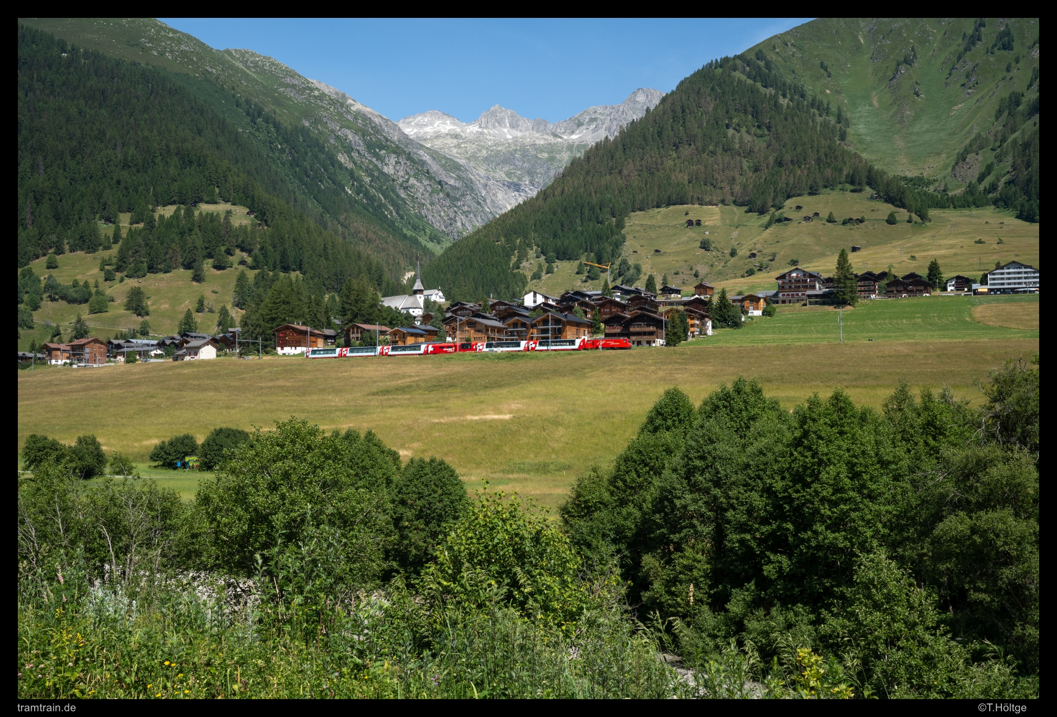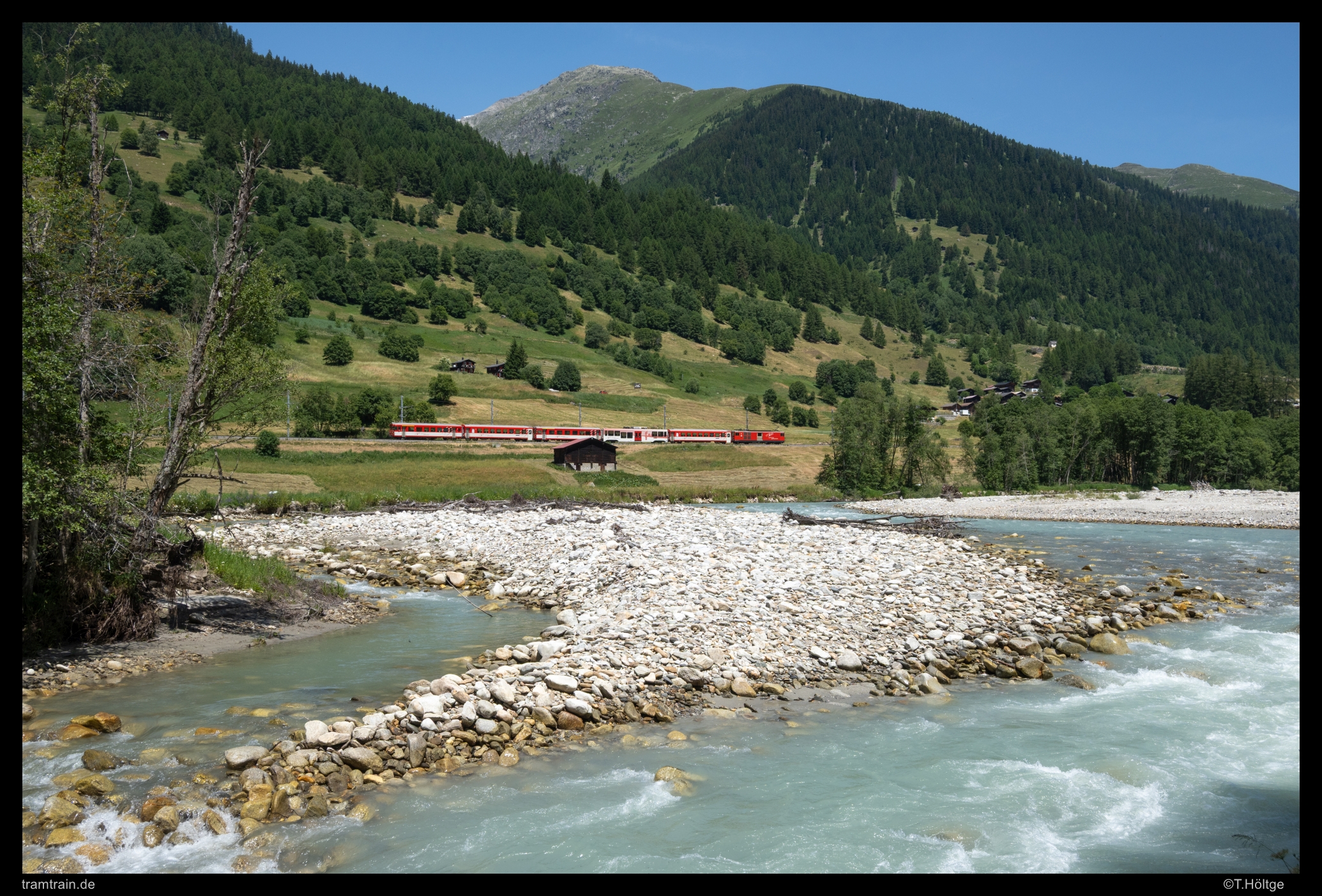 Eine herrliche Gravel-Piste, auf der ich mit dem MTB zur sportlichen Freude einige Gravel-Bikes abhängen konnte, führt auf der der Bahn und Straße gegenüberliegenden Hangseite des Goms das Tal hinunter. Immer wieder ergeben sich dabei nette, landschaftsbetonte Ausblicke auf die Strecke, wie hier auf Höhe von Münster auf einen Glacier Express Richtung St. Moritz.