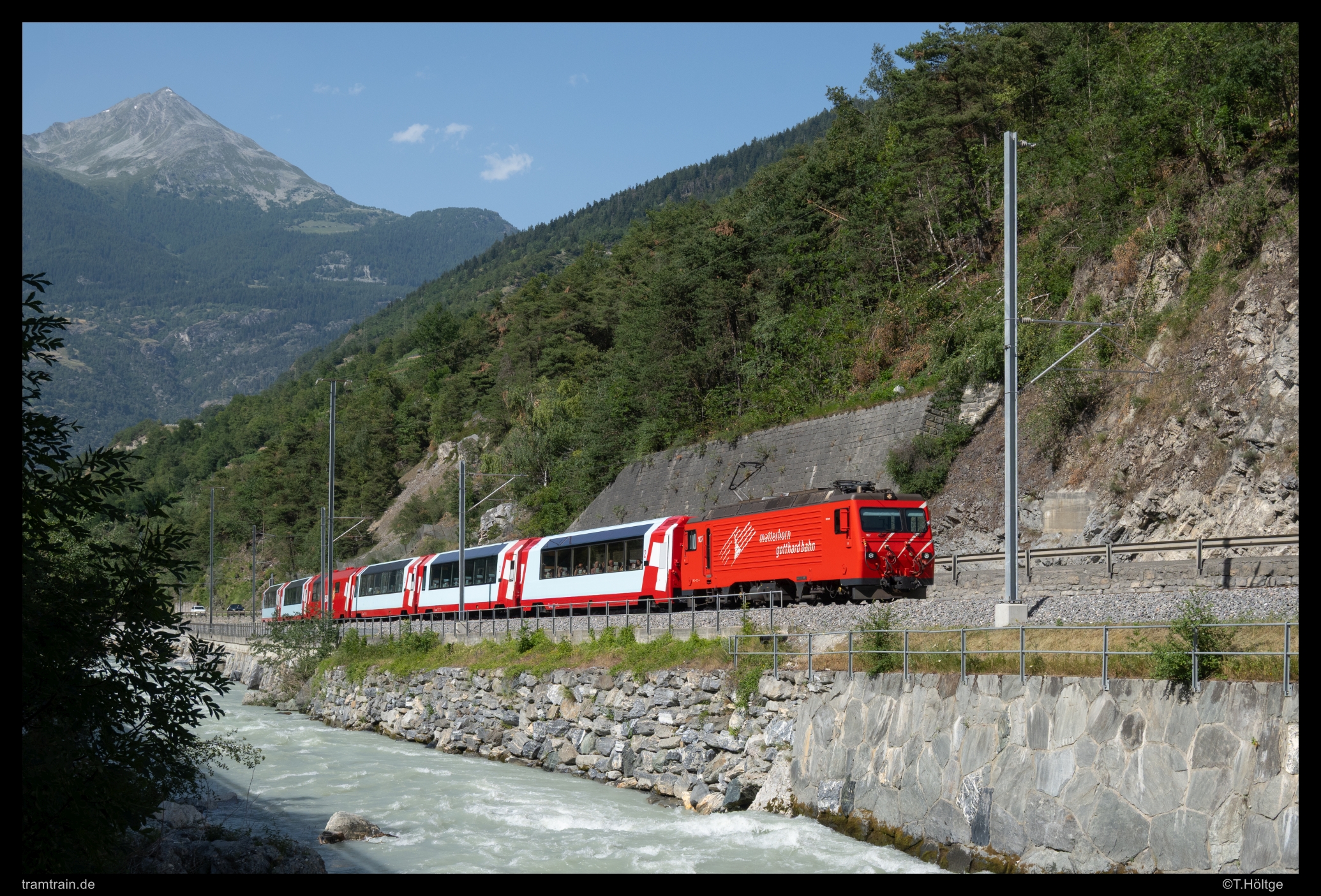 Nachdem bei 35 Grad heißem Gegenwind der Fön zwischen Brig und Visp durchquert war, ging es am Abend das Mattertal hinauf bis nach St. Niklaus. Zwischen Visp und Stalden bietet sich von der MTB-Piste unter der Schnellstraßenauffahrt ein netter Durchblick auf die Strecke. Der letzte Glacier Express des Tages ist hier auf dem Weg nach Zermatt.