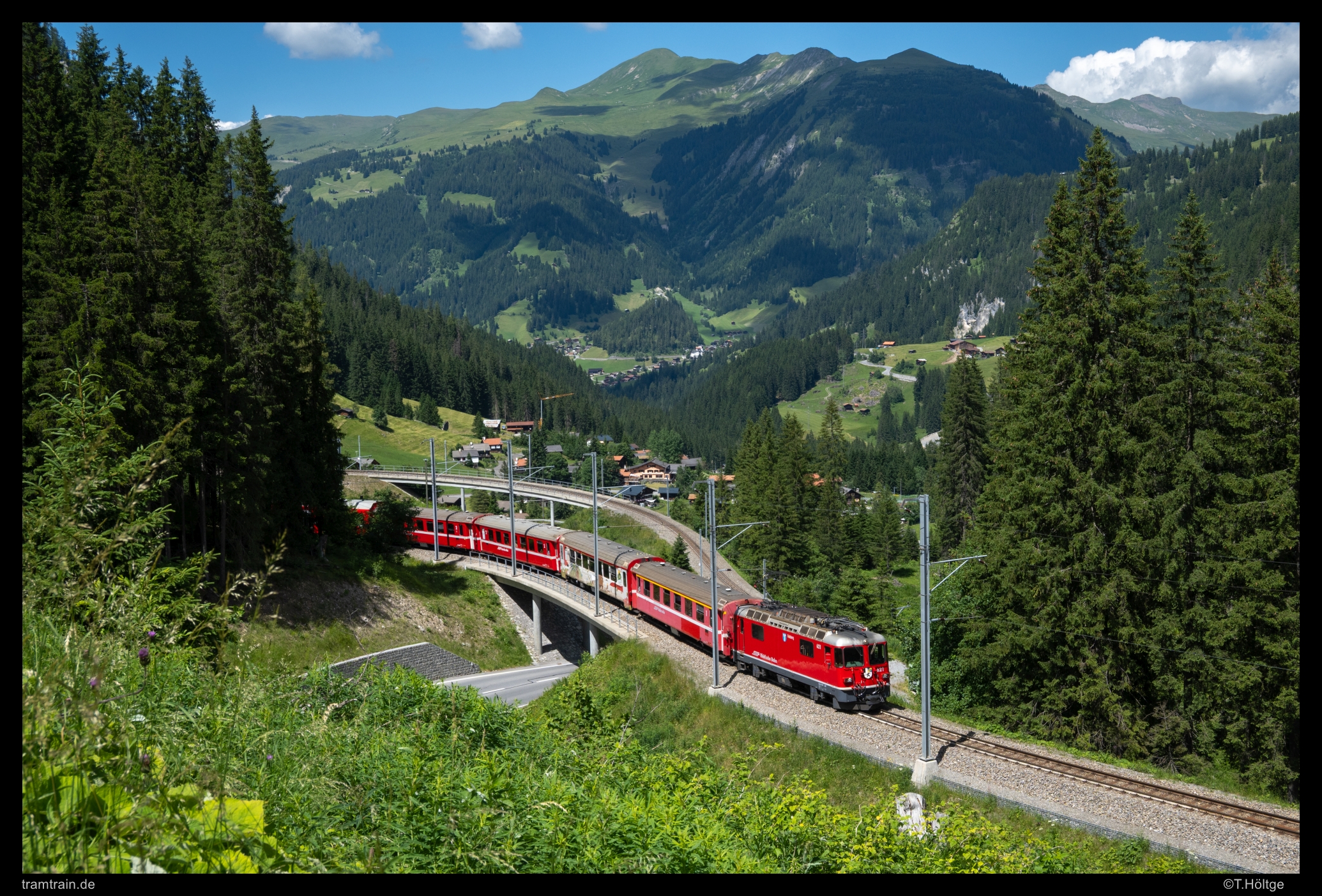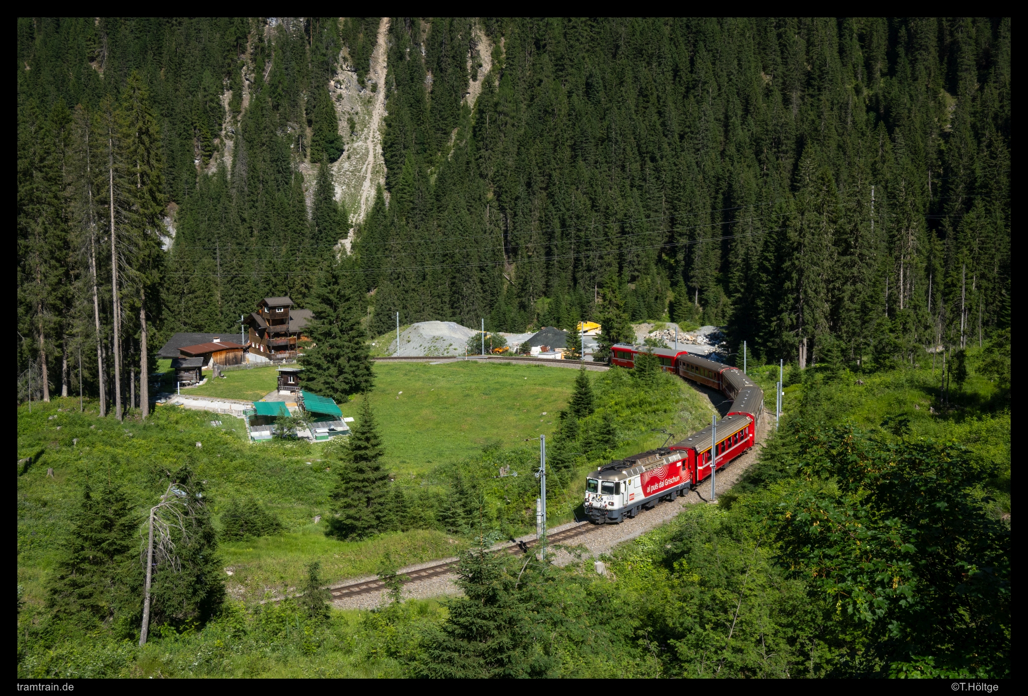 Der 27. Juni diente primär der Regeneration und wurde für eine letzte Verschiebung Richtung Graubünden genutzt. An der Furka und um Hospental entstand dank wechselseitig Hochlicht und Wolkenschäden nichts Vorzeigbares, aber es war einfach ein gemütliches Herumsitzen in herrlicher Berglandschaft. Am folgenden 28. Juni gab es dann zum Abschluss eine letzte Tagestour an der Rhätischen zwischen Peist und Arosa. Dabei konnte auch erstmals der Quadrokopter gewinnbringend eingesetzt werden. Dank nun nur noch mitzuführender Tagesverpflegung, war es kein Problem, den kleinen Vogel in der “Arschrakete” am Rad mitzuführen, während das Gerät den übrigen Urlaub im Kofferraum auf Parkplätzen in Dallenwil und Münster versauert war. Ein ohne Fluggerät praktisch nicht umsetzbares Motiv ist das Gründjitobel-Viadukt zwischen Peist und Langwies. Ge 4/4 II 633 zieht hier ihren Pendelzug Richtung Arosa. Der sommerliche Einsatz zweier Lokzug-Pendel war auch der akute Grund für den Besuch an der Arosabahn, die ich die vergangenen 10 bis 15 Jahre doch sträflich vernachlässigt hatte.