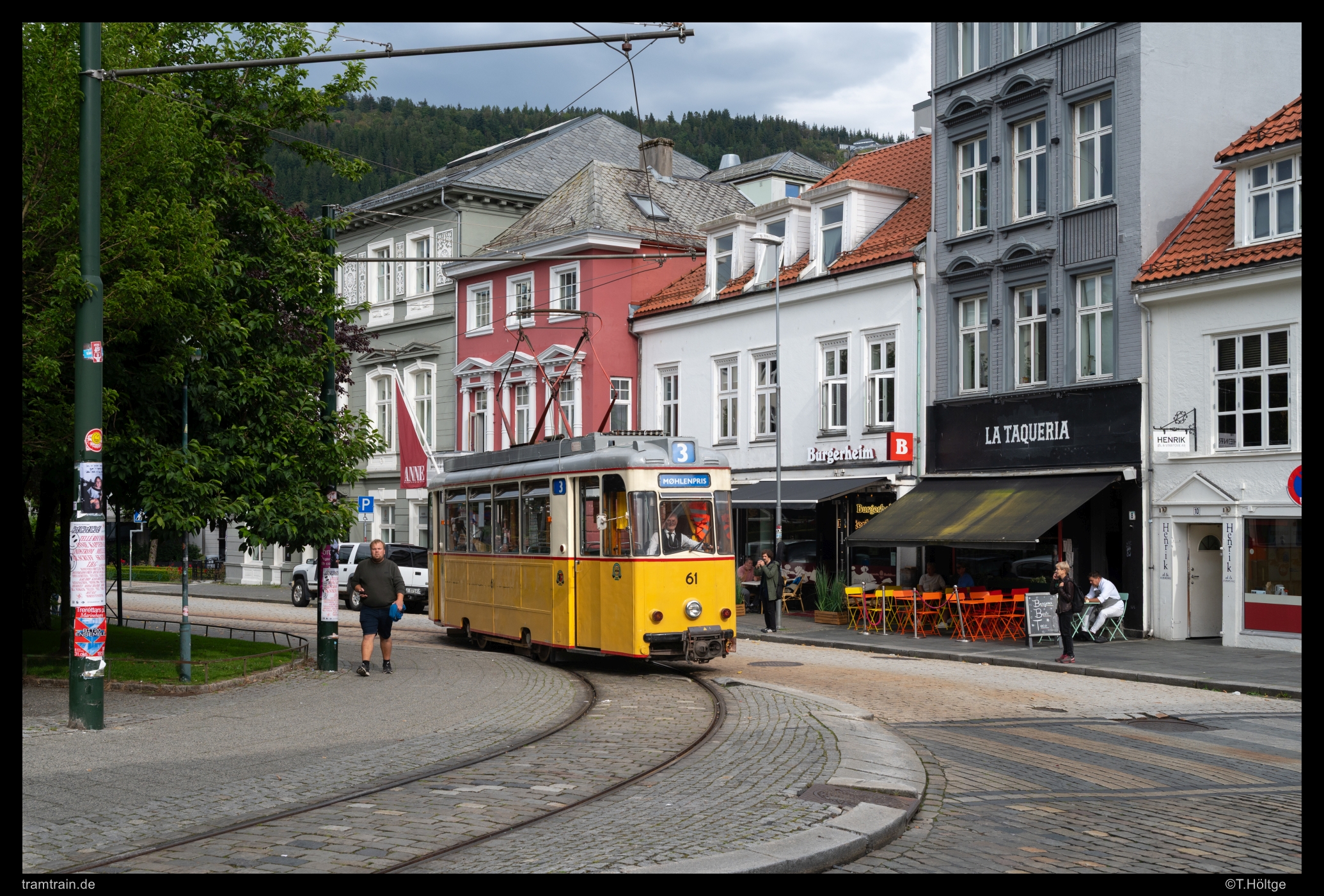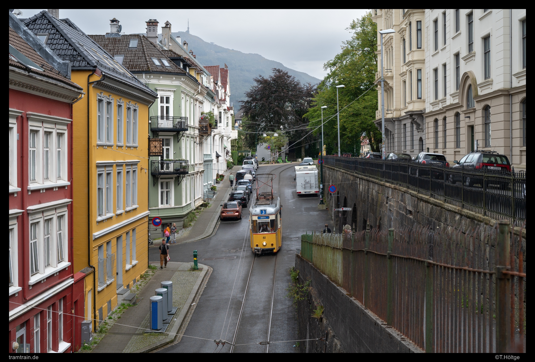 Die Straßenbahn im norwegischen Bergen wurde bereits im Jahr 1965 eingestellt. Seit 2011 gibt es mit einer modernen Stadtbahn ein System der 2. Generation, das bislang alle Erwartungen übertroffen hat. Daneben gibt es vom alten Depot Møhlenpris aus auch eine Museumsstraßenbahn, die seit kurzem wieder einem ganzen Stück des 1950 eingestellten Verlaufes der ehemaligen Linie 3 von Møhlenpris über Museplassen, Johanneskirken bis ins Stadzentrum nach Engen vor dem Theater folgt. Wagen 10, das letzte verbliebene Originalfahrzeug aus Bergen und gleichzeitig mit Baujahr 1897 eines der ältesten betriebsfähigen Straßenbahnfahrzeuge der Welt, wird im normalen Museumsbetrieb in der Regel nicht eingesetzt. Stattdessen wurden 1997 aus Berlin jeweils drei Reko-Triebwagen und -Beiwagen beschafft und in einer historisch angelehnten Bergener Lackierung hergerichtet. Mangels Umfahrungsmöglichkeit ist allerdings kein Beiwagenbetrieb möglich und so pendelt an Öffnungstagen des Bergens tekniske museum jeweils ein Rekowagen im Halbstundentakt zwischen 12 und 16 Uhr über die rund 1,5 km lange Strecke. Aktuell betriebsfähig ist der Rekowagen 61, in Berlin besser bekannt als 223 003-1, den wir zum Reisestart am 30. August 2025 auf seiner vorletzten Runde bei typischem Bergenwetter auf dem Museplassen Richtung Møhlenpris aufnahmen.