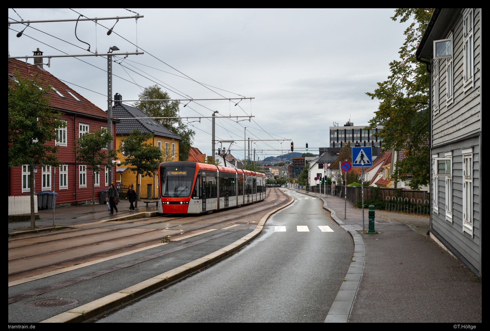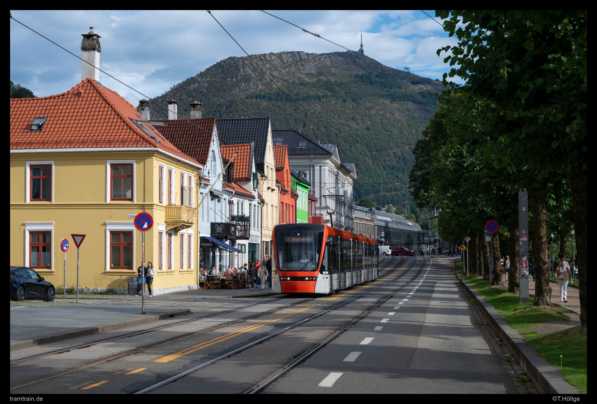 An diesem Abend entstand auch das einzige Sonnenbild der schon erwähnten, neuen Stadtbahn “Bybanen”, die mit inzwischen siebenteiligen Variobahnen in dichtem Takt zwei gemeinsam startende und sich später bei Kronstad überkreuzenden Linien nach Fyllingsdalen und zum Lufthavn bedient. Wirklich innenstädtisches Flair gibt es dabei nur auf dem kurzen Abschnitt auf der Kaigaten zwischen dem Bahnhof und der gemeinsamen Streckenende am Byparken. Variobahn 221, die im Gegensatz zu den ältesten Fahrzeugen bereits siebenteilig geliefert wurde, rollt hier über die Kaigaten auf die Endstation zu.
