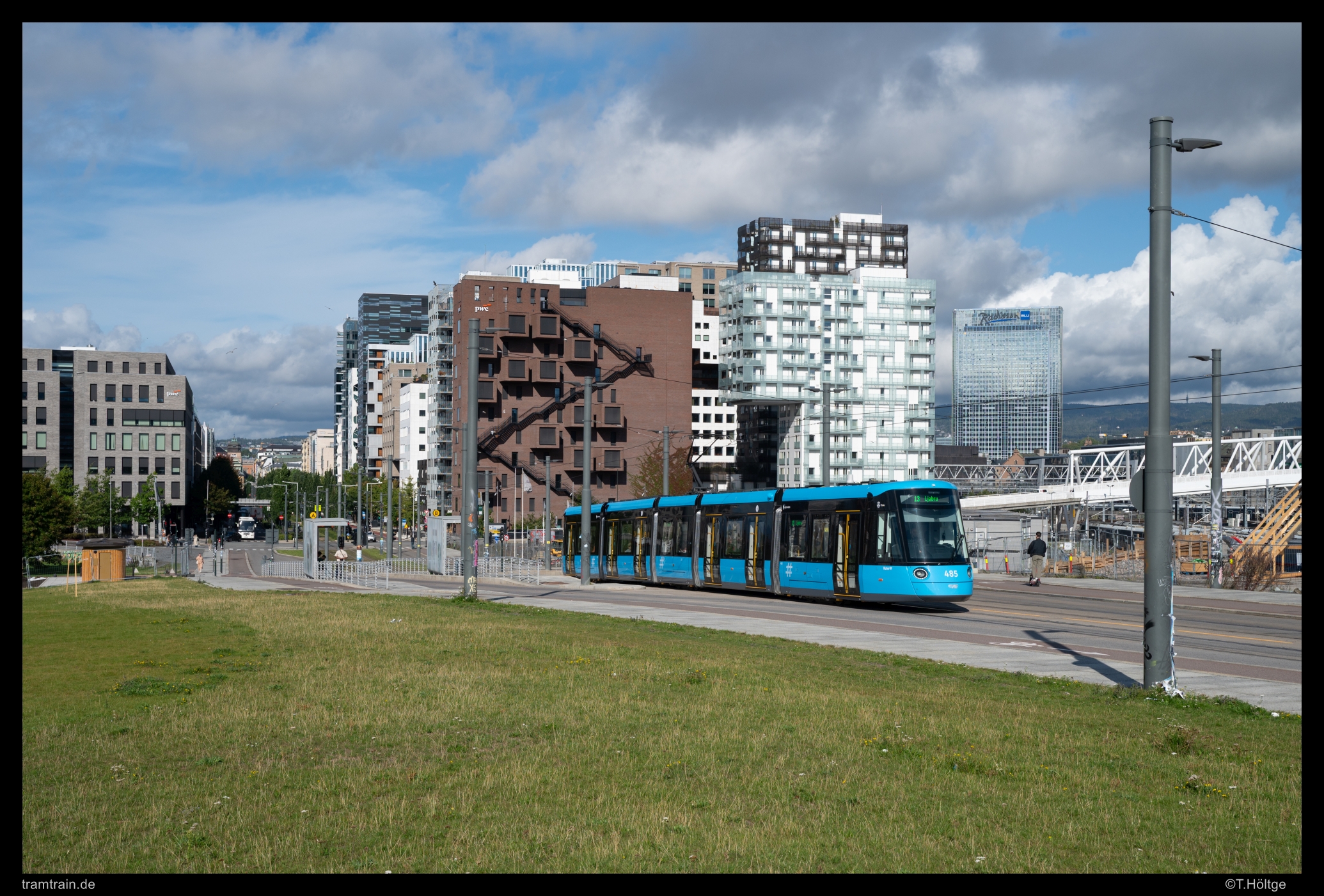 Vernachlässigt hatte ich beim letzten Besuch auch die neutrassierte Strecke durch das neue Stadtviertel zwischen der ebenfalls neuen Oper und dem Munch-Museum auf der einen Seite und dem Vorfeld der Sentralstasjon auf der anderen Seite. Das Viertel auf dem Areal des alten Containerhafens, entstand in den vergangenen 20 Jahren vollkommen neu. CAF Urbos 3 485 rollt hier durch das neue Stadviertel an der Haltestelle Middelalderparken Richtung Lijabru.