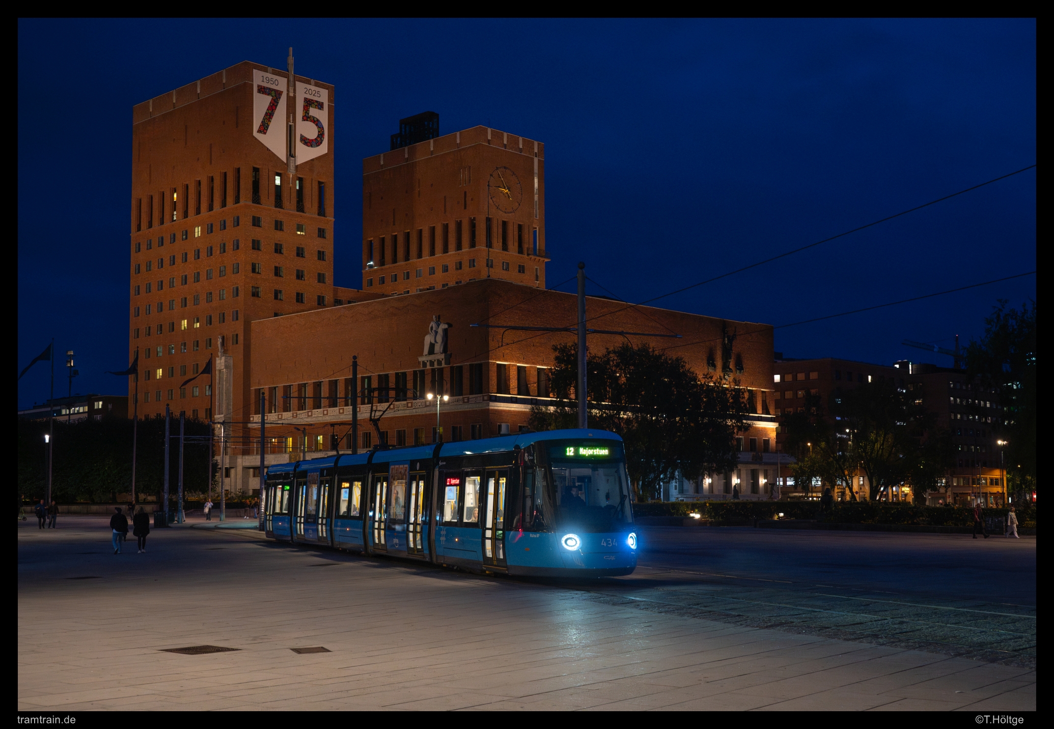 …und SL18 434 vor dem in diesem Jahr seinen 75. Geburtstag feiernden Oslo Rådhus. Hier musste lediglich eine Person aus einem Wagensegment entfernt werden.