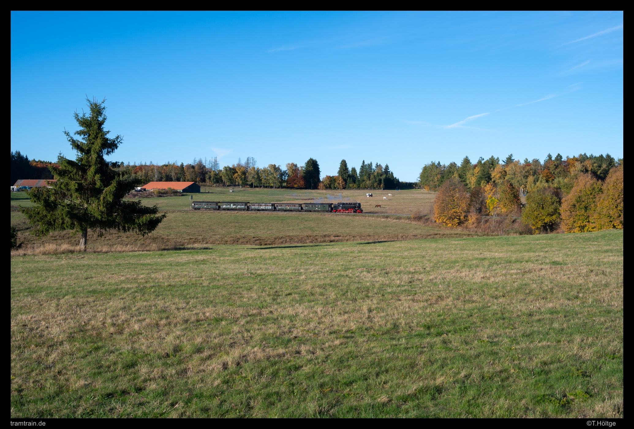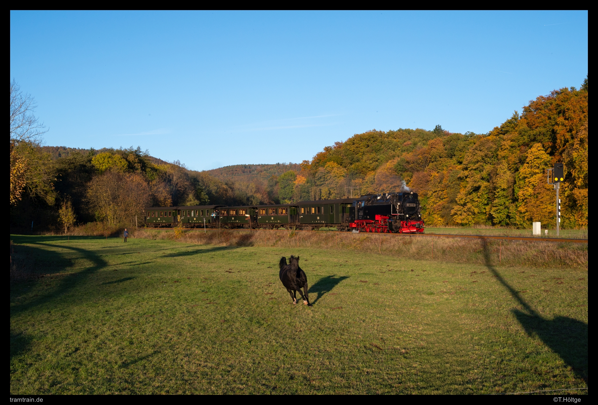 Im allerletzten Licht klappte sogar Ende Oktober noch die Kurve zwischen Ilfeld und Niedersachswerfen. Zwei Pferde nahmen das gruselige Dampfross zum Anlass, in vollem Galopp auf mich zu zu sprinten. Etwas mulmig war das schon. Zum Glück sind die Bremshundertstel der Vierbeiner aber besser als der Fünfkuppler, sodass es vor dem schmächtigen Zäunchen, der mich von den Tieren trennte, soeben noch für eine Vollbremsung reichte.