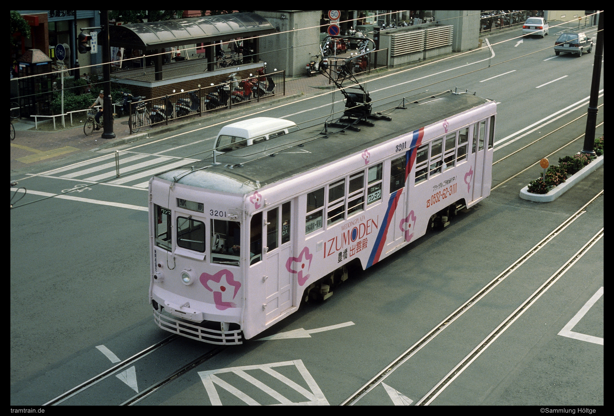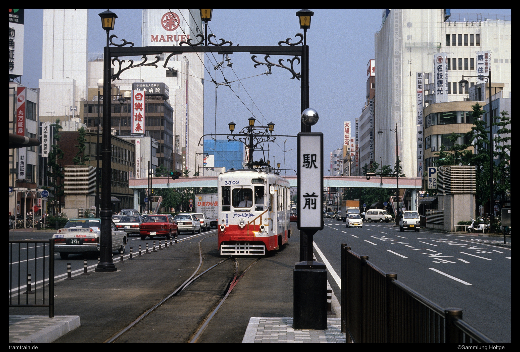 Ein Blick zurück in der Zeit gefällig? Bitteschön: Wagen 3302 erreicht am 23. Mai 1991 die damalige Endhaltestelle auf der Straße zum Bahnhof, heute Ekimae-odori. Die zwei 1961 gebauten Fahrzeuge 3301 und 3302 waren ebenfalls Gebrauchte und wurden 1967 aus Kanazawa übernommen.