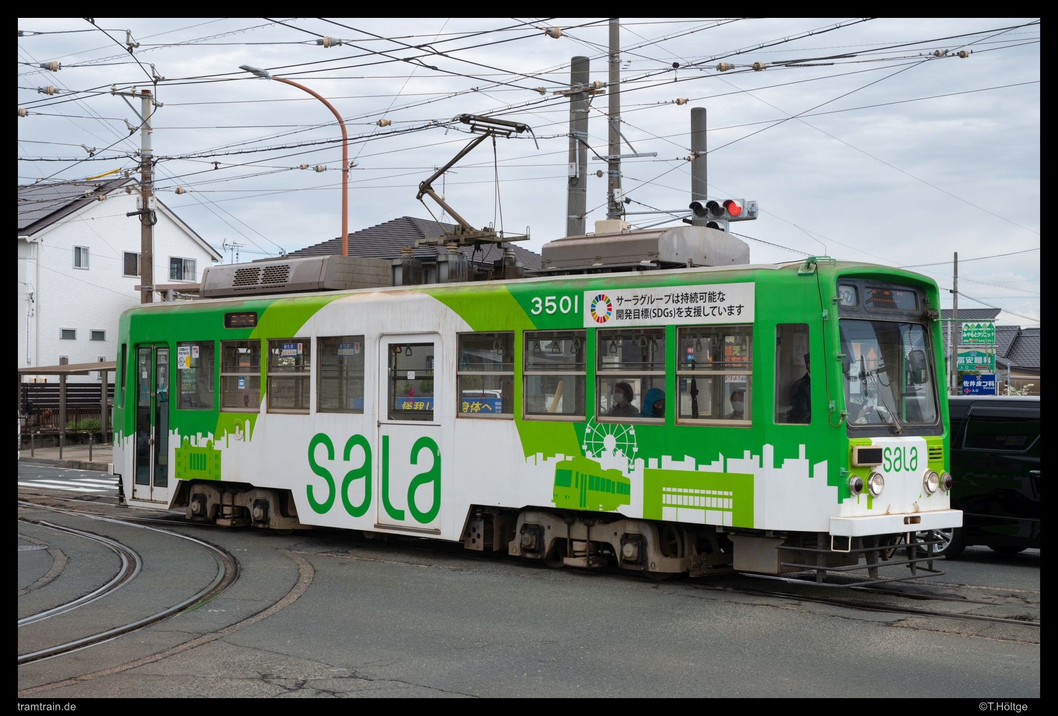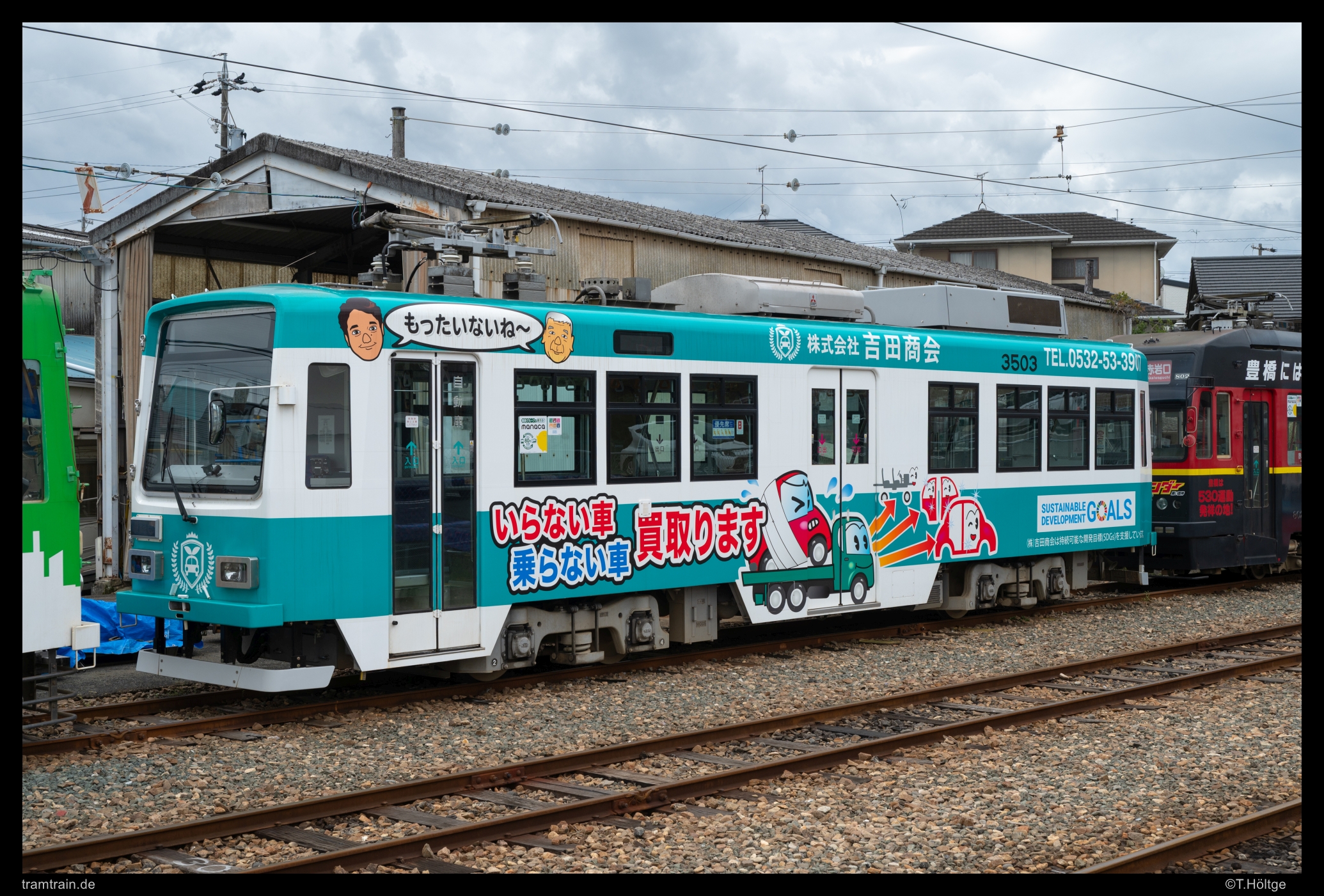 Die aus Tokyo übernommenen Fahrzeuge 3501 bis 3504 wurden in Toyohashi auf Einstiege vom Straßenniveau und Kapspur umgebaut. Hier zu sehen 3501 am 15. April 2025 auf Rangierfahrt vor dem Depot.