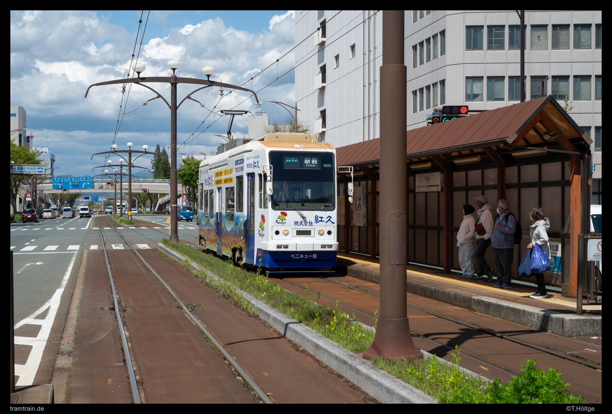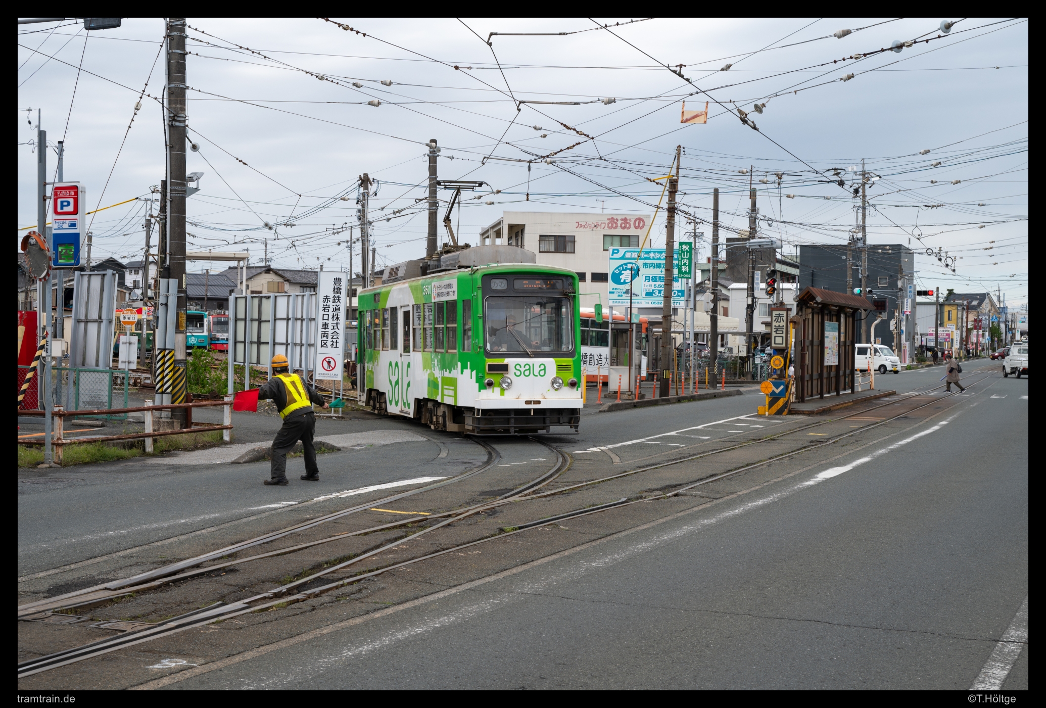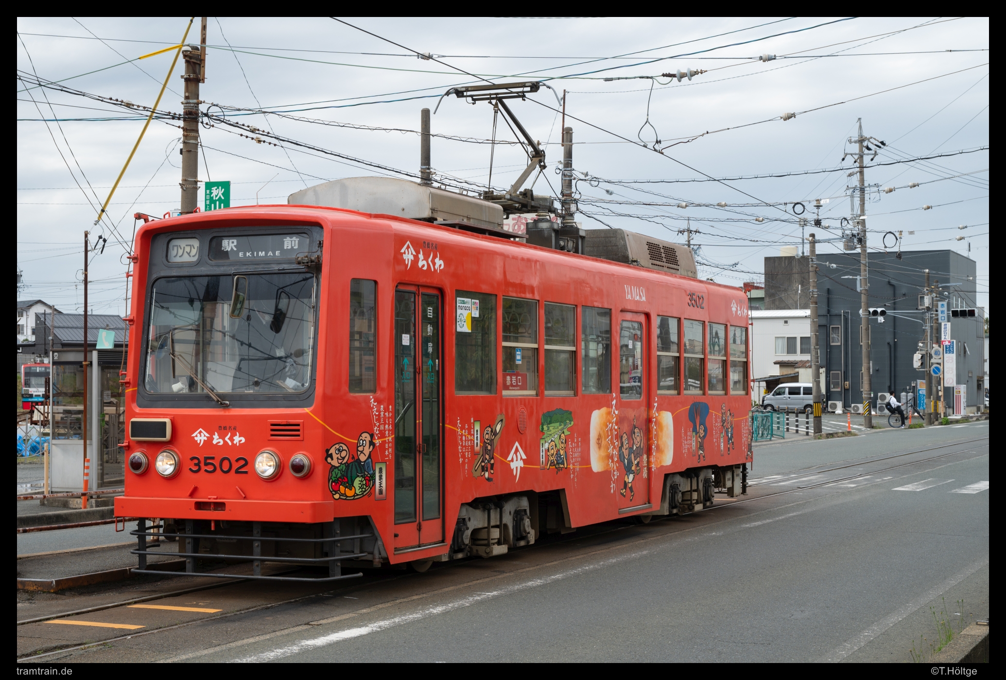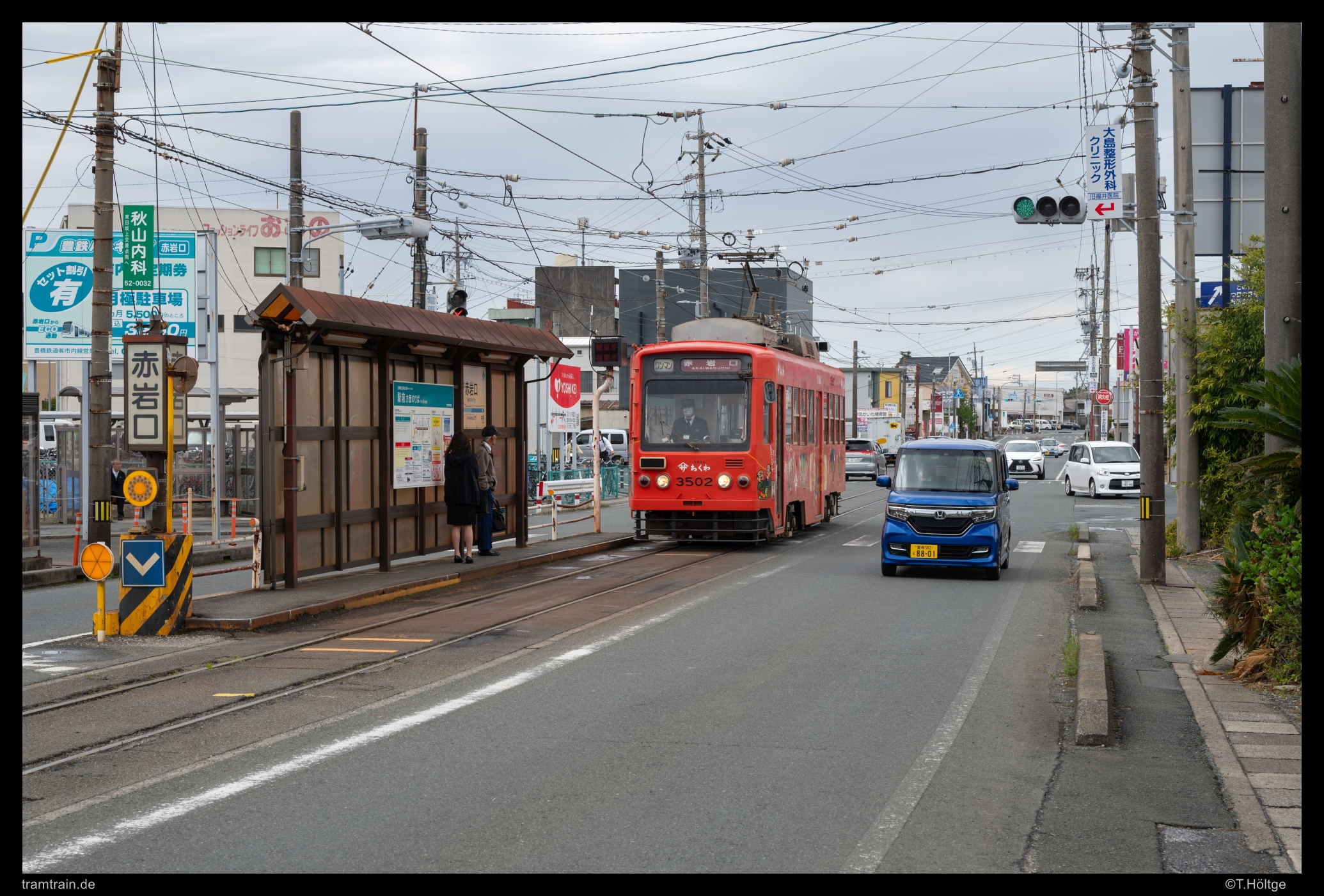Die Endhaltestelle Akaiwaguchi befindet sich unmittelbar neben dem Depot. Mit 3502 erreicht eine weitere Baureihe das Ende der Linie. Den aus Tokyo stammenden Fahrzeugen fehlt eigentlich die dritte Tür, um bei Haltestellen auf der in Fahrtrichtung rechten Seite dennoch das Einsteigen und Zahlen beim Fahrer zu ermöglichen, wie hier an der Endhaltestelle. Gleiches gilt für den Niederflurwagen 1001. Wie das dann bei diesen Wagen funktioniert, wäre eine interessante Frage. Ich kann mich nicht mehr daran erinnern, oder wir sind gar nicht in einem solchen mitgefahren.