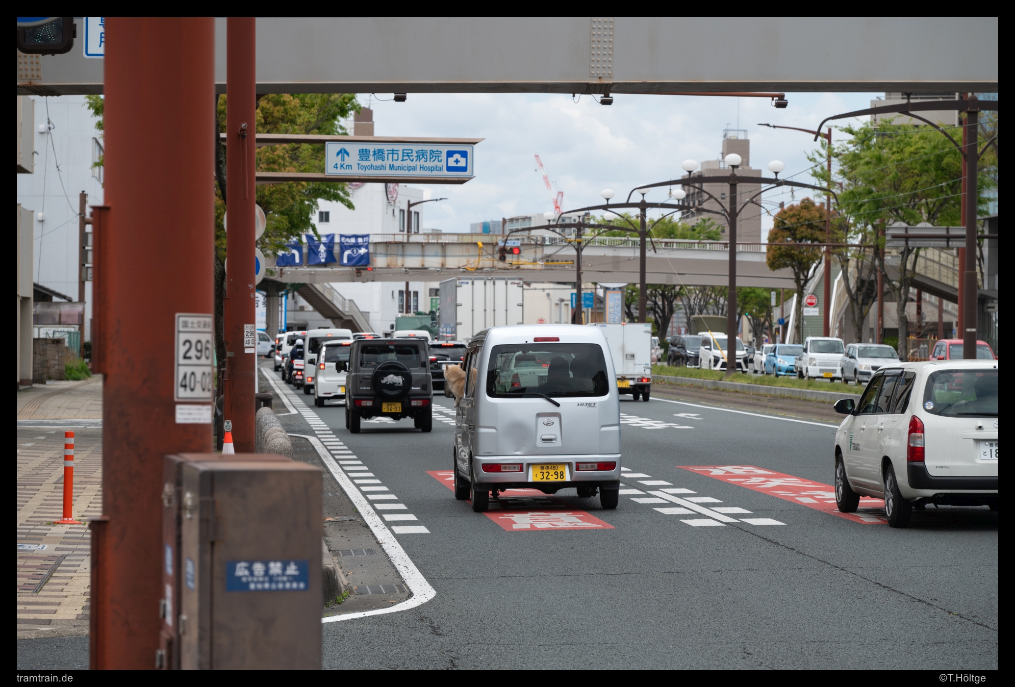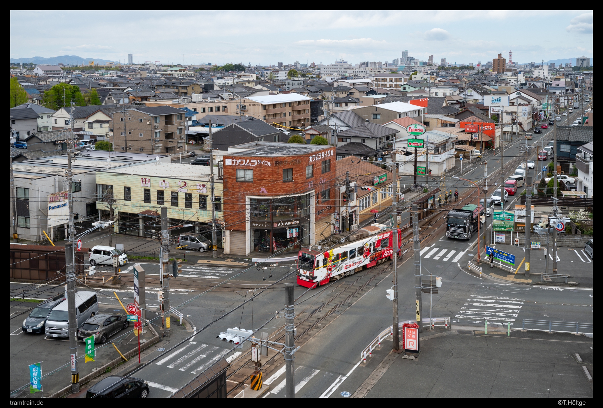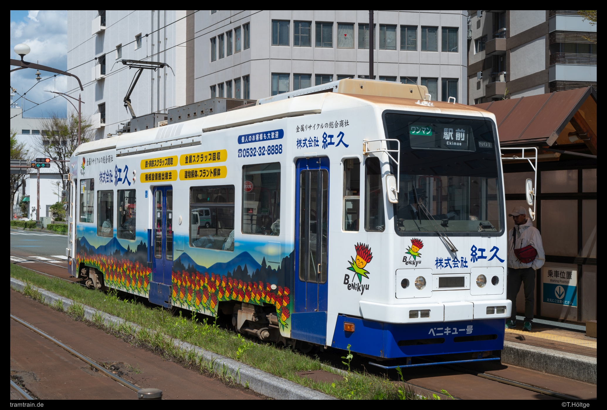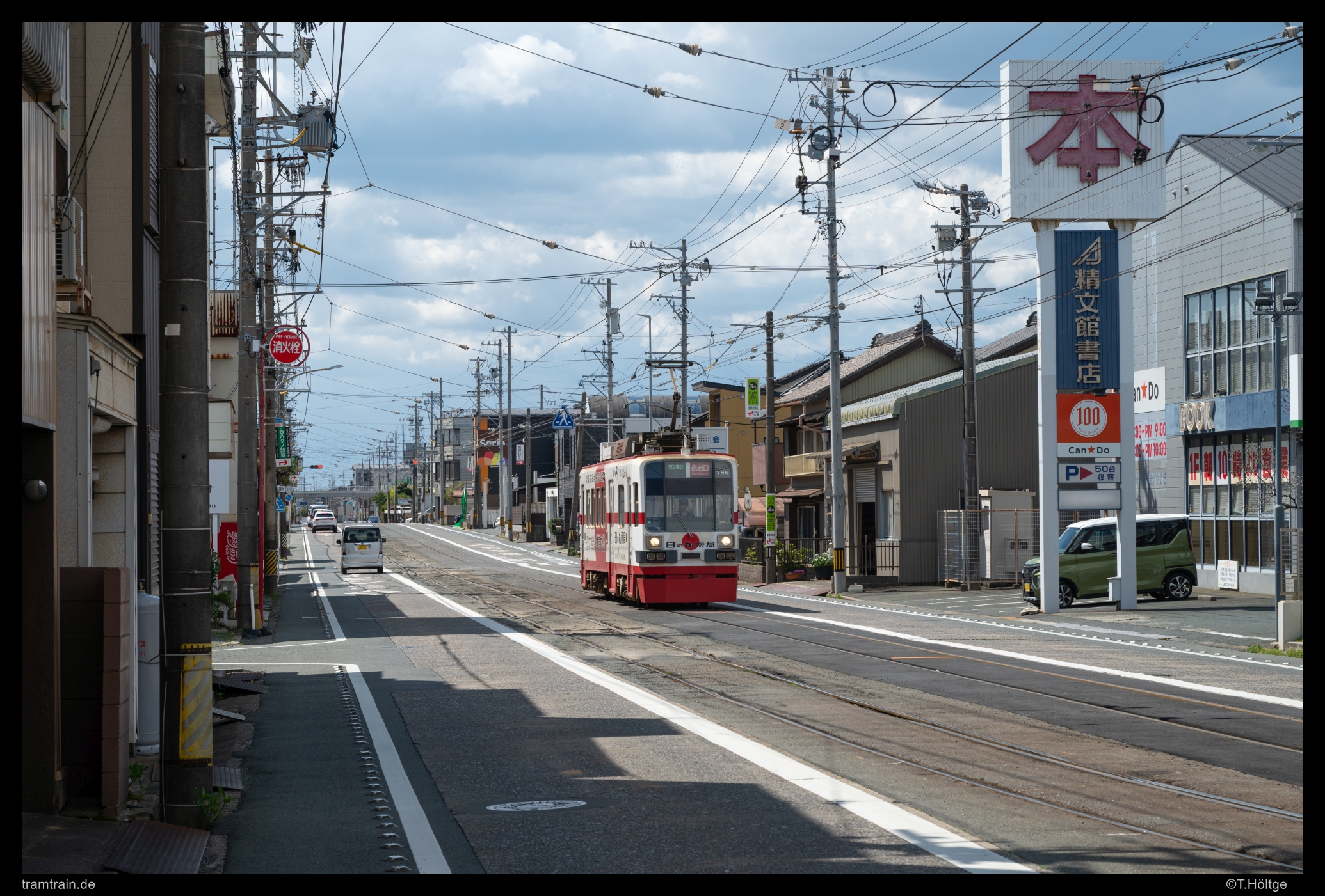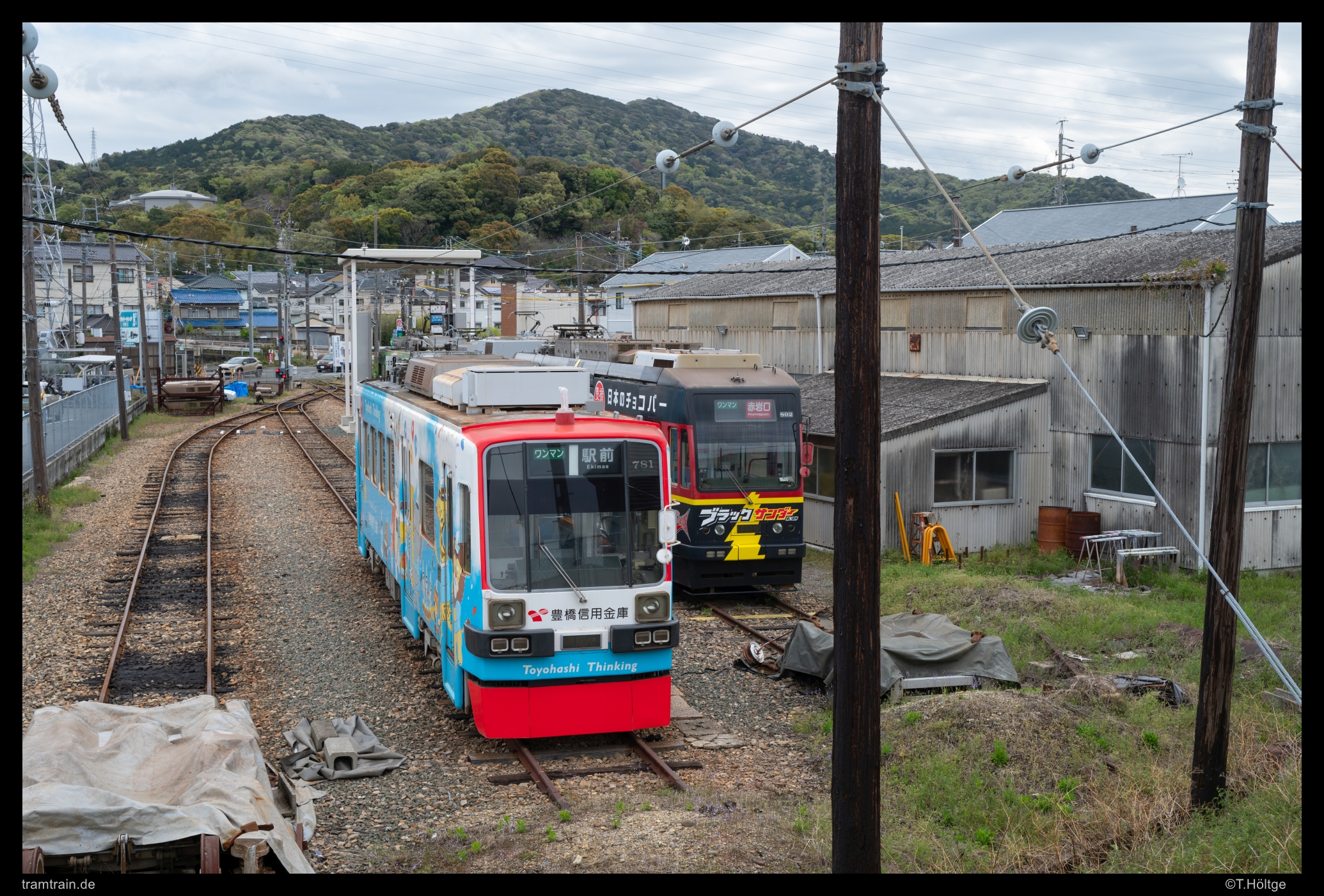 Toyohashi, an der Südküste und etwa auf mittiger Höhe von Honshu, 60km südlich von Nagoya gelegen, gehört zur Präfektur Aichi und zählt etwa 370.000 Einwohner. Selbst für diese Stadtgröße winzig mutet die 1925 eröffnete und heute 5,4 km lange Straßenbahn an. Ausgehend wie so oft vom Bahnhof am Tokaido-Shinkansen und der konventionellen Tokaido-Mainline in der Innenstadt, teilt sich die Strecke auf dem Weg in die östlichen Wohngebiete erst an der vorletzten Haltestelle Ihara. In einem 90-Grad-Winkel knickt hier die Strecke zur Endstation Undokoen-mae nach Süden ab, während geradeaus weiter die Strecke zum Depot an der Haltestelle Akaiwaguchi verläuft. Bemerkenswert an diesem Abzweig ist hauptsächlich der Kurven-Radius von lediglich 11m, womit es sich um die engste Straßenbahnkurve Japans handeln soll. Dies ist wohl auch der Grund, warum der neueste Niederflurwagen – ein dreiteiliger Multigelenker – nur auf der Linie zum Depot nach Akaiwaguchi eingesetzt werden kann.