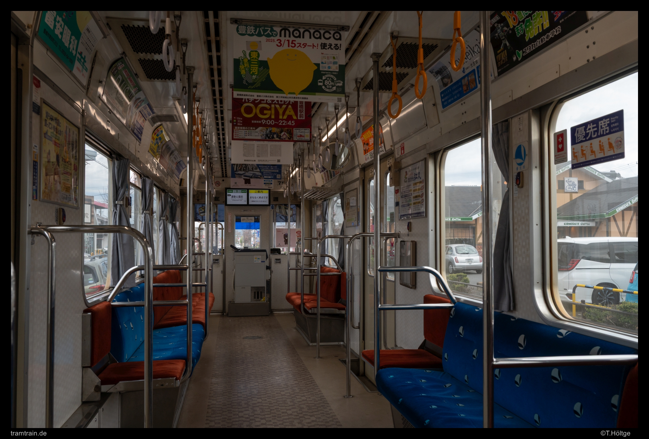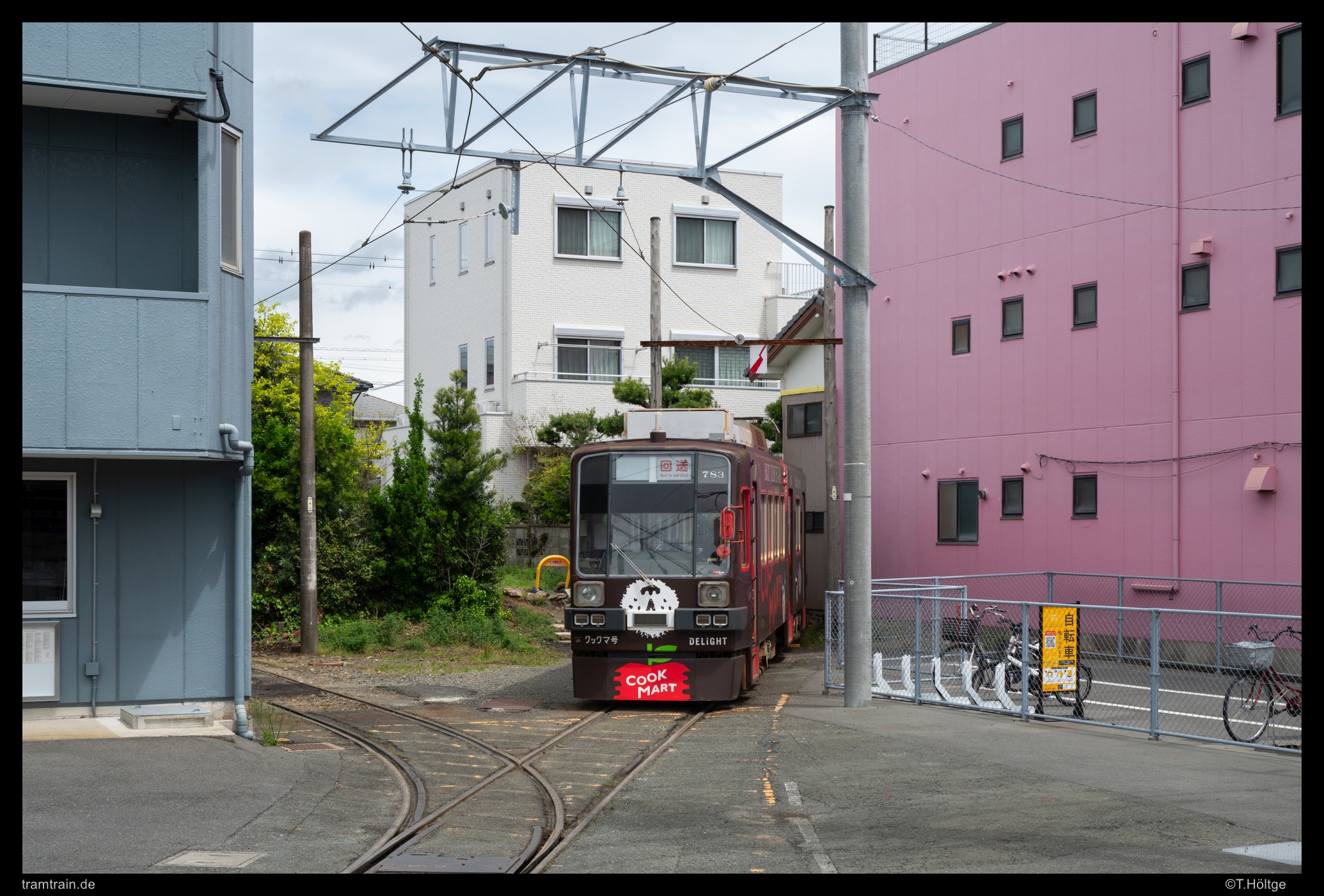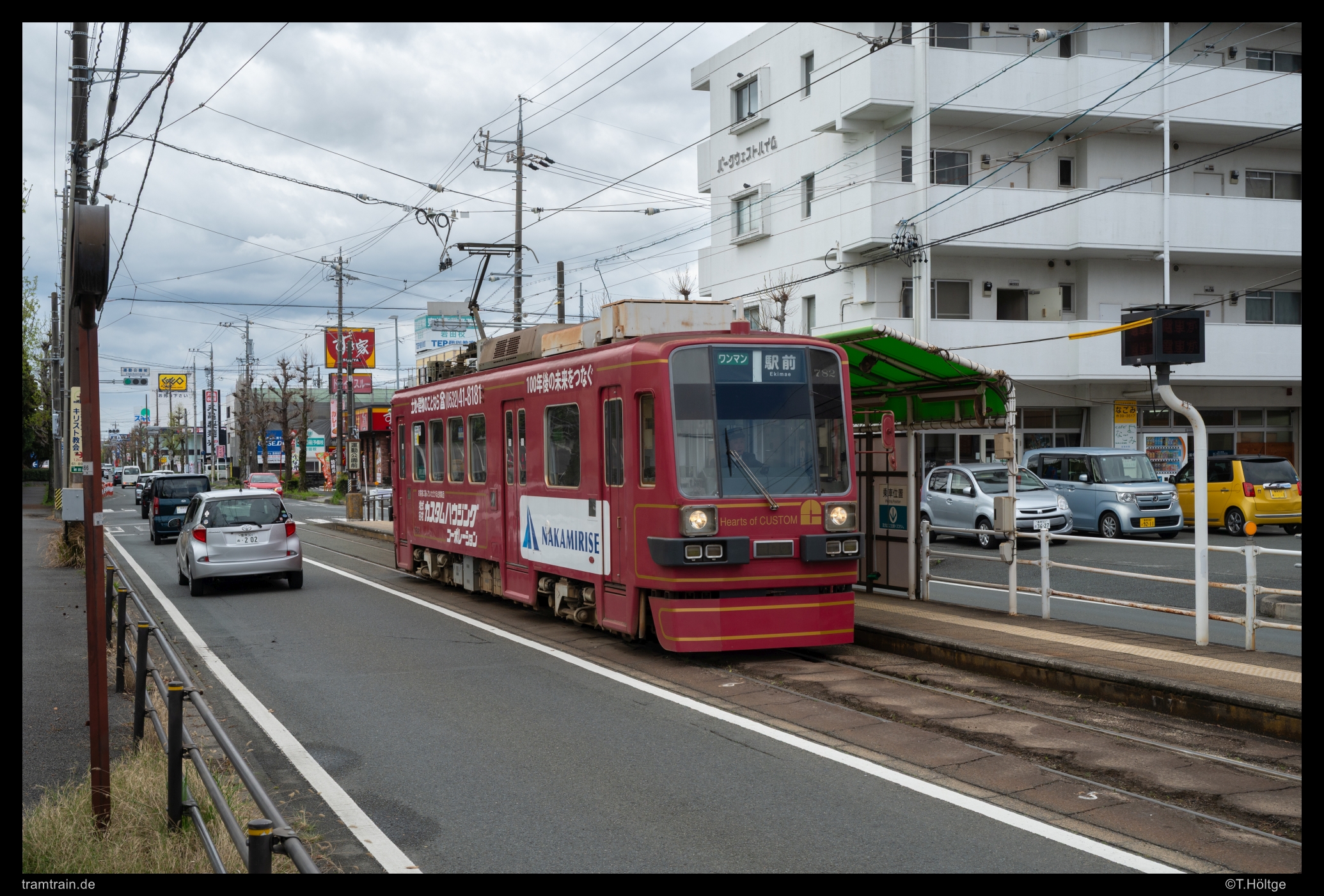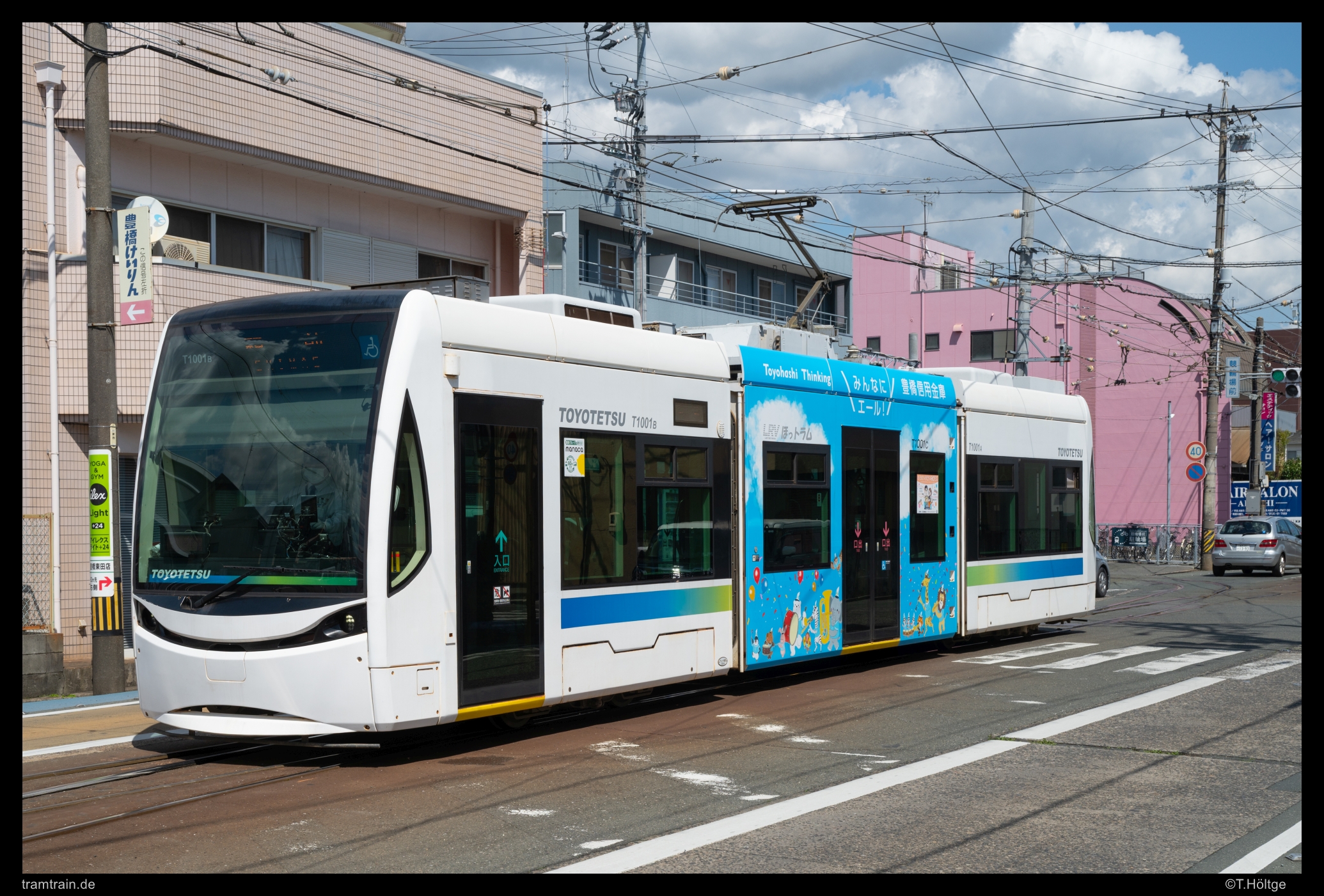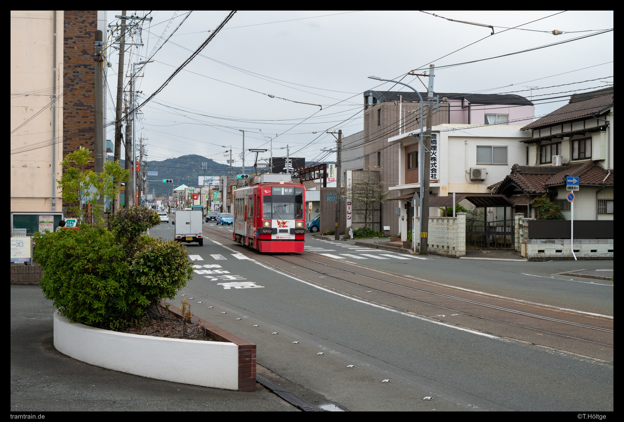 Toyohashi, an der Südküste und etwa auf mittiger Höhe von Honshu, 60km südlich von Nagoya gelegen, gehört zur Präfektur Aichi und zählt etwa 370.000 Einwohner. Selbst für diese Stadtgröße winzig mutet die 1925 eröffnete und heute 5,4 km lange Straßenbahn an. Ausgehend wie so oft vom Bahnhof am Tokaido-Shinkansen und der konventionellen Tokaido-Mainline in der Innenstadt, teilt sich die Strecke auf dem Weg in die östlichen Wohngebiete erst an der vorletzten Haltestelle Ihara. In einem 90-Grad-Winkel knickt hier die Strecke zur Endstation Undokoen-mae nach Süden ab, während geradeaus weiter die Strecke zum Depot an der Haltestelle Akaiwaguchi verläuft. Bemerkenswert an diesem Abzweig ist hauptsächlich der Kurven-Radius von lediglich 11m, womit es sich um die engste Straßenbahnkurve Japans handeln soll. Dies ist wohl auch der Grund, warum der neueste Niederflurwagen – ein dreiteiliger Multigelenker – nur auf der Linie zum Depot nach Akaiwaguchi eingesetzt werden kann.
