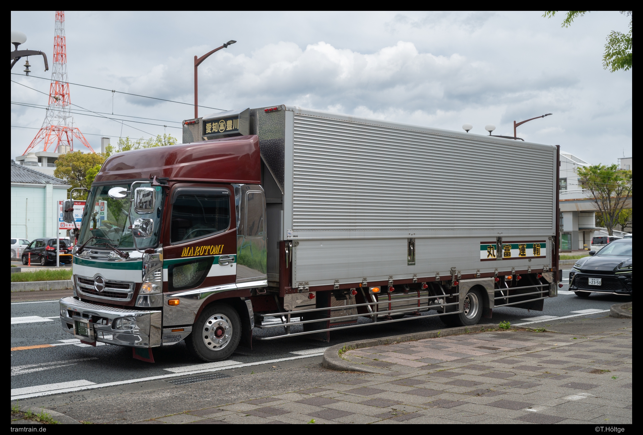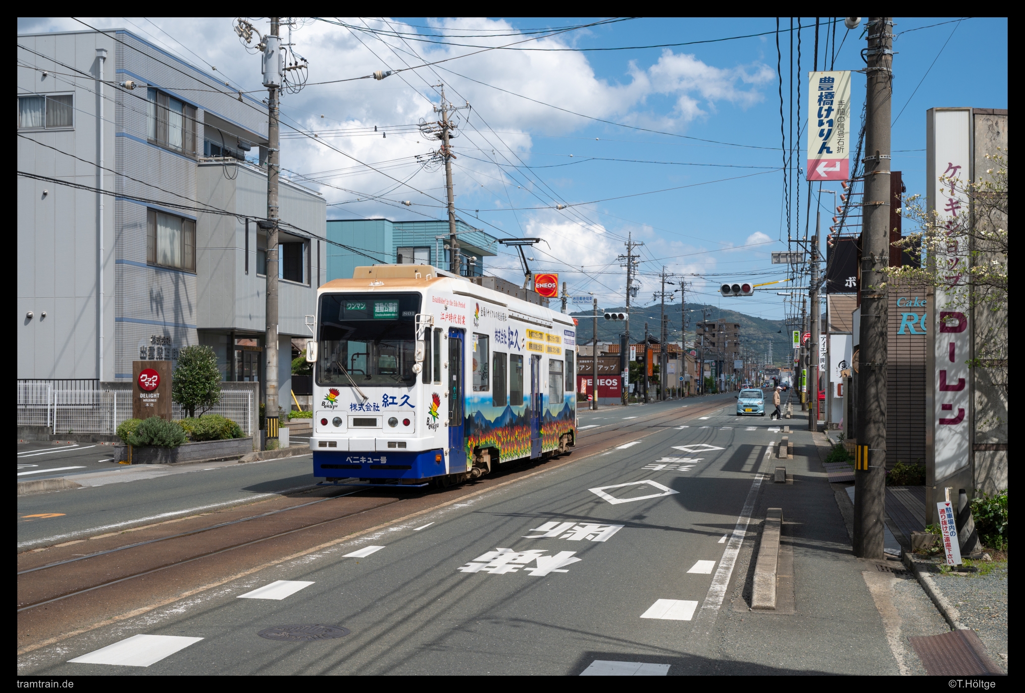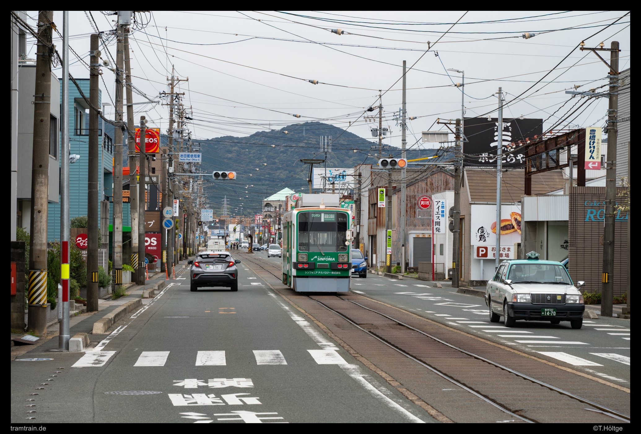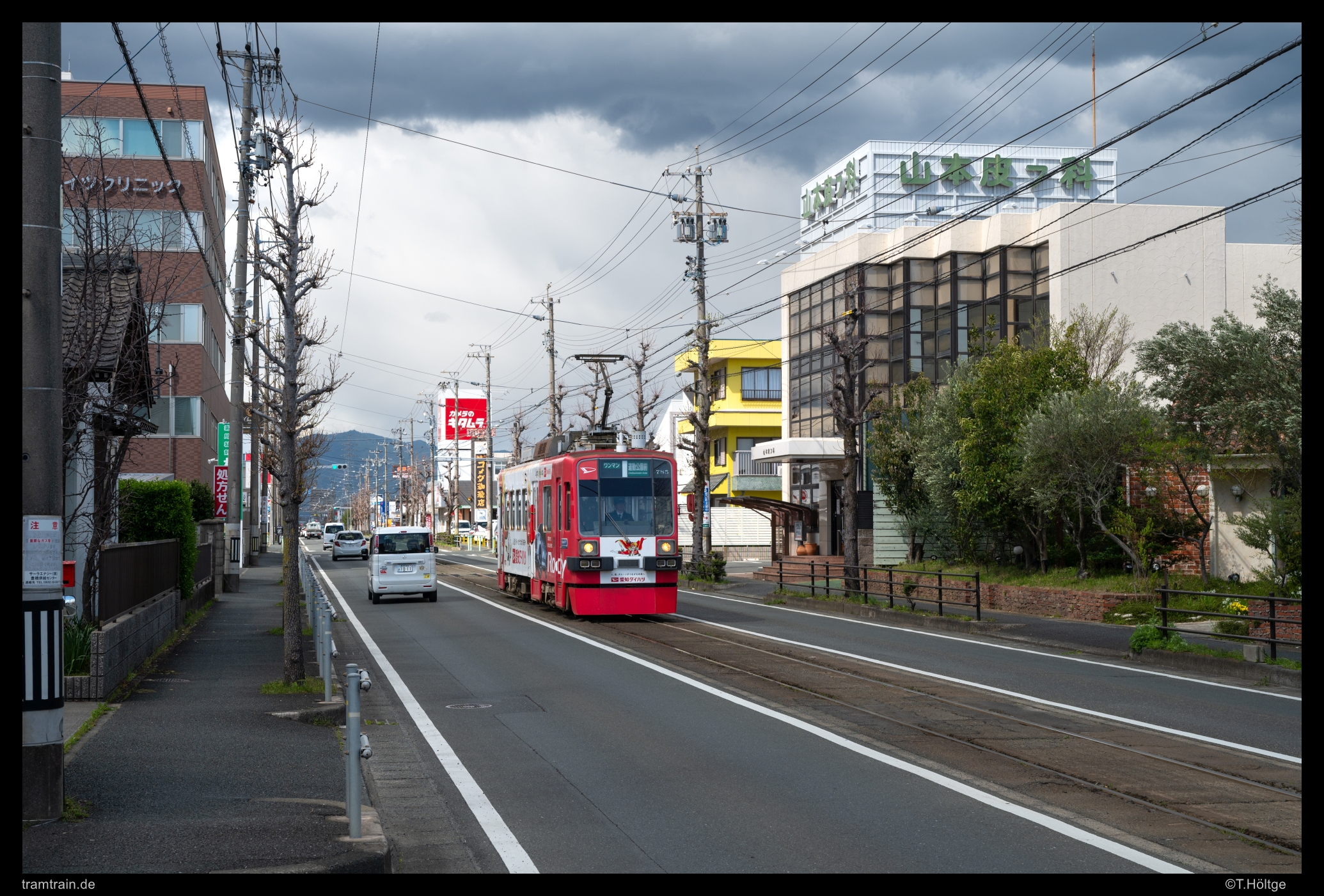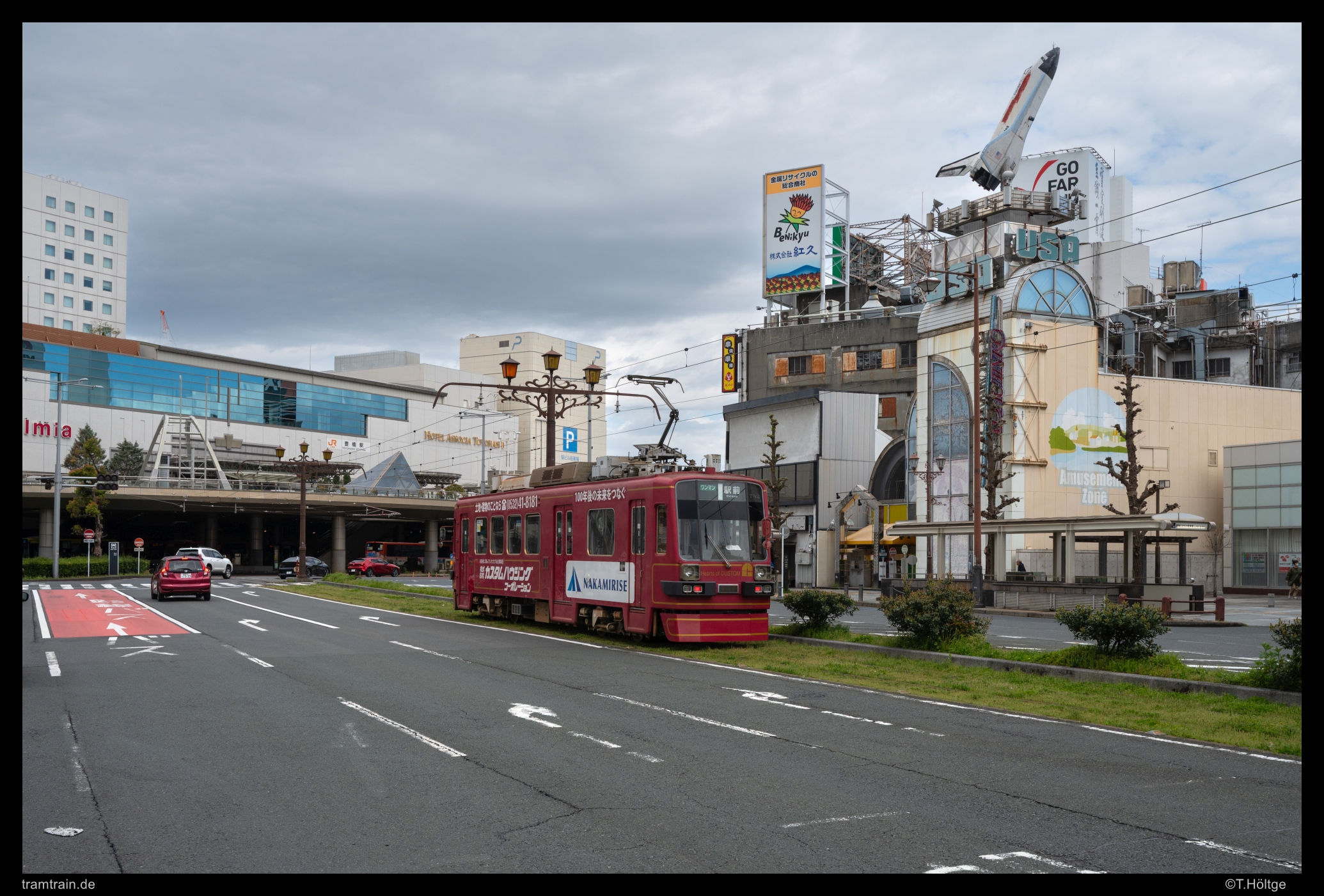 Toyohashi, an der Südküste und etwa auf mittiger Höhe von Honshu, 60km südlich von Nagoya gelegen, gehört zur Präfektur Aichi und zählt etwa 370.000 Einwohner. Selbst für diese Stadtgröße winzig mutet die 1925 eröffnete und heute 5,4 km lange Straßenbahn an. Ausgehend wie so oft vom Bahnhof am Tokaido-Shinkansen und der konventionellen Tokaido-Mainline in der Innenstadt, teilt sich die Strecke auf dem Weg in die östlichen Wohngebiete erst an der vorletzten Haltestelle Ihara. In einem 90-Grad-Winkel knickt hier die Strecke zur Endstation Undokoen-mae nach Süden ab, während geradeaus weiter die Strecke zum Depot an der Haltestelle Akaiwaguchi verläuft. Bemerkenswert an diesem Abzweig ist hauptsächlich der Kurven-Radius von lediglich 11m, womit es sich um die engste Straßenbahnkurve Japans handeln soll. Dies ist wohl auch der Grund, warum der neueste Niederflurwagen – ein dreiteiliger Multigelenker – nur auf der Linie zum Depot nach Akaiwaguchi eingesetzt werden kann.