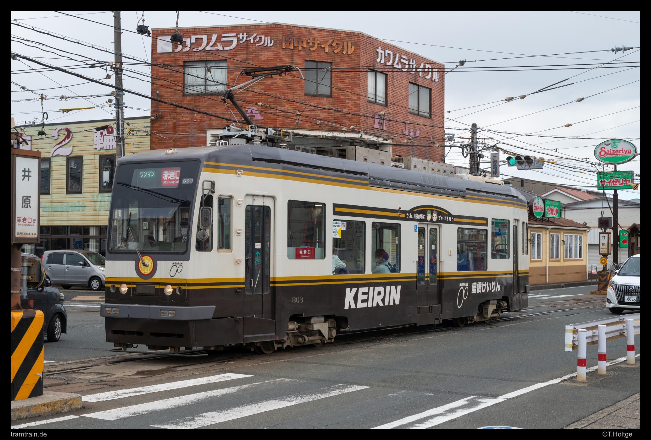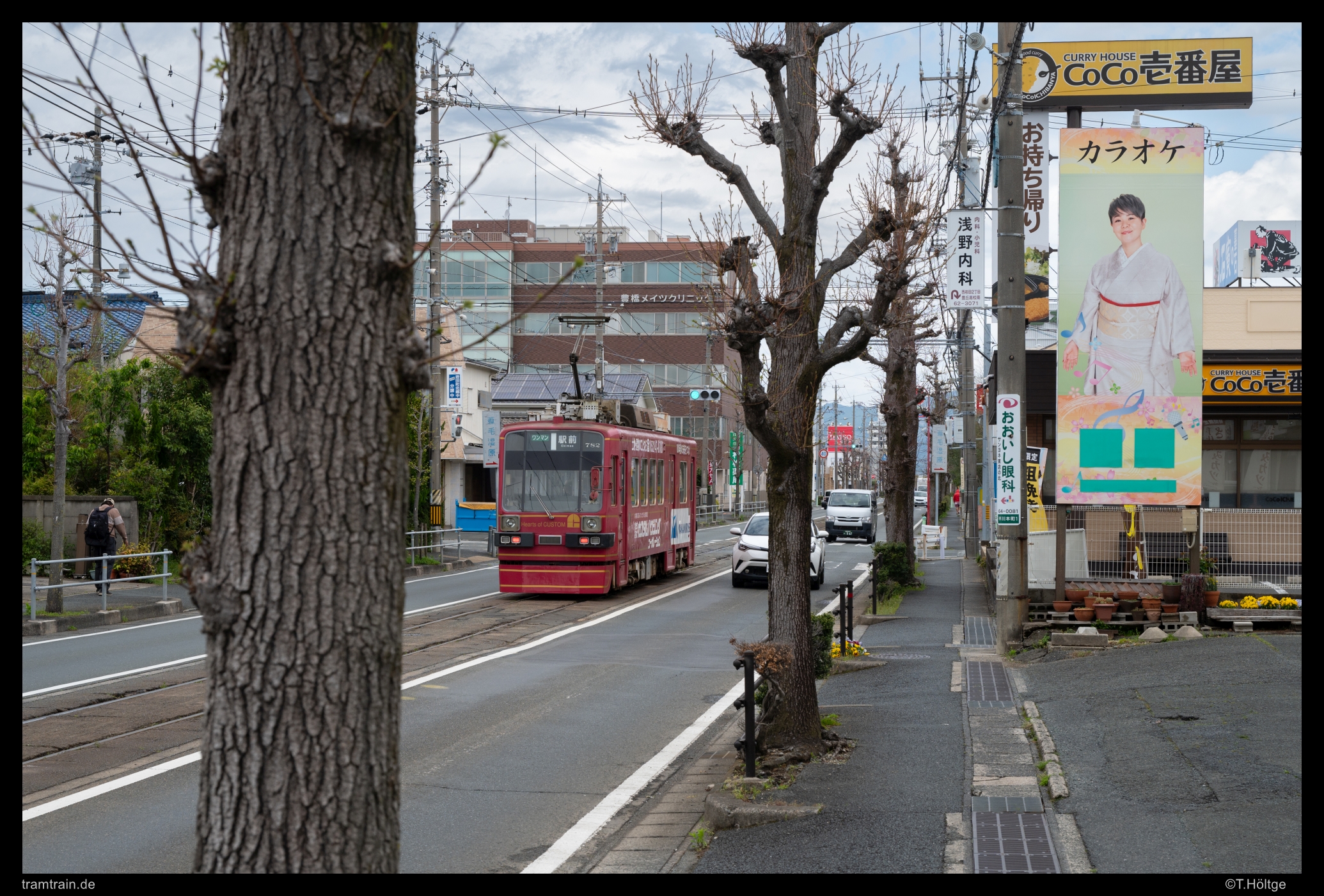 War ziemlich windig und frisch hier oben, schnell wieder runter. Wir liefen anschließend den eingleisigen Abschnitt vom Abzweig weiter stadteinwärts bis zur nächsten Haltestelle Keirinjo-mae, ab der es dann durchgehend zweigleisig wird. Hier befinden sich auch zwei kürzest mögliche Abstellgleise, in die jeweils soeben einer der kleinen Vierachser passt. Alles nicht unbedingt DIE Motive und schön im eigentlichen Sinne hier, aber es sah wenigstens mal anders aus, als sonst auf den breiten Boulevards. Eingleisig in Mittellage zwischen niedriger Bebauung.
