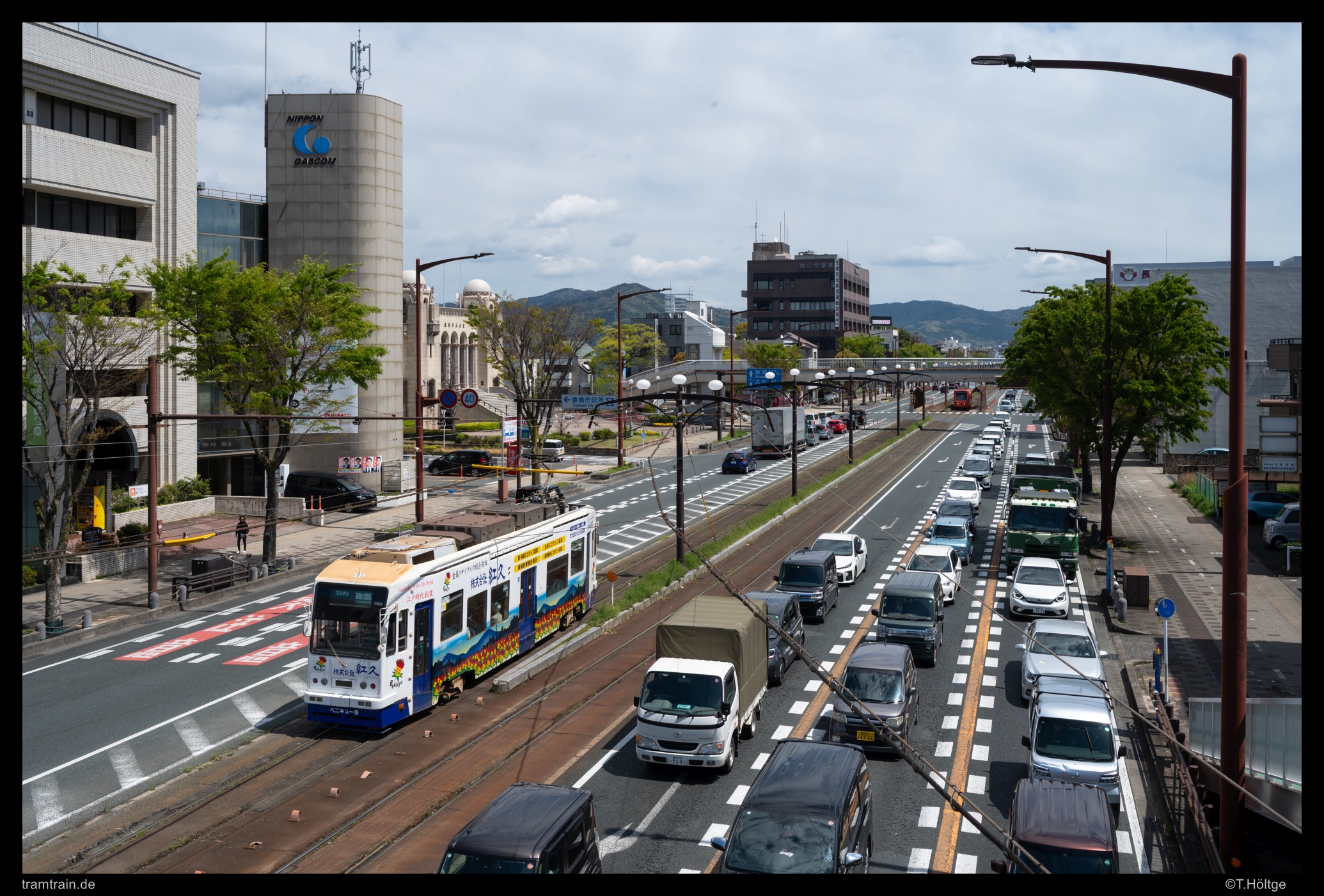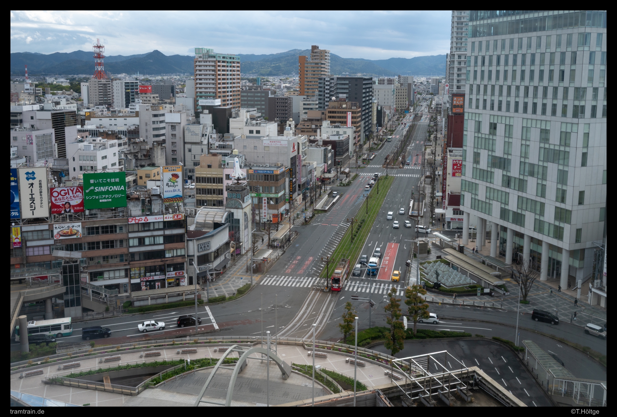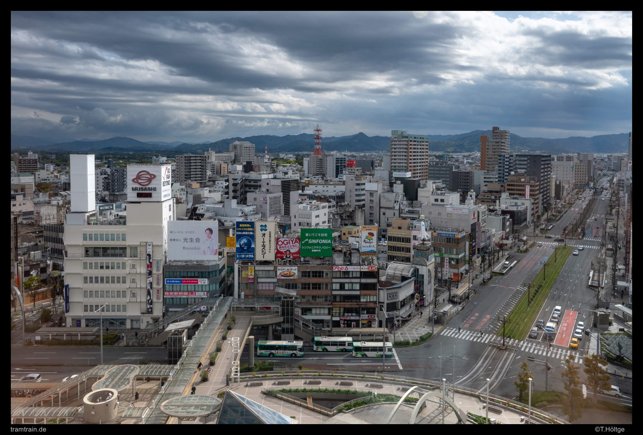 Der Wolkenmix kreiert am Morgen eine spannende Lichtstimmung über der Stadt. Es ist das typische japanische Großstadtbild. Auch Toyohashis Innenstadt wurde im 2. Weltkrieg zu 60% zerstört und hinterher mehr oder weniger komplett neu hochgezogen, die Straßenbahn dabei auf den üblichen breiten Boulevards in Straßenmitte neutrassiert.