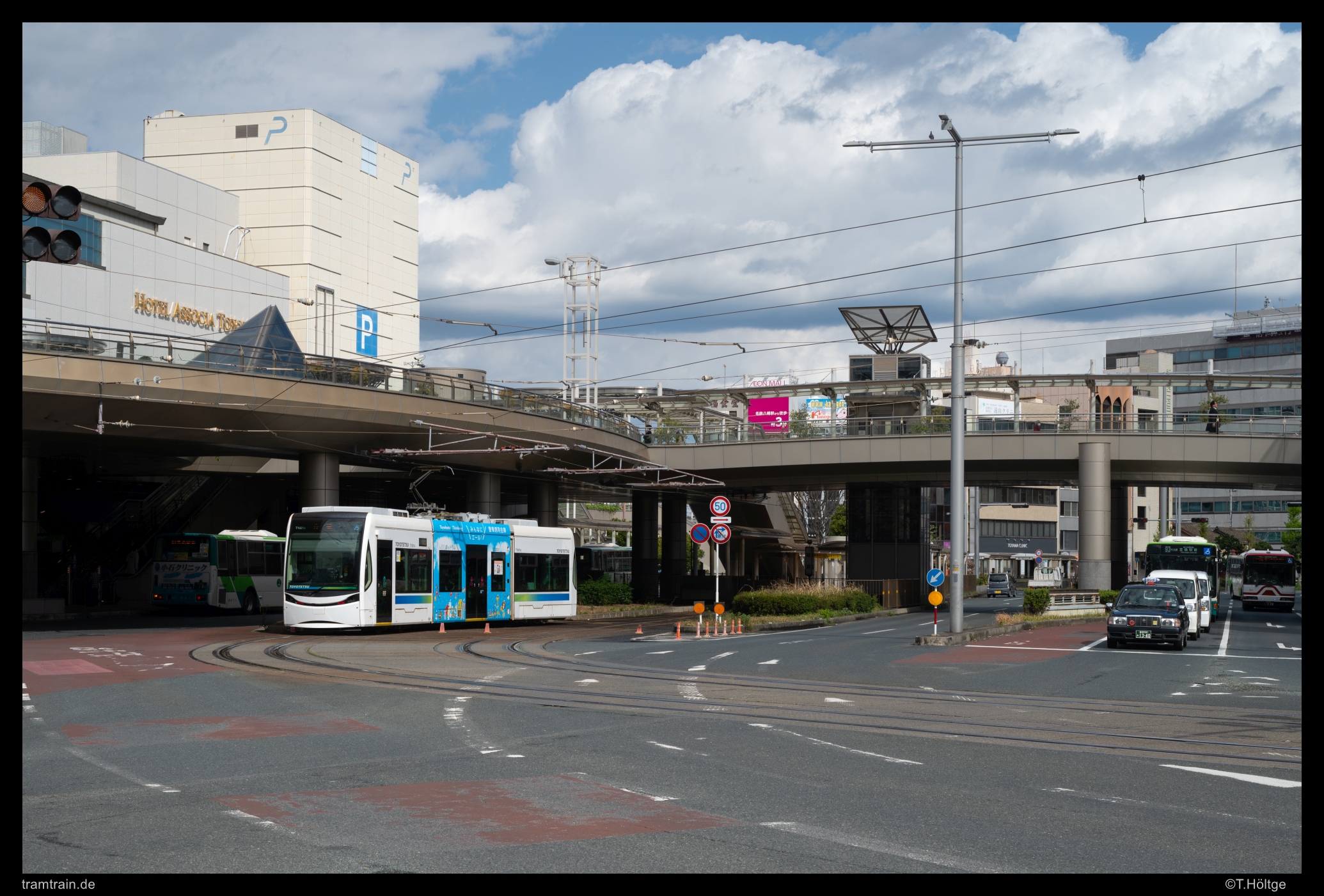 Mo1000: Check! Der bislang einzige Wagen dieser Niederflurbaureihe in Toyohashi fährt hier in die Endhaltestelle unter dem Bahnhofsvorbau ein.