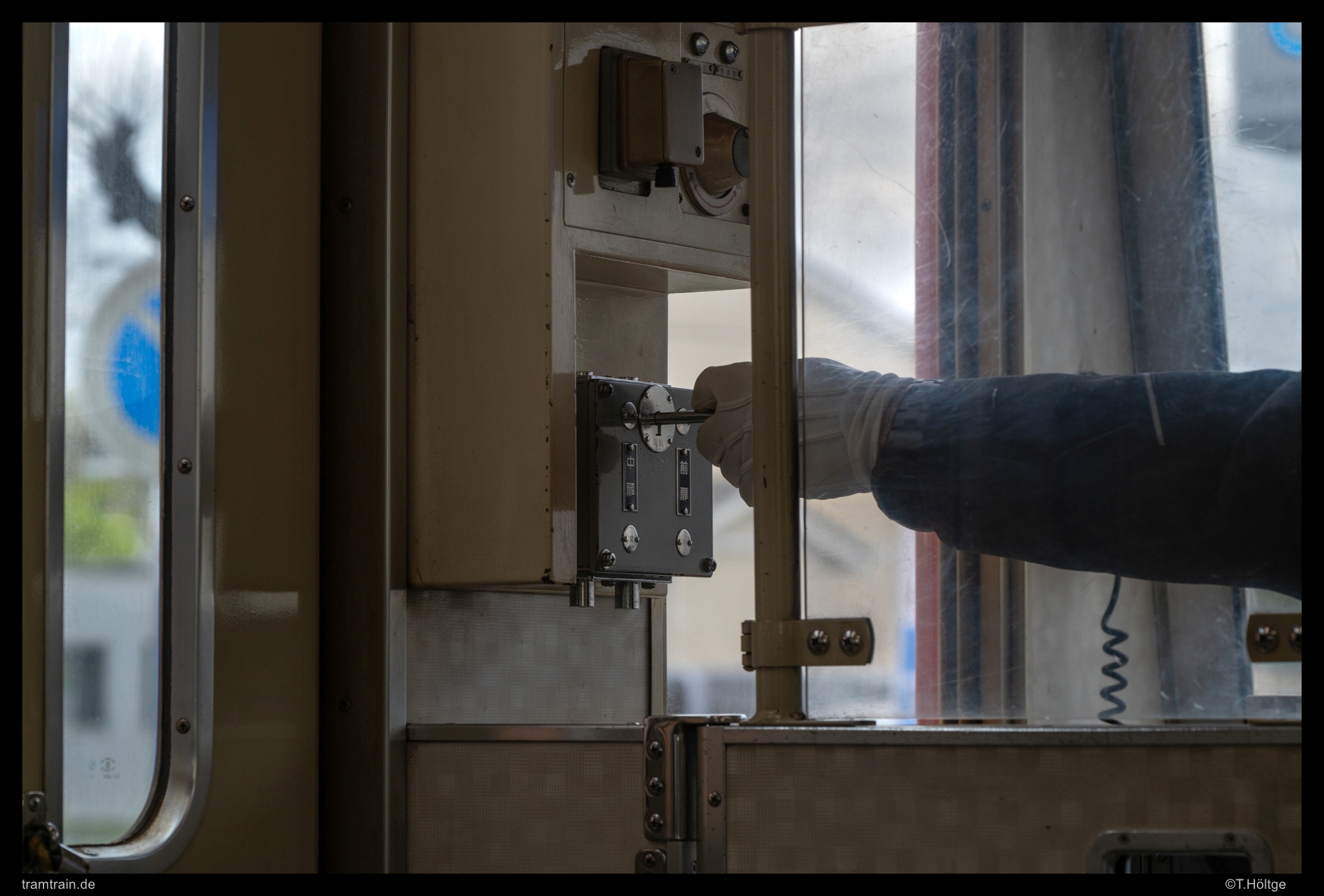 Die Türen werden bei den Mo780 durch das “Schlüsseln” des Fahrers geöffnet und geschlossen: Wagen hält an, Fahrer steckt den Schlüssel in den Kasten und dreht ihn um, drückt den gewünschten der beiden Taster unter dem Kasten ein – hier der linke für die Mitteltür und der rechte für die Fronttür – Tür öffnet sich. Wenn der Schlüssel zurückgedreht und gezogen wird, schließt sich die Tür wieder. Den Kasten gibt es jeweils einmal rechts und links im Fahrerstand für die entsprechende Fahrzeugseite, da es in den eingleisigen Bereichen Haltestellen mit Bahnsteigen auf der “falschen” Seite gibt. Irgendwie wurden schon einfachere Lösungen zum Öffnen und Schließen von Fahrzeugtüren erfunden…